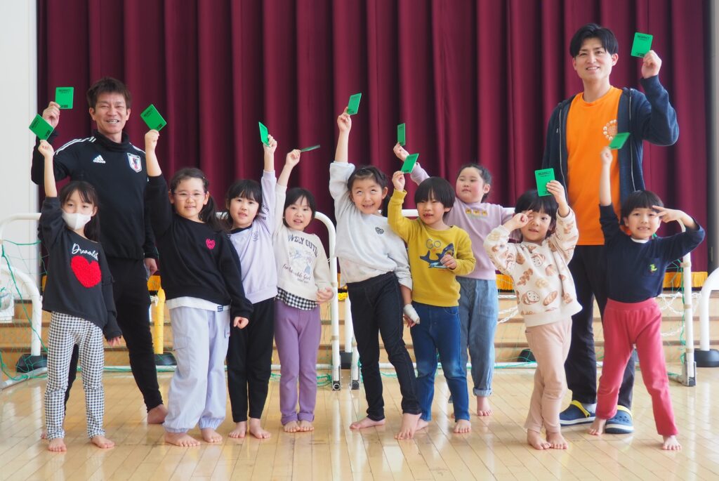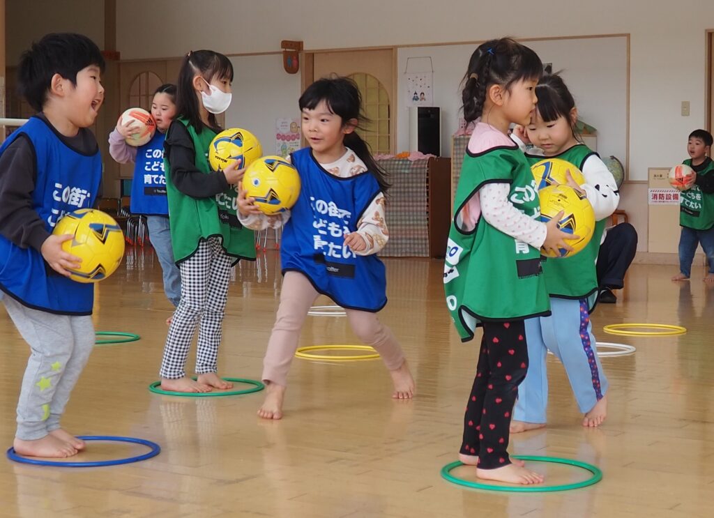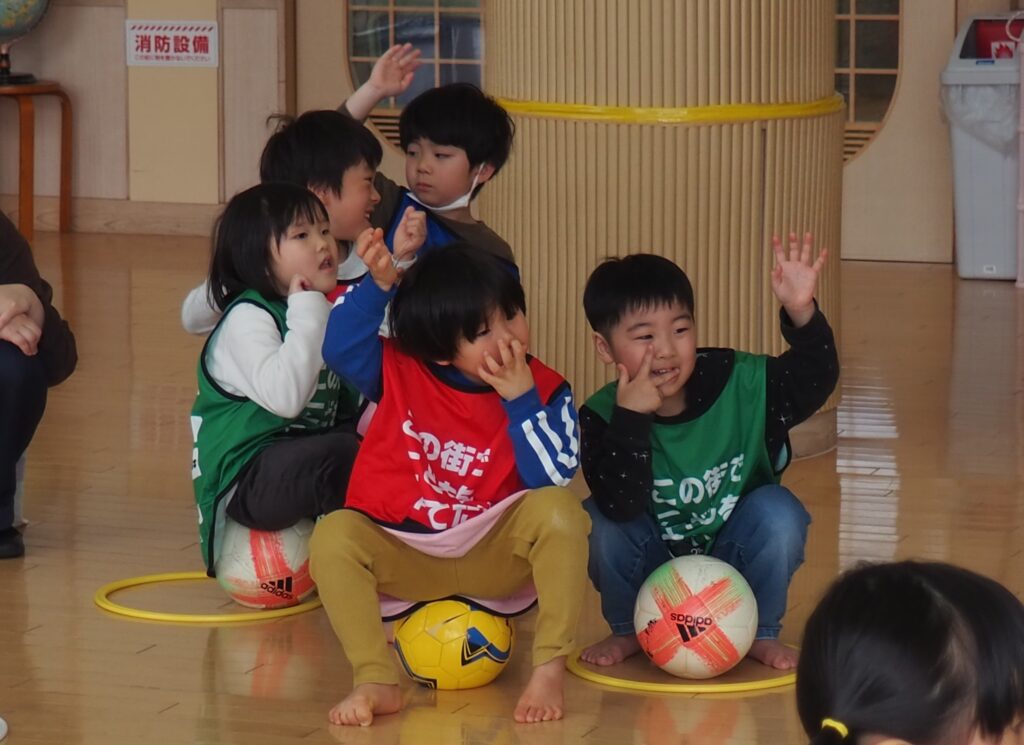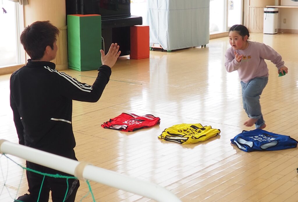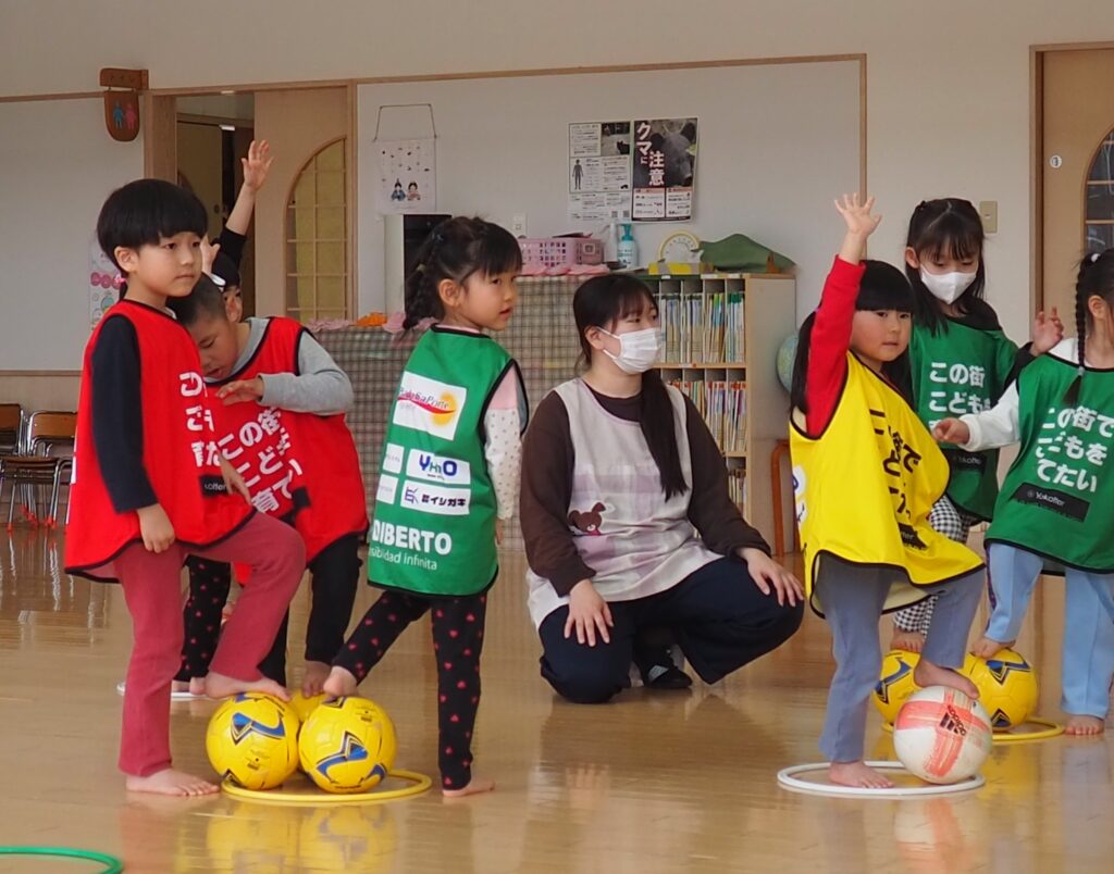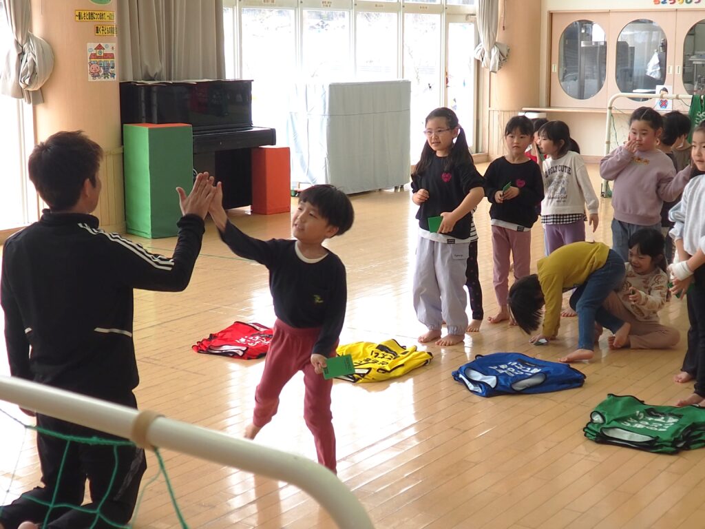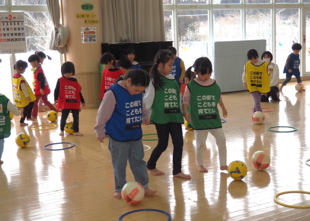3~5歳児が「ボール遊び教室Part5」で汗を流しました。講師は県サッカー協会の佐藤コーチです。寒さに負けず元気に身体を動かして遊べるよう、毎年この時季に開催しております。子どもたちが毎回楽しみにしている教室も、とうとう今日が最終日となってしまいました。佐藤コーチの主導のもと、主体性と社会性の育ちにつながる活動は有意義な時間となりました。また、子ども達はグリーンカードを手にすることで、大きな自信となりました。