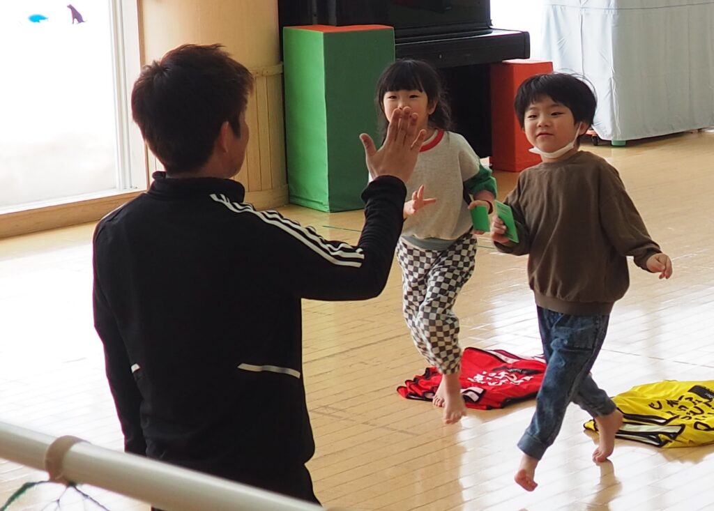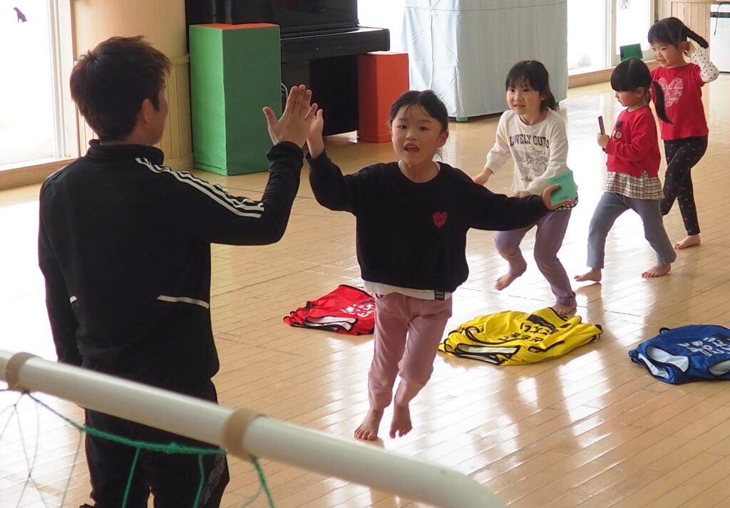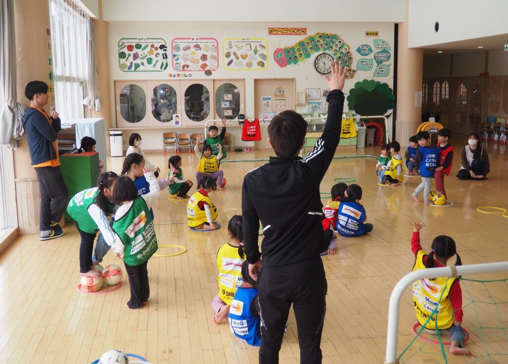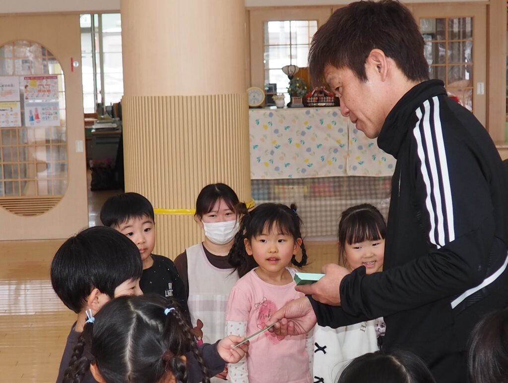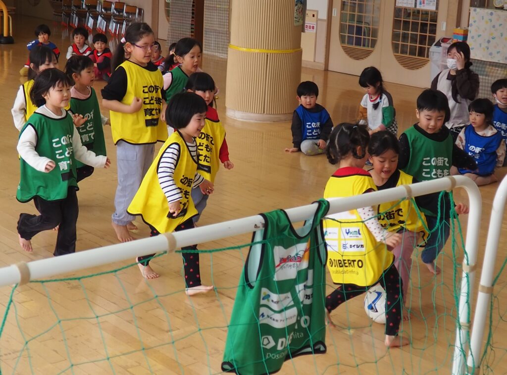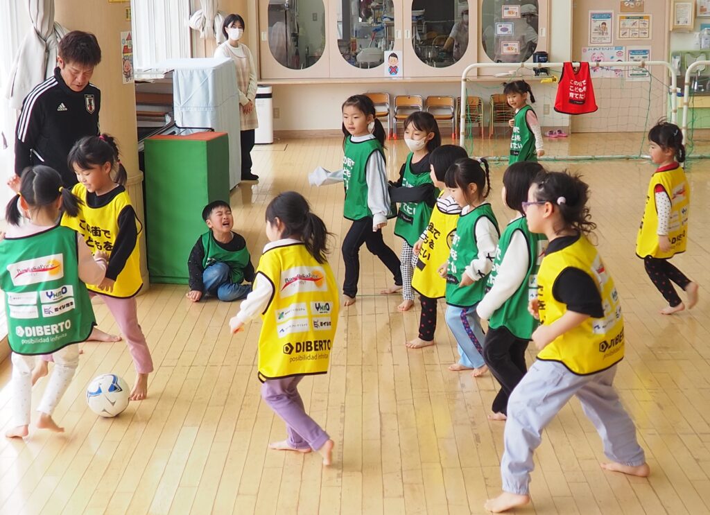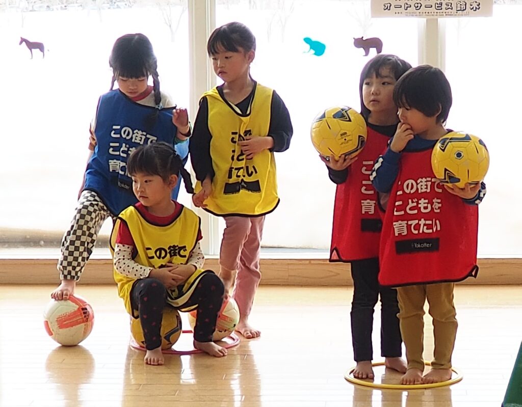 3~5歳児が「ボール遊び教室Part5」で汗を流しました。講師は県サッカー協会の佐藤コーチです。寒さに負けず元気に身体を動かして遊べるよう、毎年この時季に開催しております。子どもたちが毎回楽しみにしている教室も、とうとう今日が最終日となってしまいました。佐藤コーチの主導のもと、主体性と社会性の育ちにつながる活動は有意義な時間となりました。また、子ども達はグリーンカードを手にすることで、大きな自信となりました。