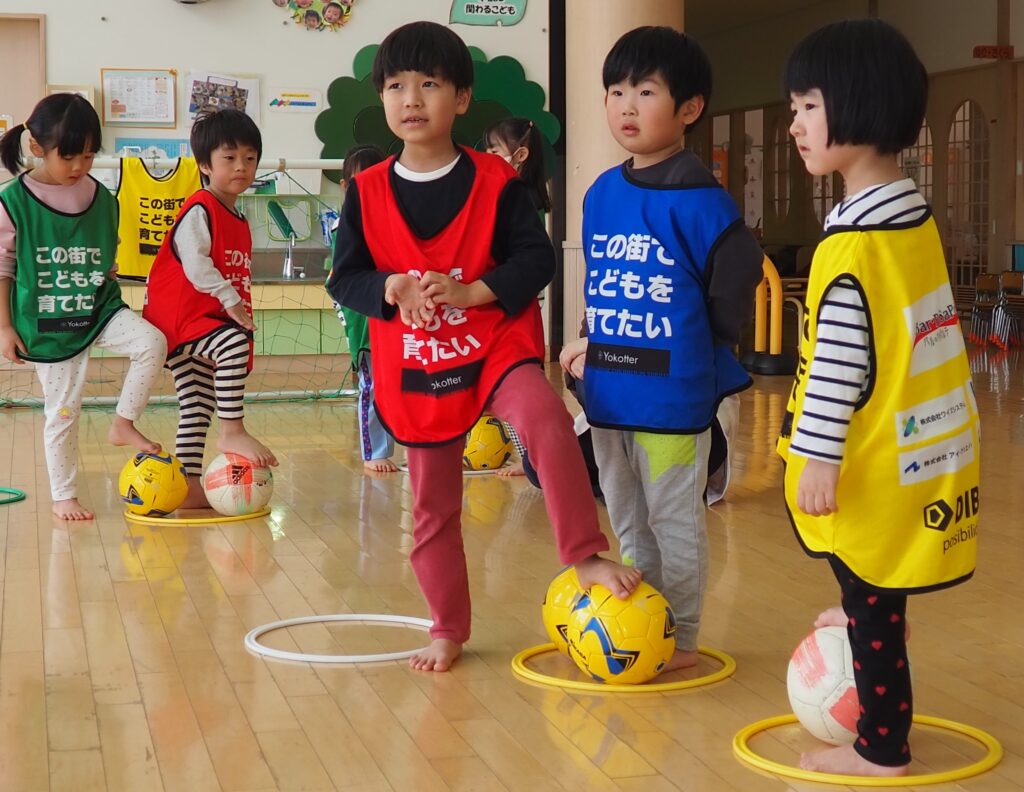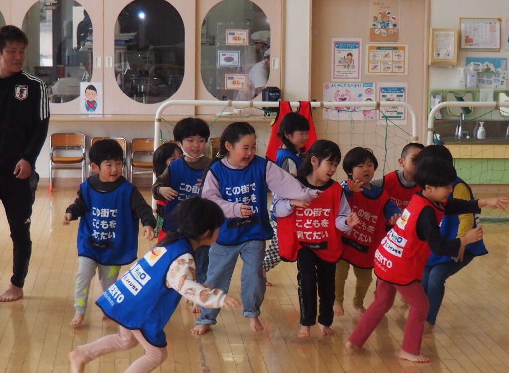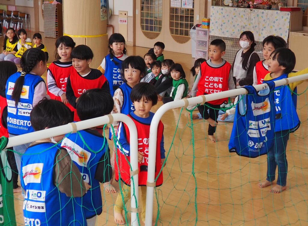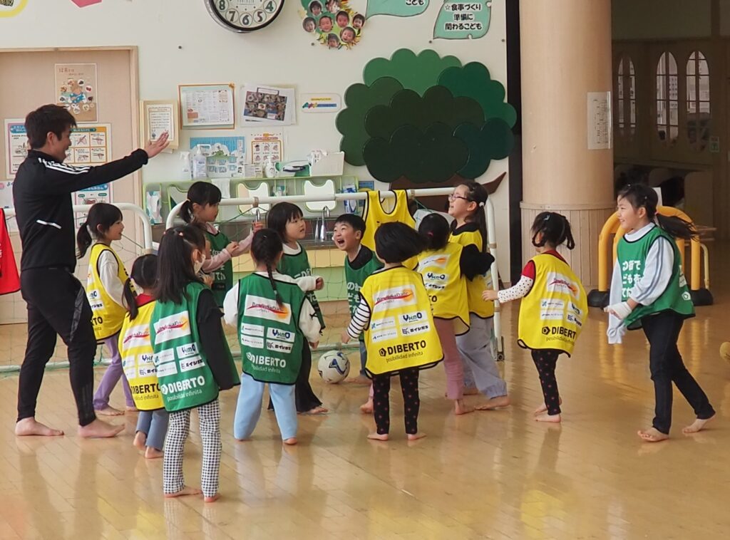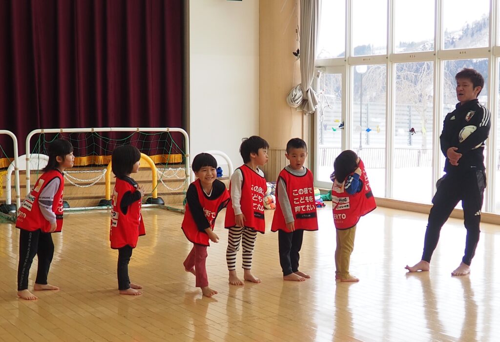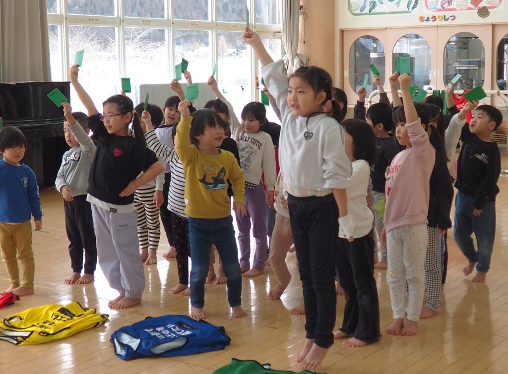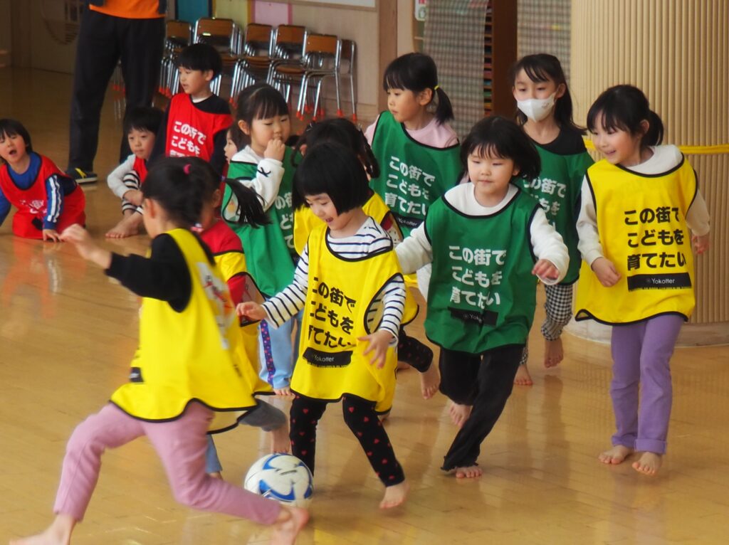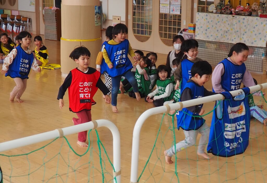 3~5歳児が「ボール遊び教室Part5」で汗を流しました。講師は県サッカー協会の佐藤コーチです。寒さに負けず元気に身体を動かして遊べるよう、毎年この時季に開催しております。子どもたちが毎回楽しみにしている教室も、とうとう今日が最終日となってしまいました。佐藤コーチの主導のもと、主体性と社会性の育ちにつながる活動は有意義な時間となりました。また、子ども達はグリーンカードを手にすることで、大きな自信となりました。