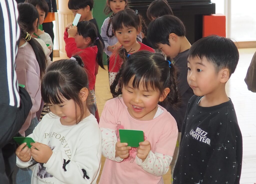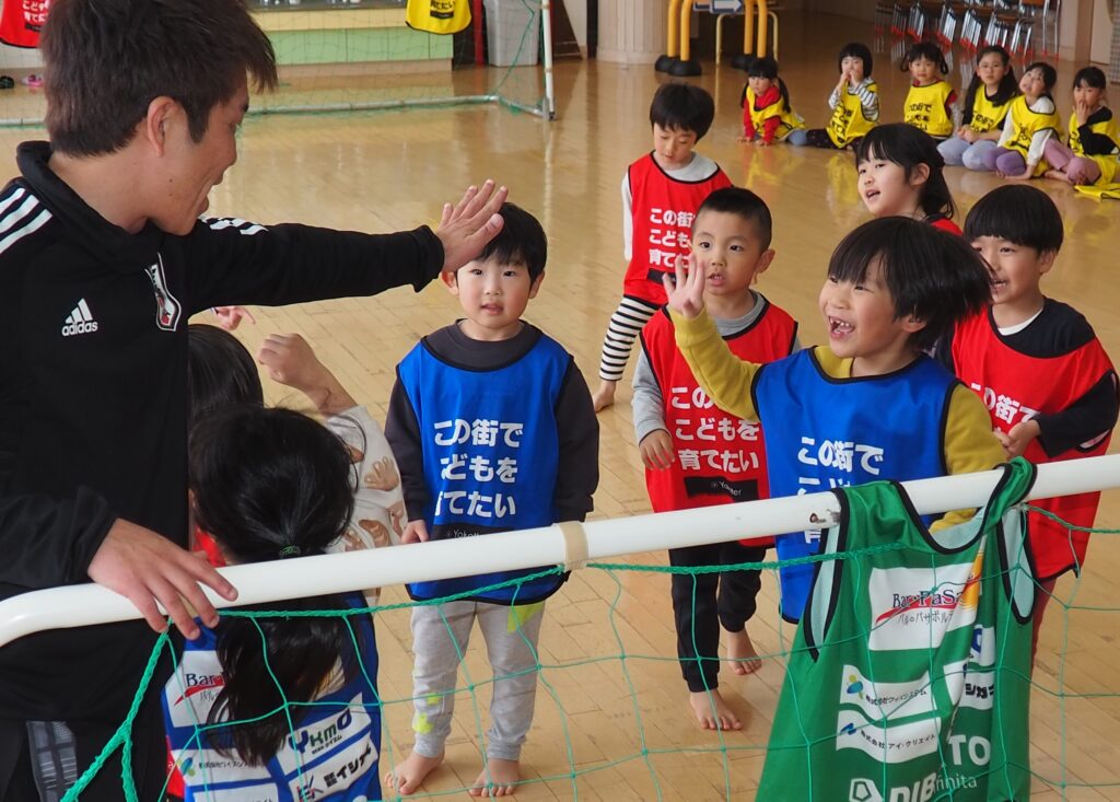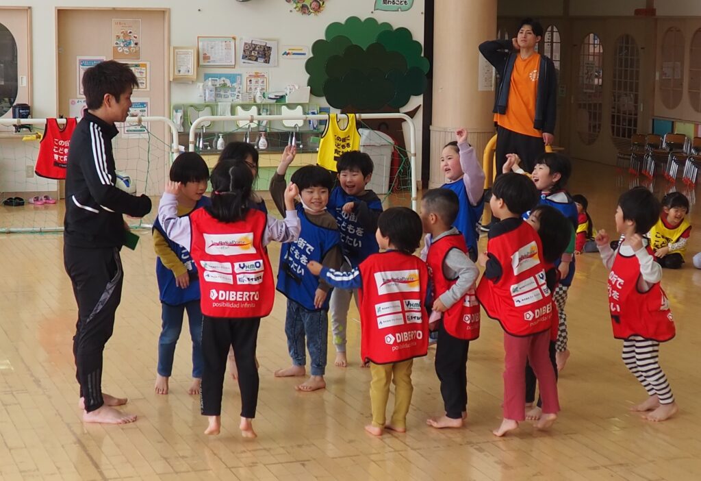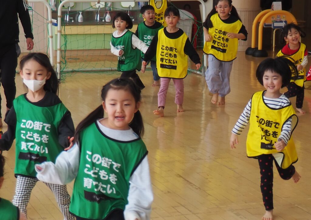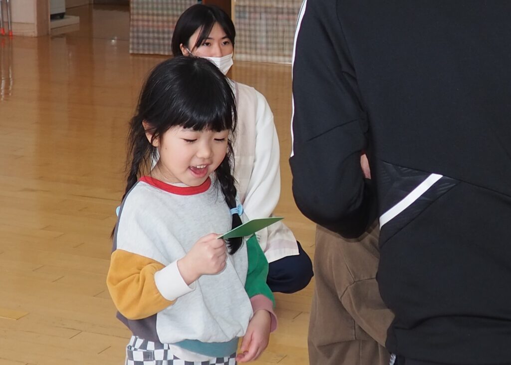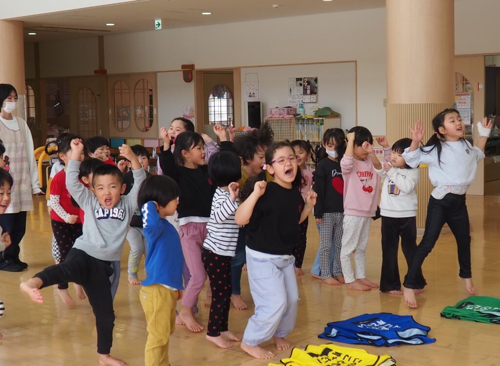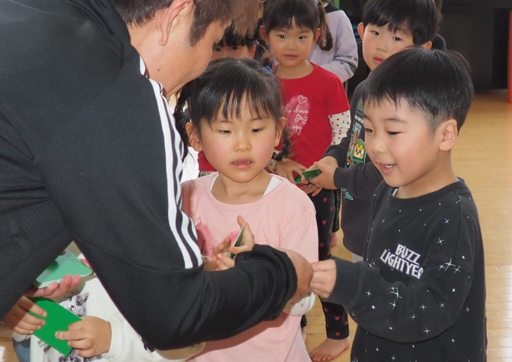 3~5歳児が「ボール遊び教室Part5」で汗を流しました。講師は県サッカー協会の佐藤コーチです。寒さに負けず元気に身体を動かして遊べるよう、毎年この時季に開催しております。子どもたちが毎回楽しみにしている教室も、とうとう今日が最終日となってしまいました。佐藤コーチの主導のもと、主体性と社会性の育ちにつながる活動は有意義な時間となりました。また、子ども達はグリーンカードを手にすることで、大きな自信となりました。