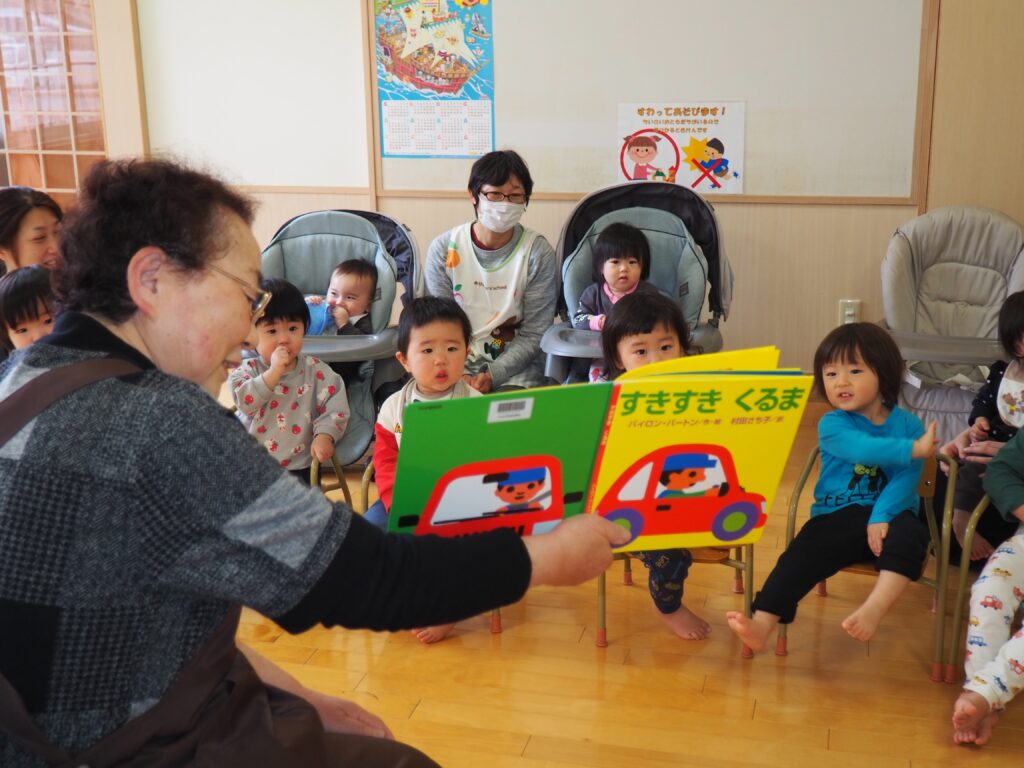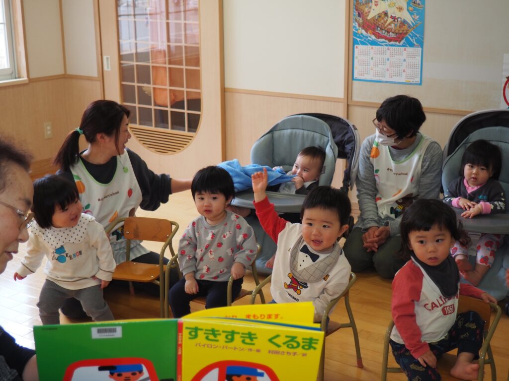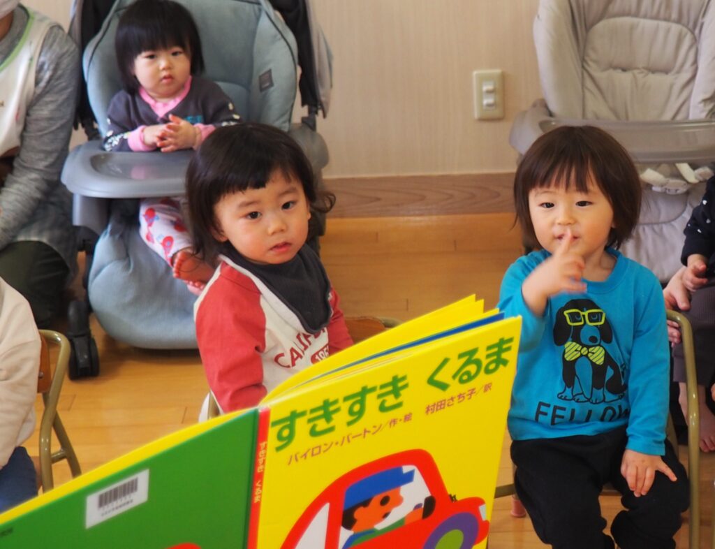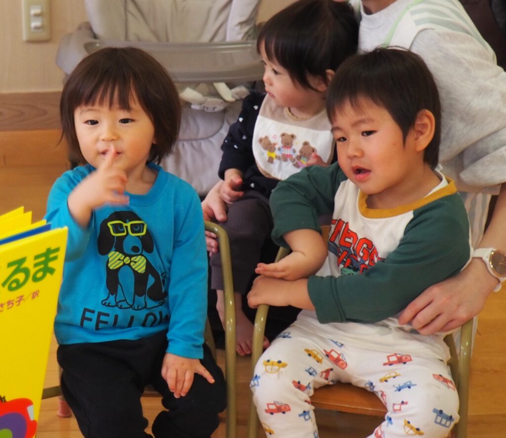 つくしんぼによるおはなし会 2026.04.08 第2水曜日は、0~2歳児を対象にした、読みかたりグループ「つくしんぼ」によるおはなし会です。子どもたちは、真剣な眼差しで絵本の世界を楽しんでいました。地域の方々との触れ合いを通して社会性を育んだり、たくさんの絵本に触れることで、語彙力の土台・集中力のアップにつなげることをねらいとしています。