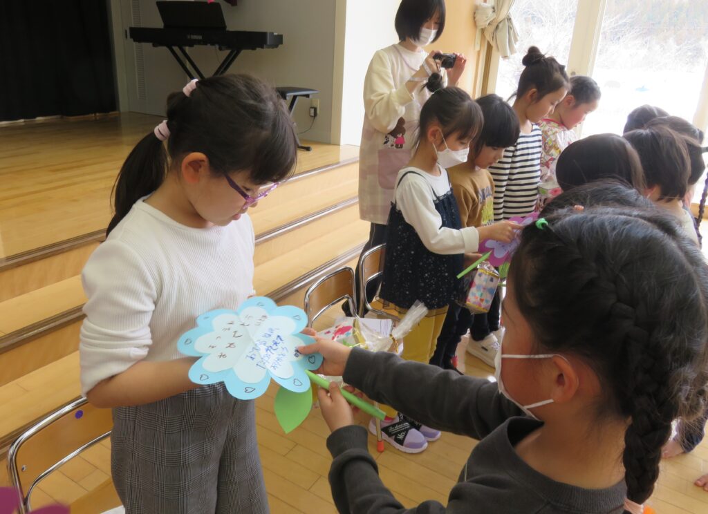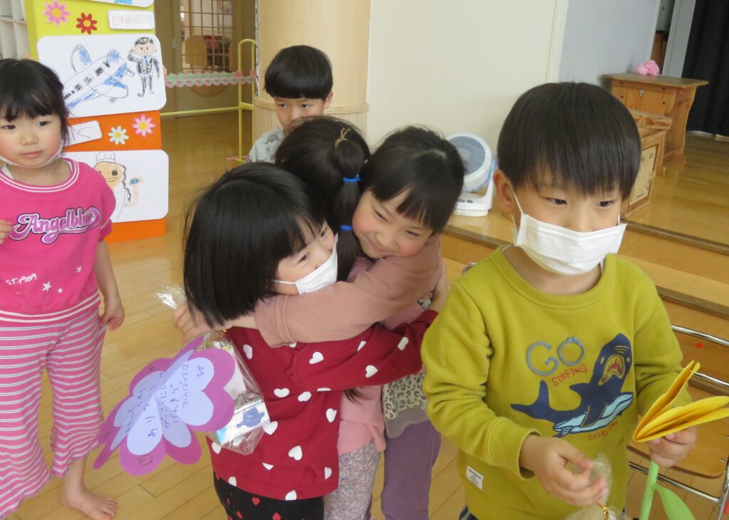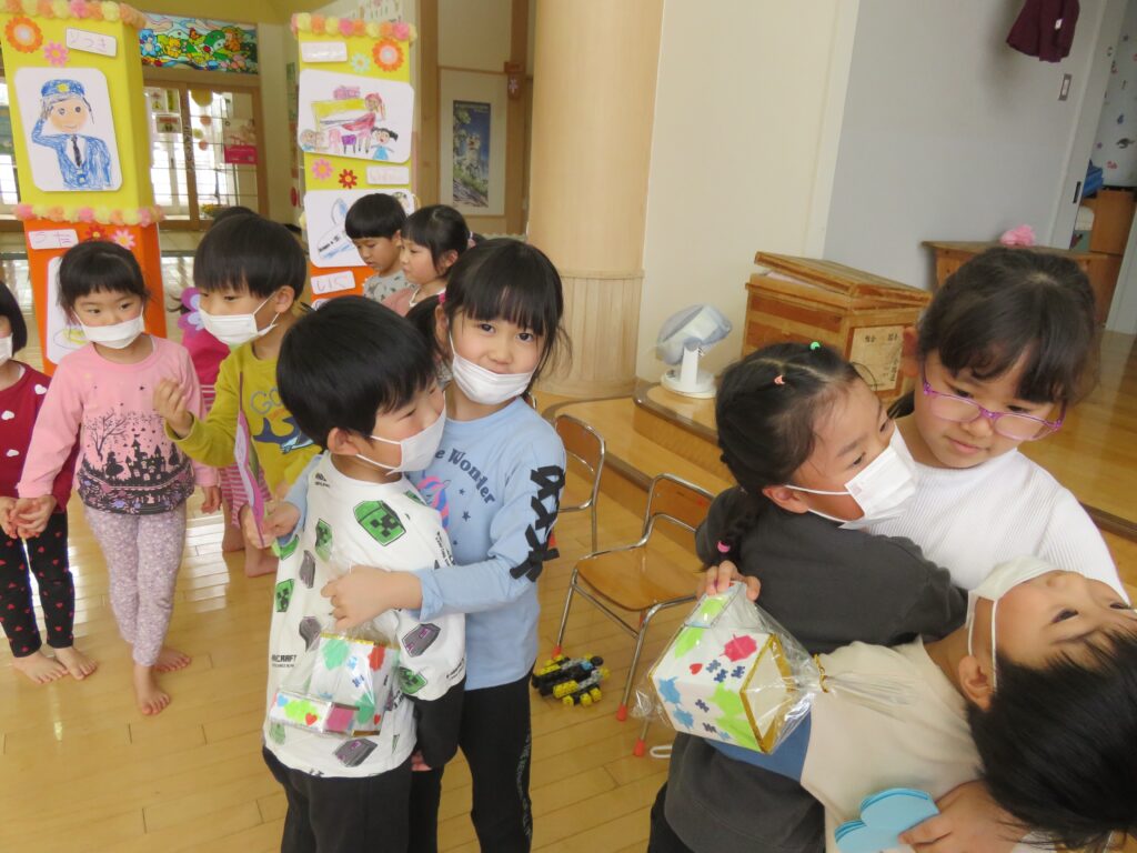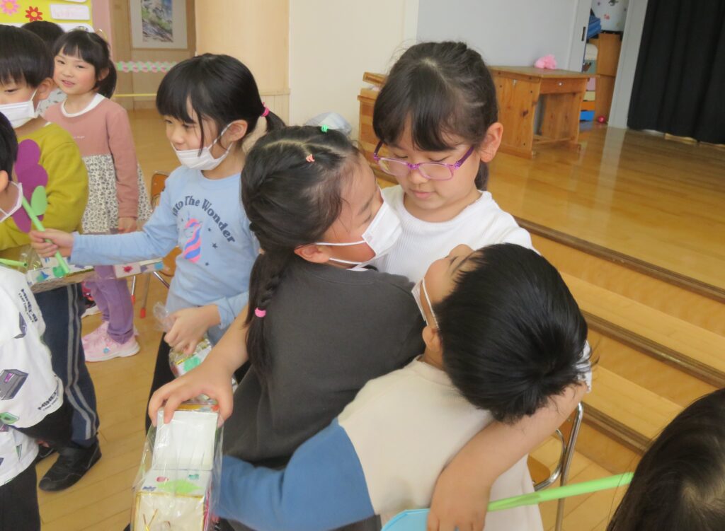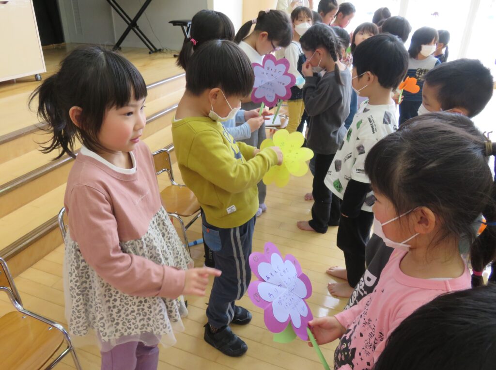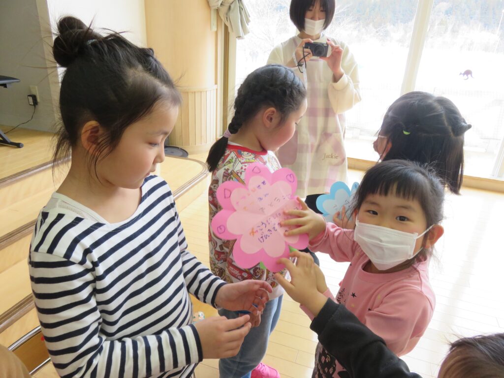 ひまわり組さん、今までありがとう! 2026.03.27 今まで一緒に遊んでくれた年長さんとお別れ会をしました。いままで一緒に遊んでくれたお礼に、3・4歳児から手作りのペン立てとメッセージカードがプレゼントされました。その他にも、得意技を披露したり、質問コーナーを楽しんだり、時間の許す限り交流を楽しみました。 お別れするのが悲しくて、涙する子もおりました。