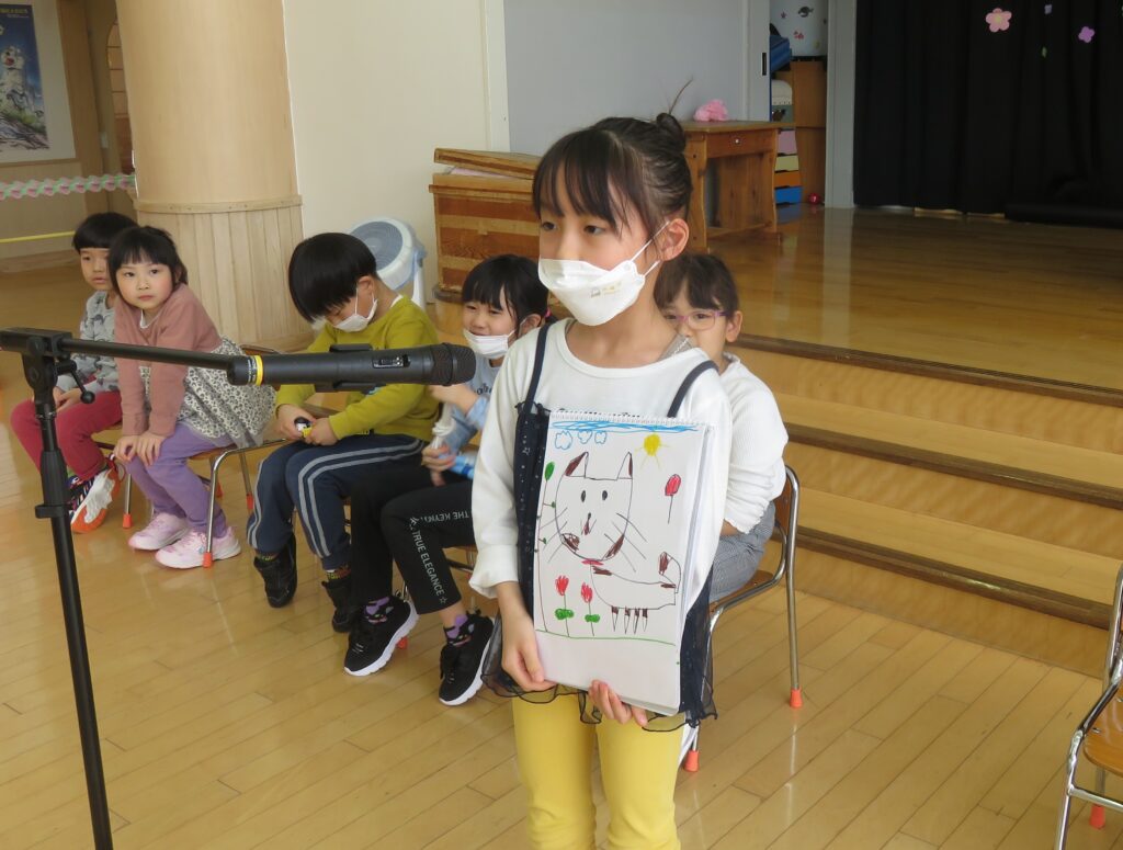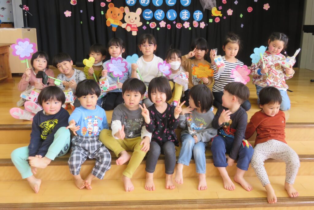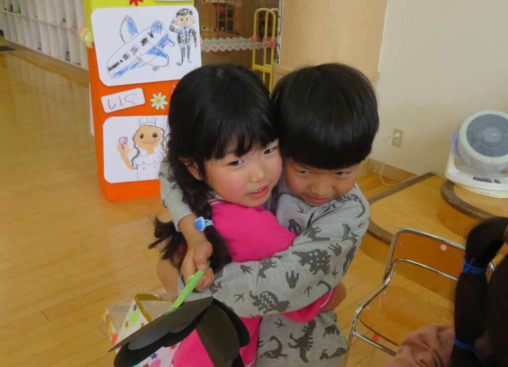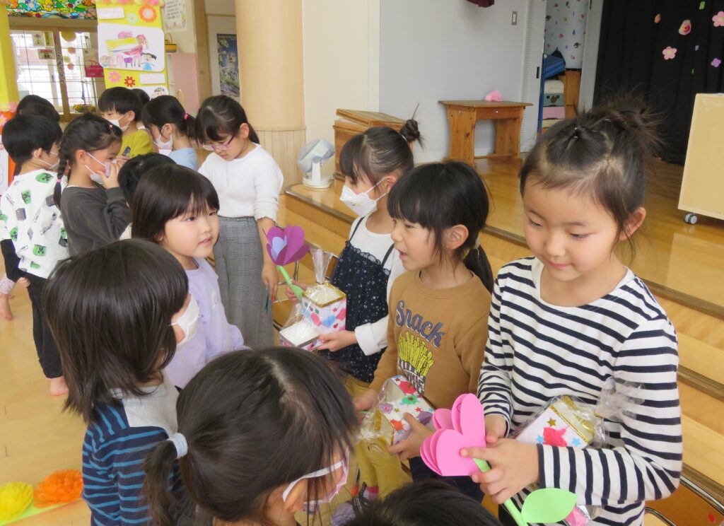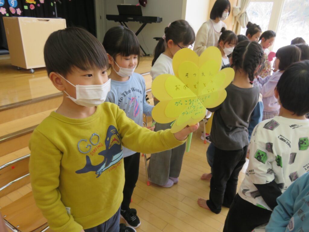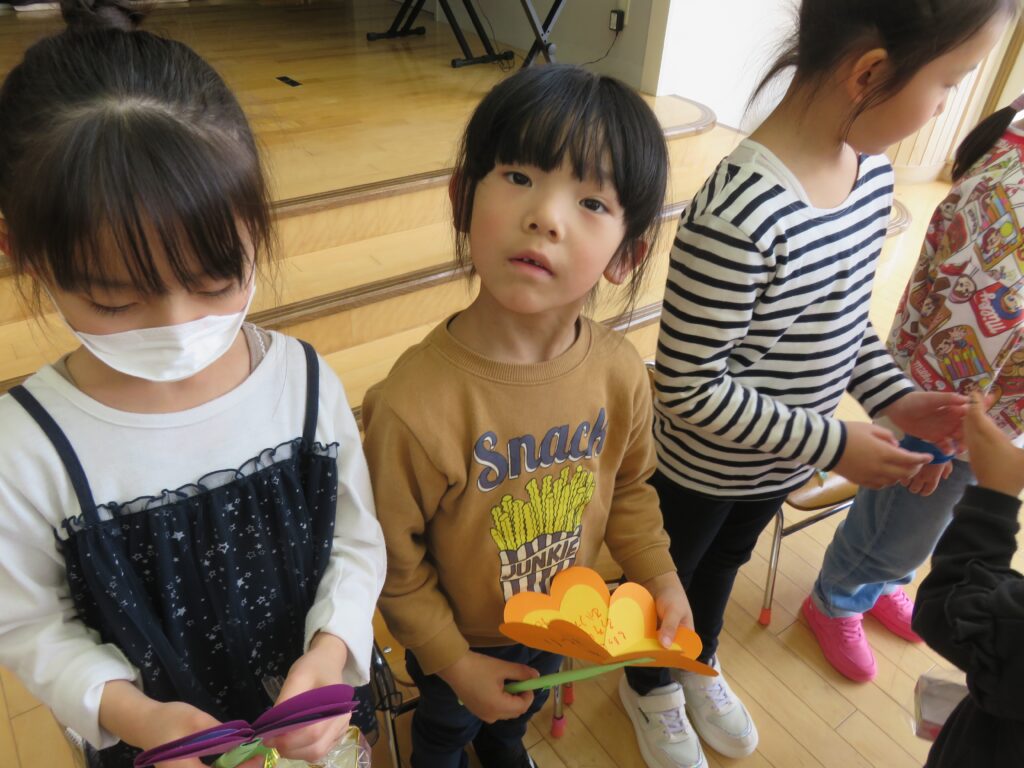 ひまわり組さん、今までありがとう! 2026.03.27 今まで一緒に遊んでくれた年長さんとお別れ会をしました。いままで一緒に遊んでくれたお礼に、3・4歳児から手作りのペン立てとメッセージカードがプレゼントされました。その他にも、得意技を披露したり、質問コーナーを楽しんだり、時間の許す限り交流を楽しみました。 お別れするのが悲しくて、涙する子もおりました。