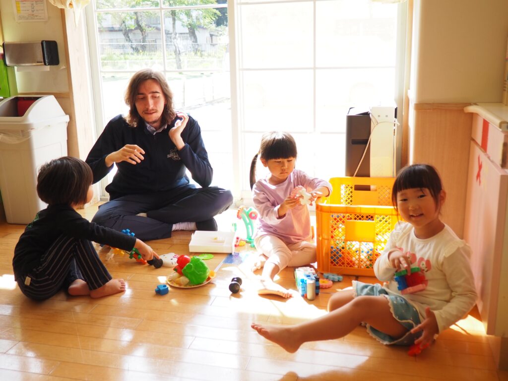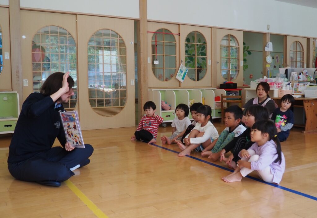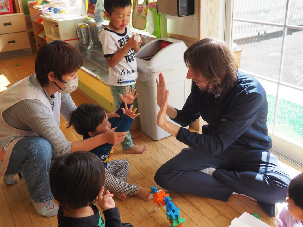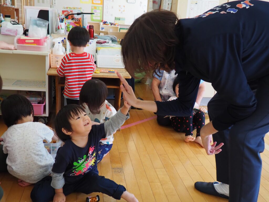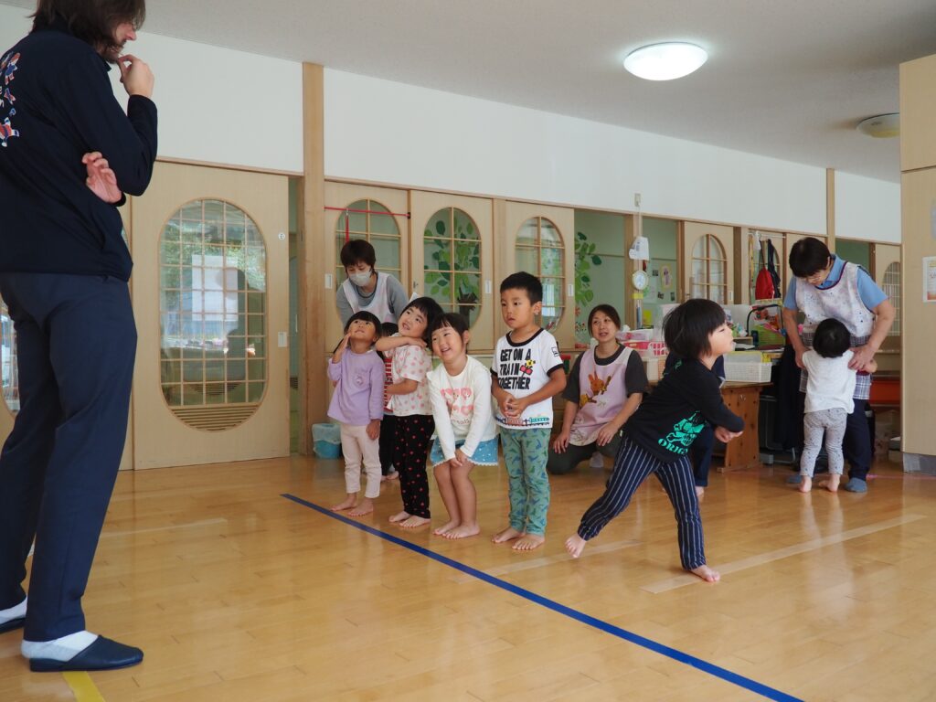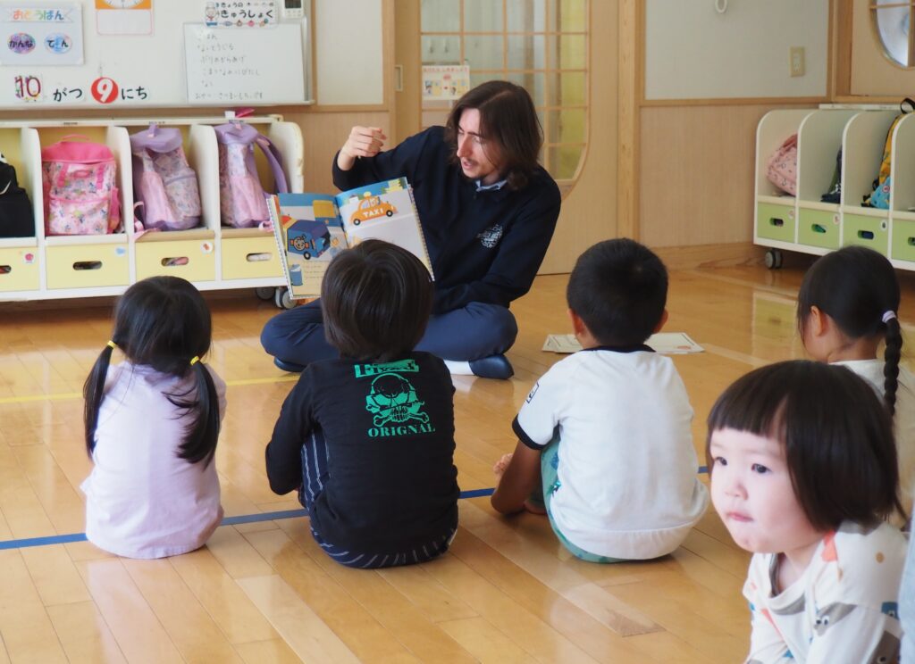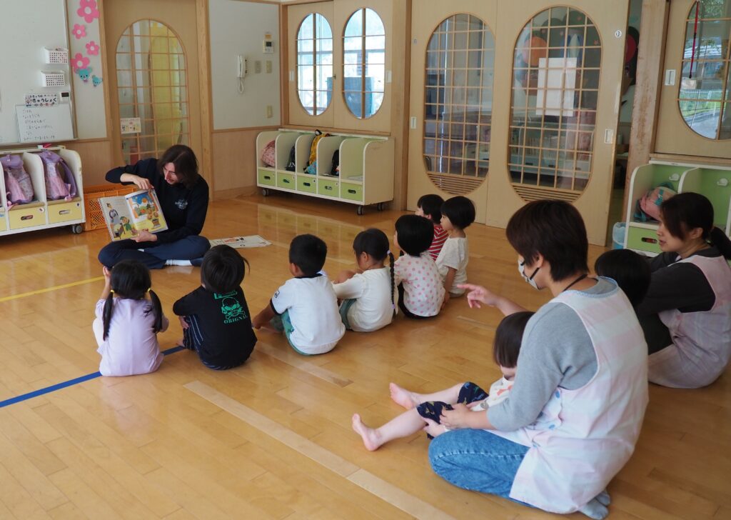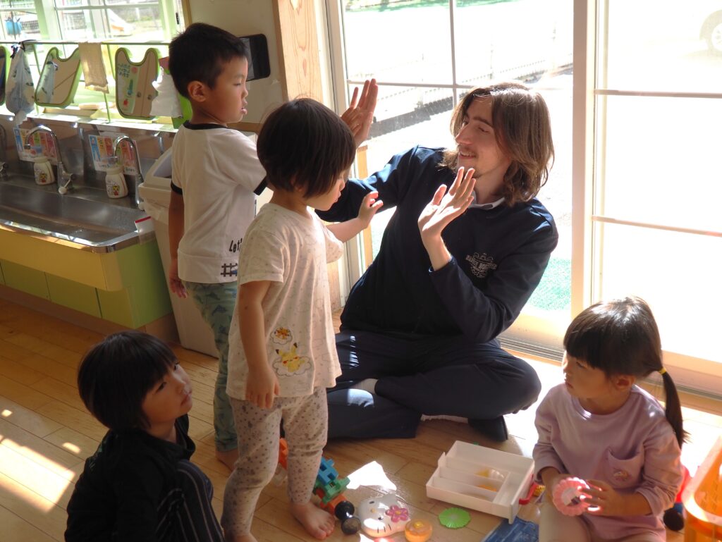 カイル先生と英語であそぼ! 2025.10.09 今週は1・2歳児クラスがカイル先生と英語で遊びました。初めは恐る恐るタッチしていた子ども達も、絵本を読んでもらったりしているうちにすっかりなついて、大好きなカイル先生との時間を存分に楽しんでいました。