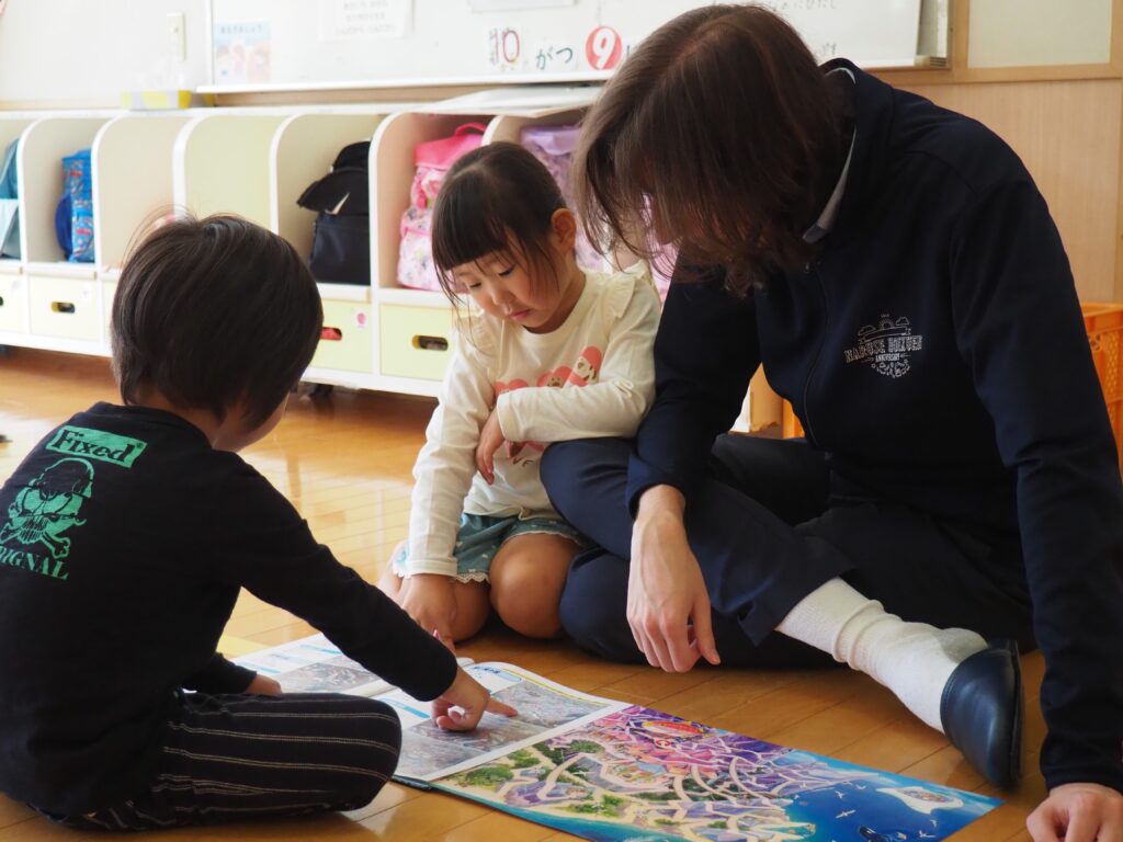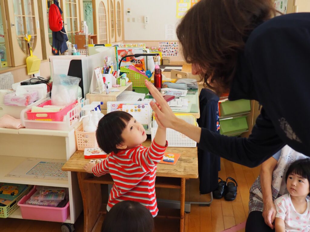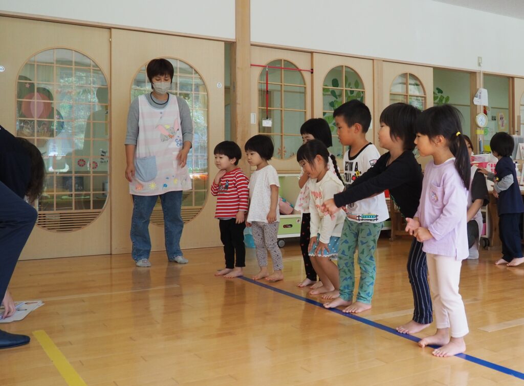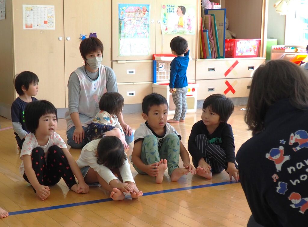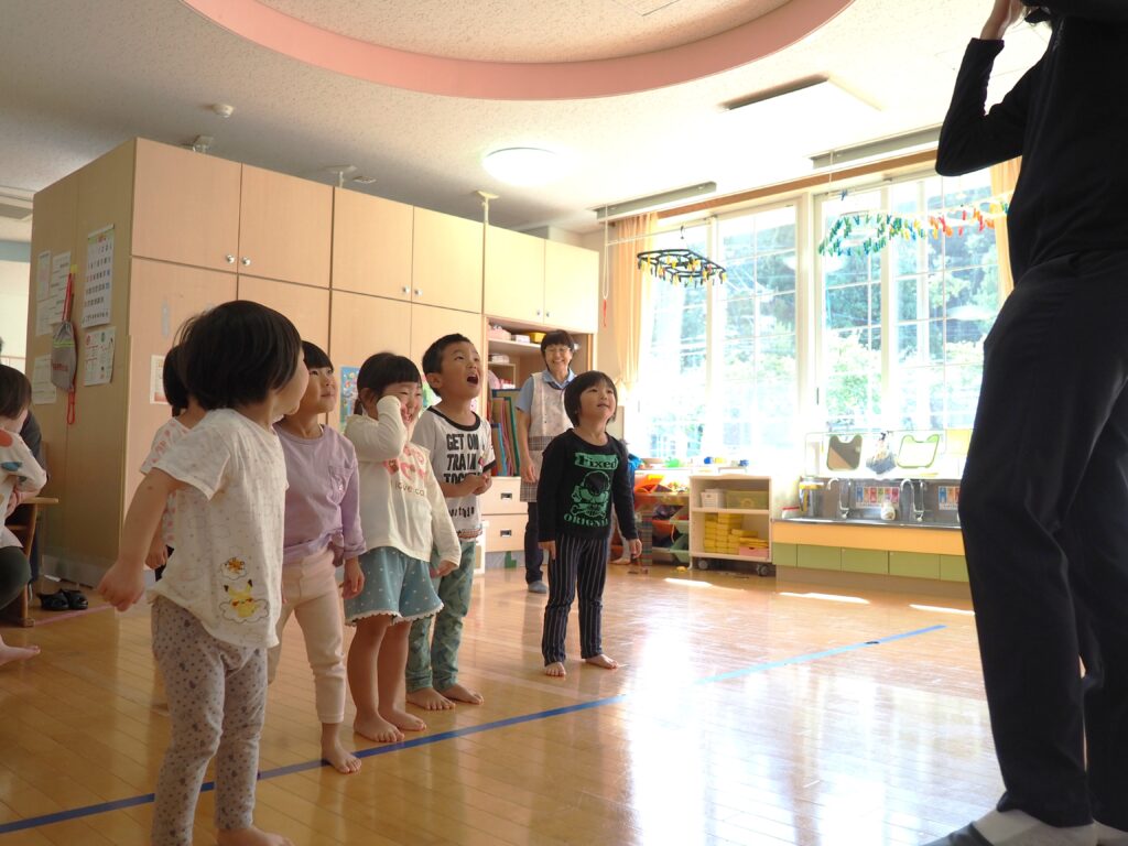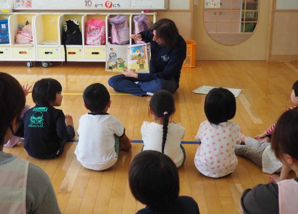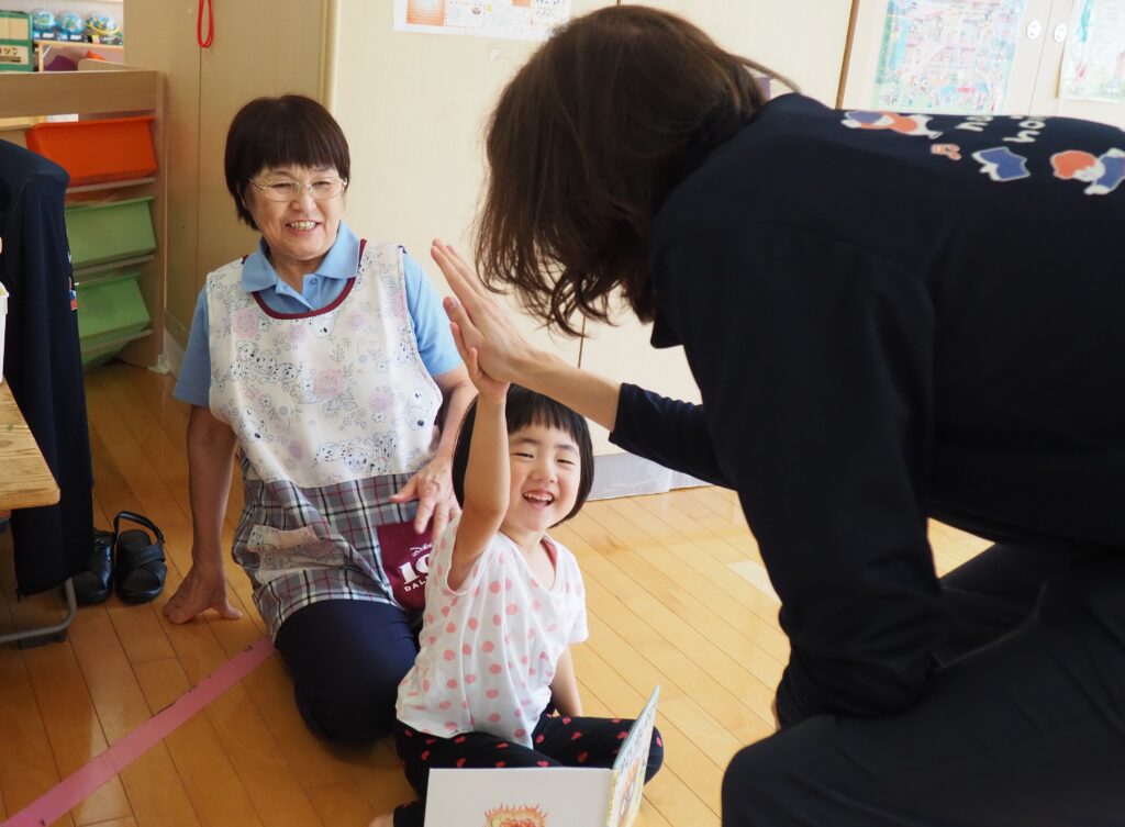 カイル先生と英語であそぼ! 2025.10.09 今週は1・2歳児クラスがカイル先生と英語で遊びました。初めは恐る恐るタッチしていた子ども達も、絵本を読んでもらったりしているうちにすっかりなついて、大好きなカイル先生との時間を存分に楽しんでいました。