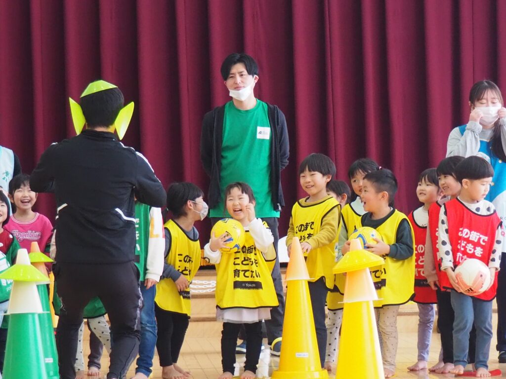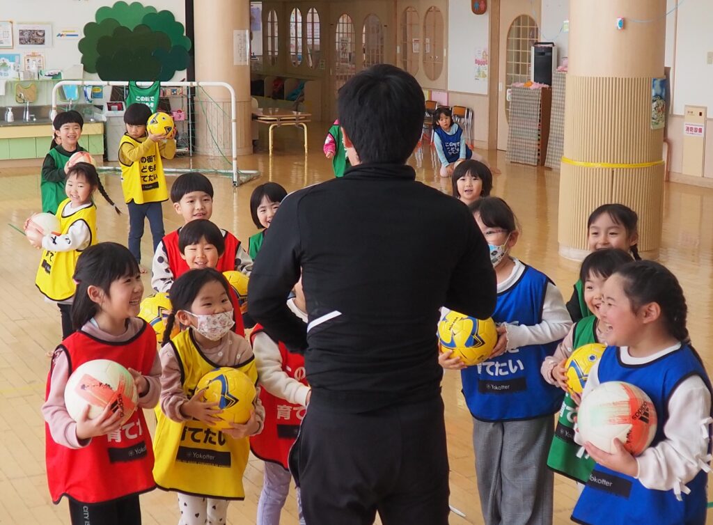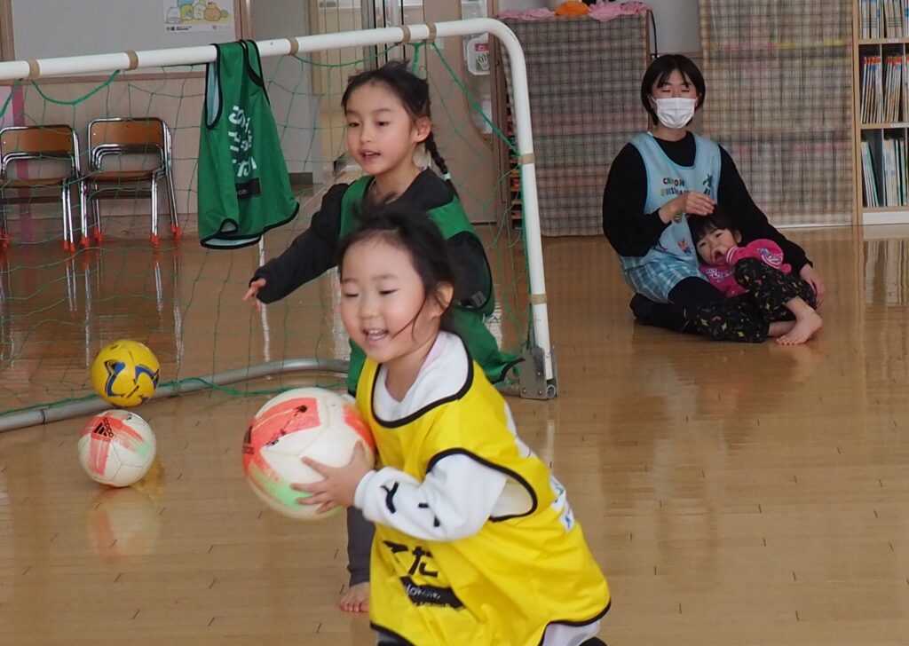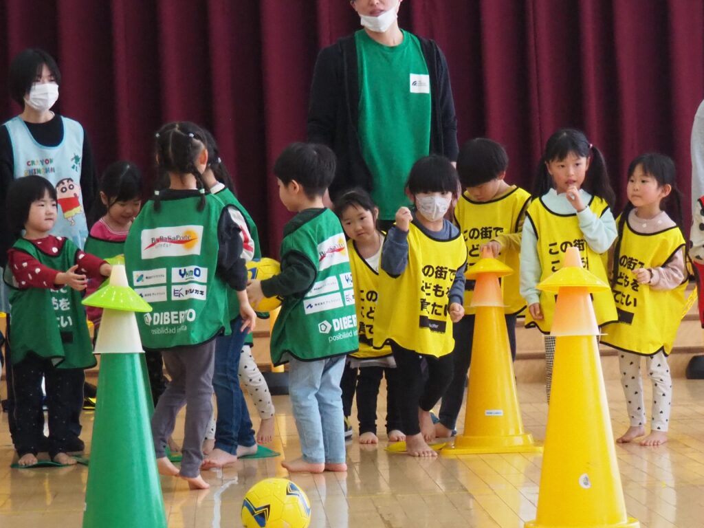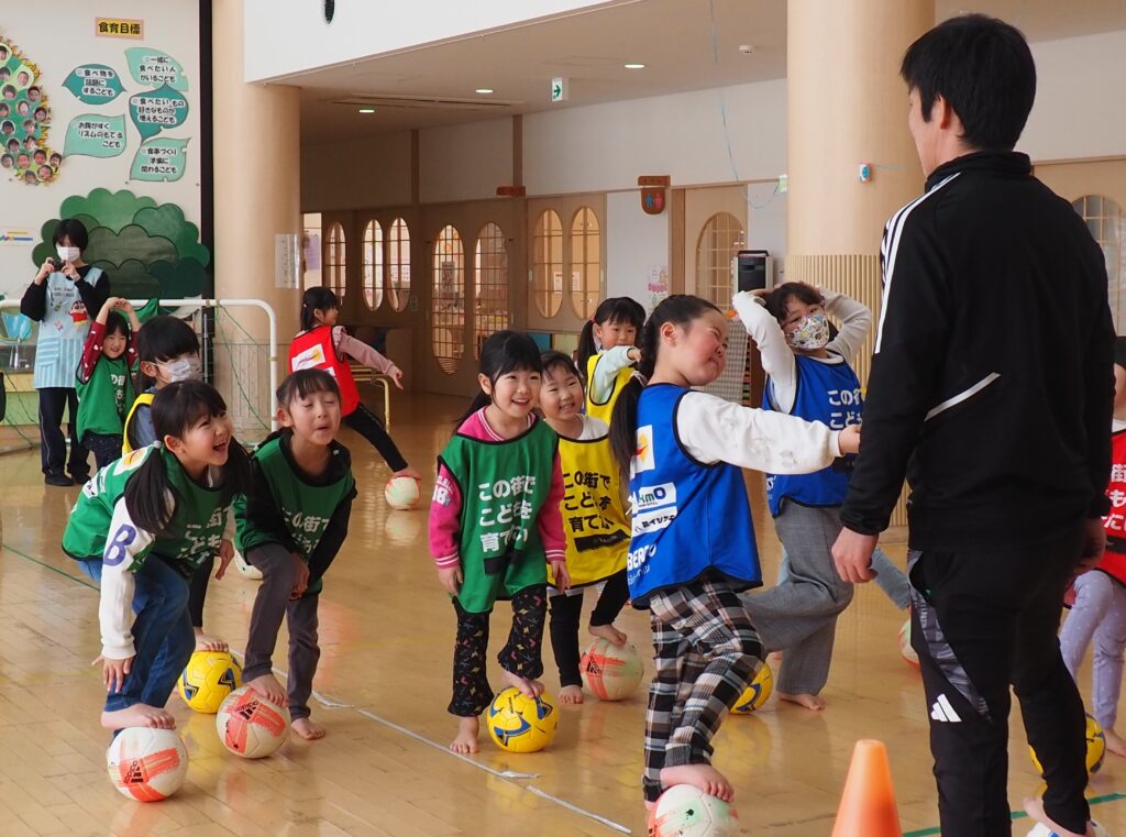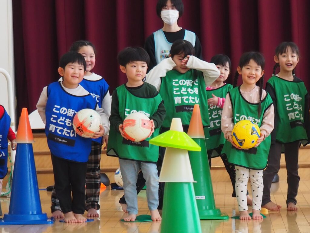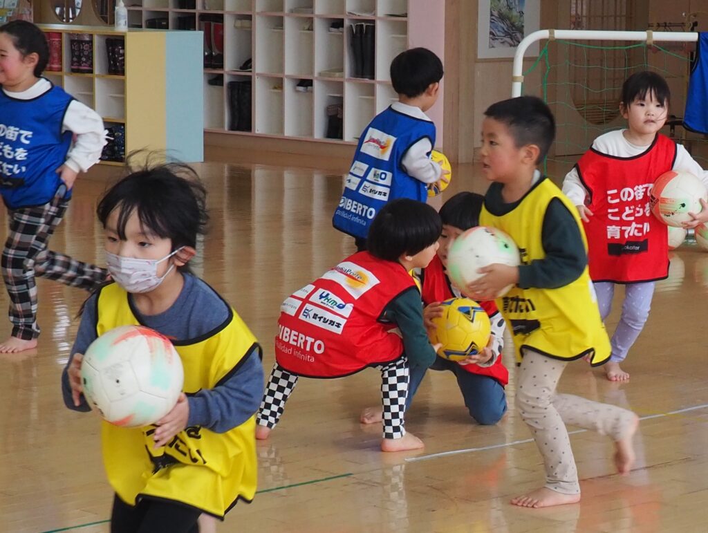 ボール遊び教室大盛況! 2026.01.21 3~5歳児が「ボール遊び教室Part1」で汗を流しました。講師は県サッカー協会の佐藤コーチです。寒さに負けず元気に身体を動かして遊べるよう、毎年この時季に開催しており、子どもたちが楽しみにしている教室です。佐藤コーチの主導のもと、主体性と社会性の育ちにつながる活動は有意義な時間となりました。また、子どもたちはグリーンカードを手にすることで、大きな自信となりました。