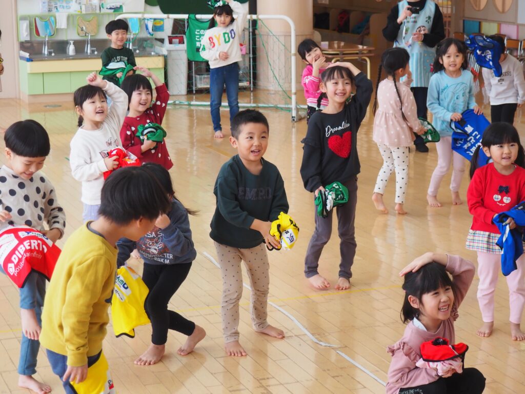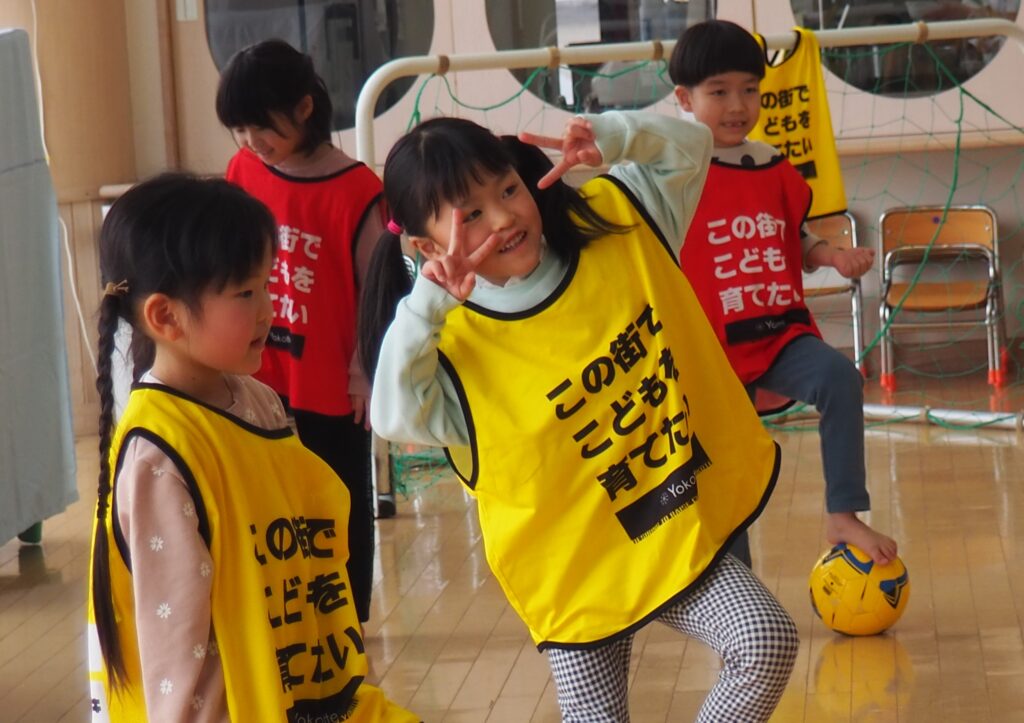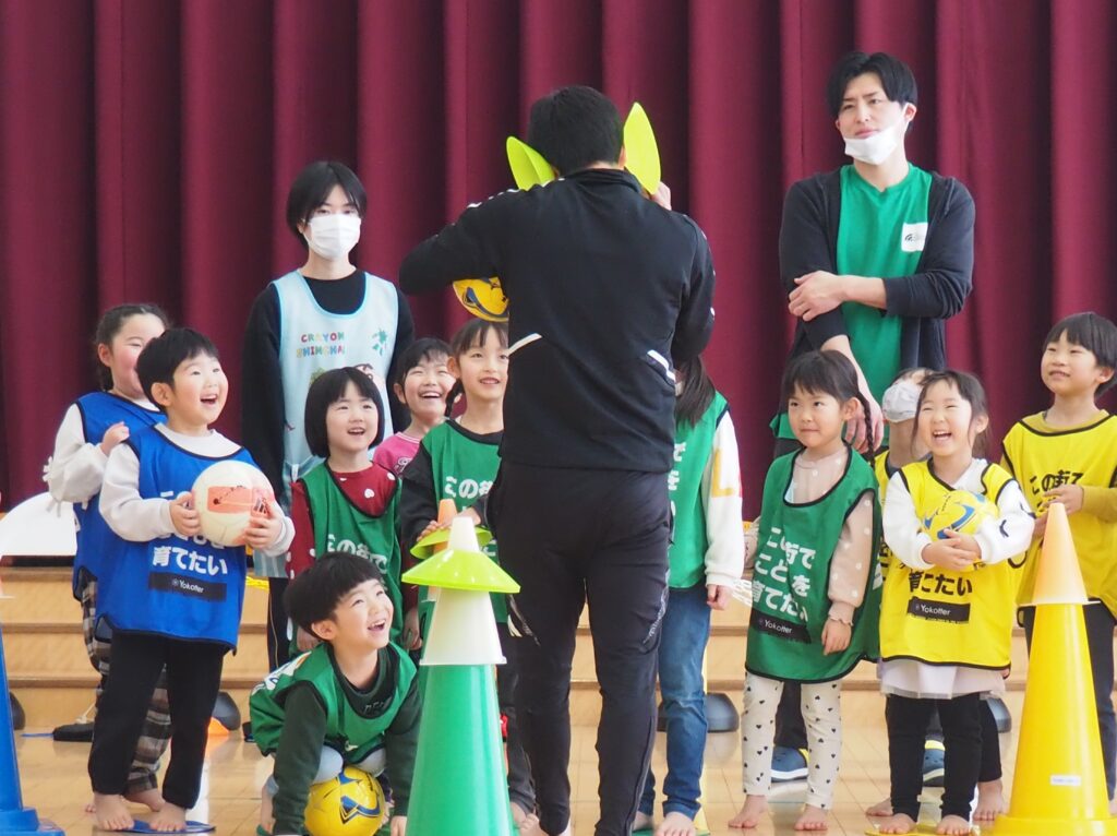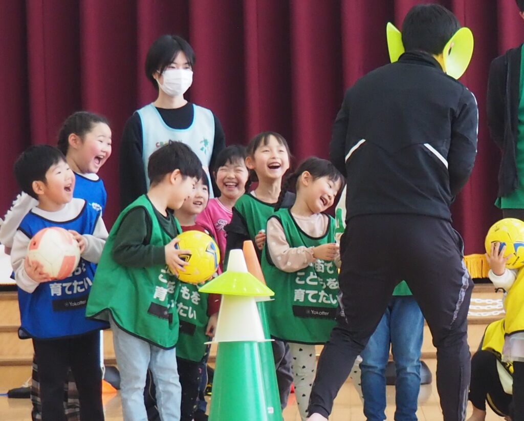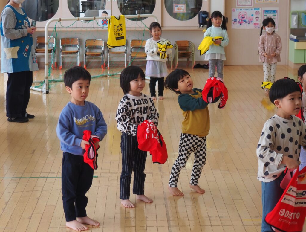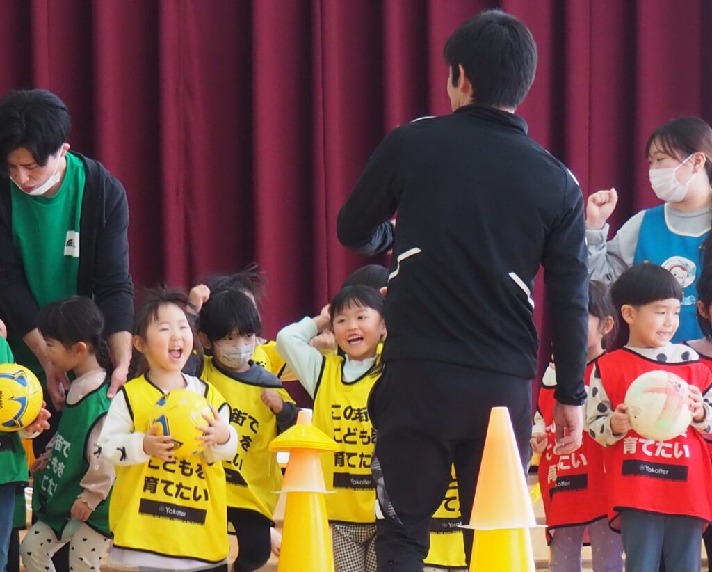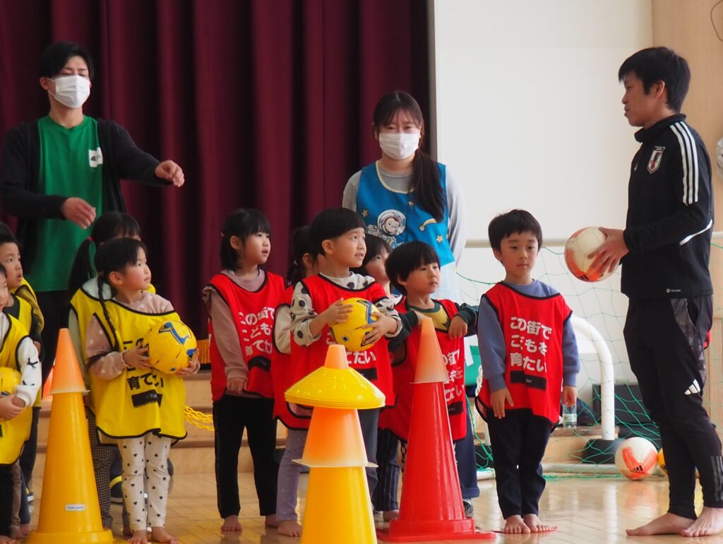 ボール遊び教室大盛況! 2026.01.21 3~5歳児が「ボール遊び教室Part1」で汗を流しました。講師は県サッカー協会の佐藤コーチです。寒さに負けず元気に身体を動かして遊べるよう、毎年この時季に開催しており、子どもたちが楽しみにしている教室です。佐藤コーチの主導のもと、主体性と社会性の育ちにつながる活動は有意義な時間となりました。また、子どもたちはグリーンカードを手にすることで、大きな自信となりました。