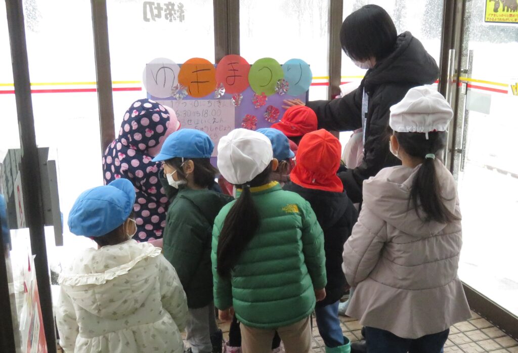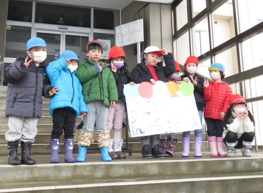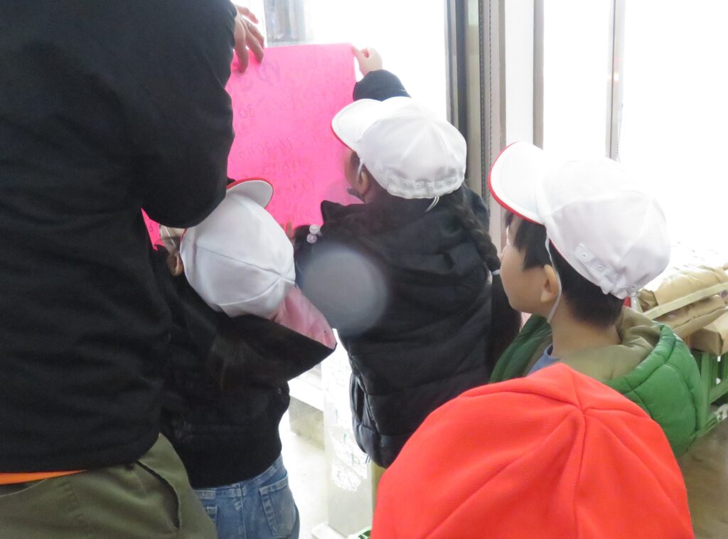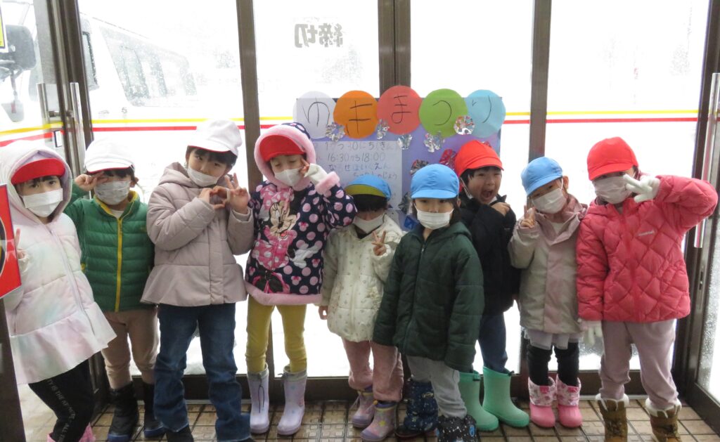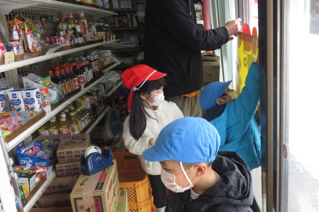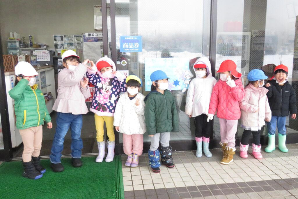 ポスターを貼りに地域へ! 2026.01.16 地域交流活動として、1月30日に行われる「雪まつり」のポスターを貼りに、3~5歳児が地域に出掛けました。「雪まつり」の開催は、子どもたちに季節の行事を体験させることで、日本の伝統文化に触れ、協調性や社会性を育むことをねらいとしています。また、地域の方々をお迎えして行われる行事は、保護者や地域とのつながりを深める貴重な機会と捉えています。 今回、ポスターの掲示を快く引き受けてくださった地域の皆様に感謝申し上げます。