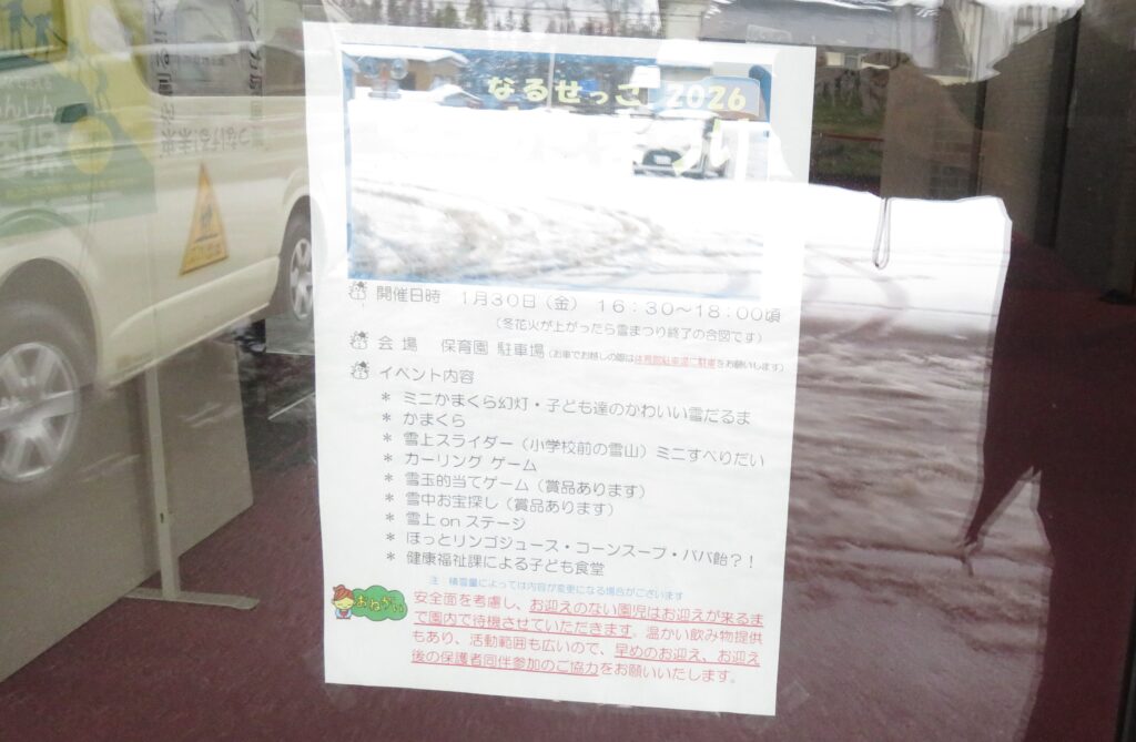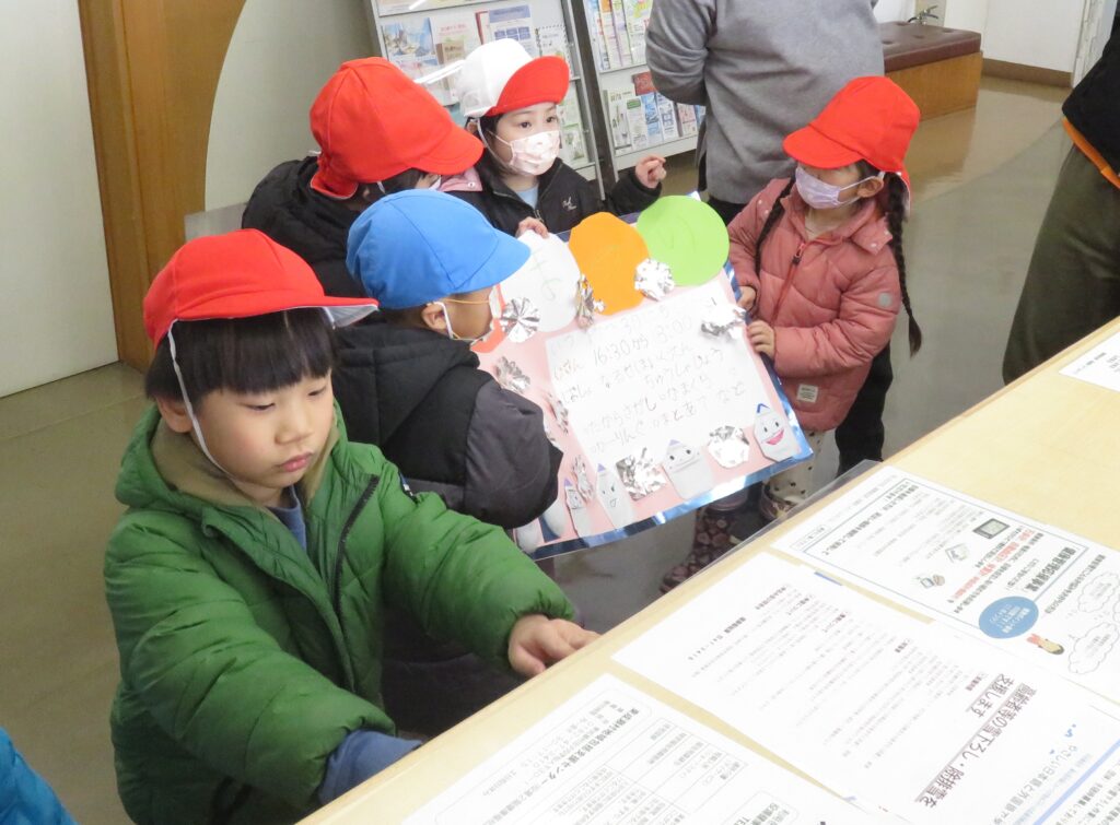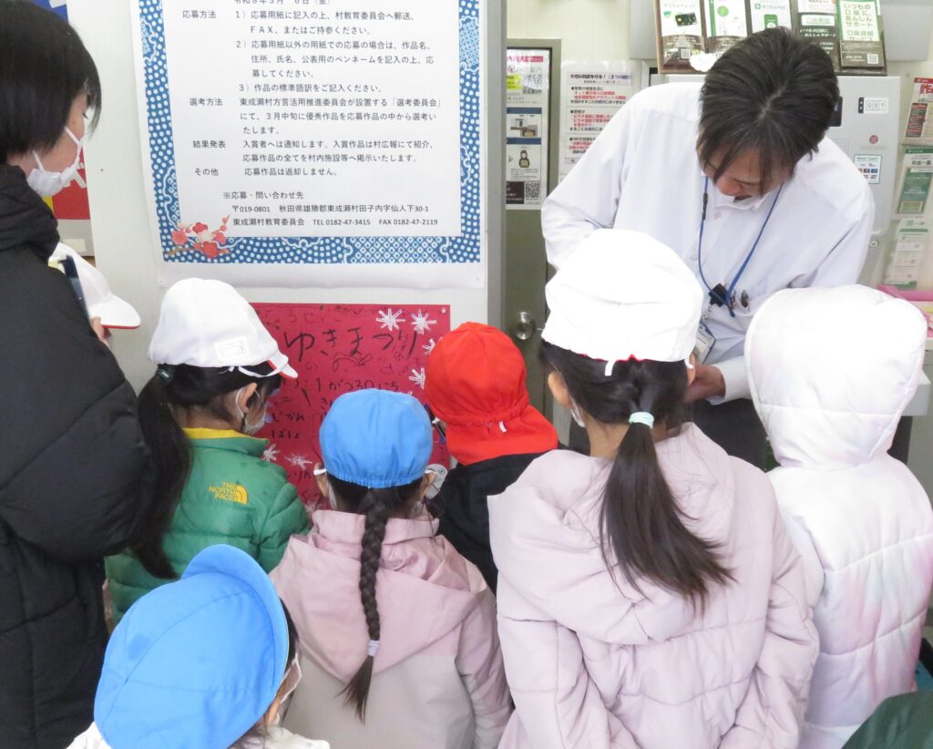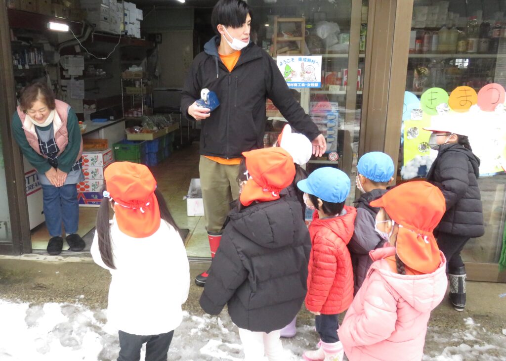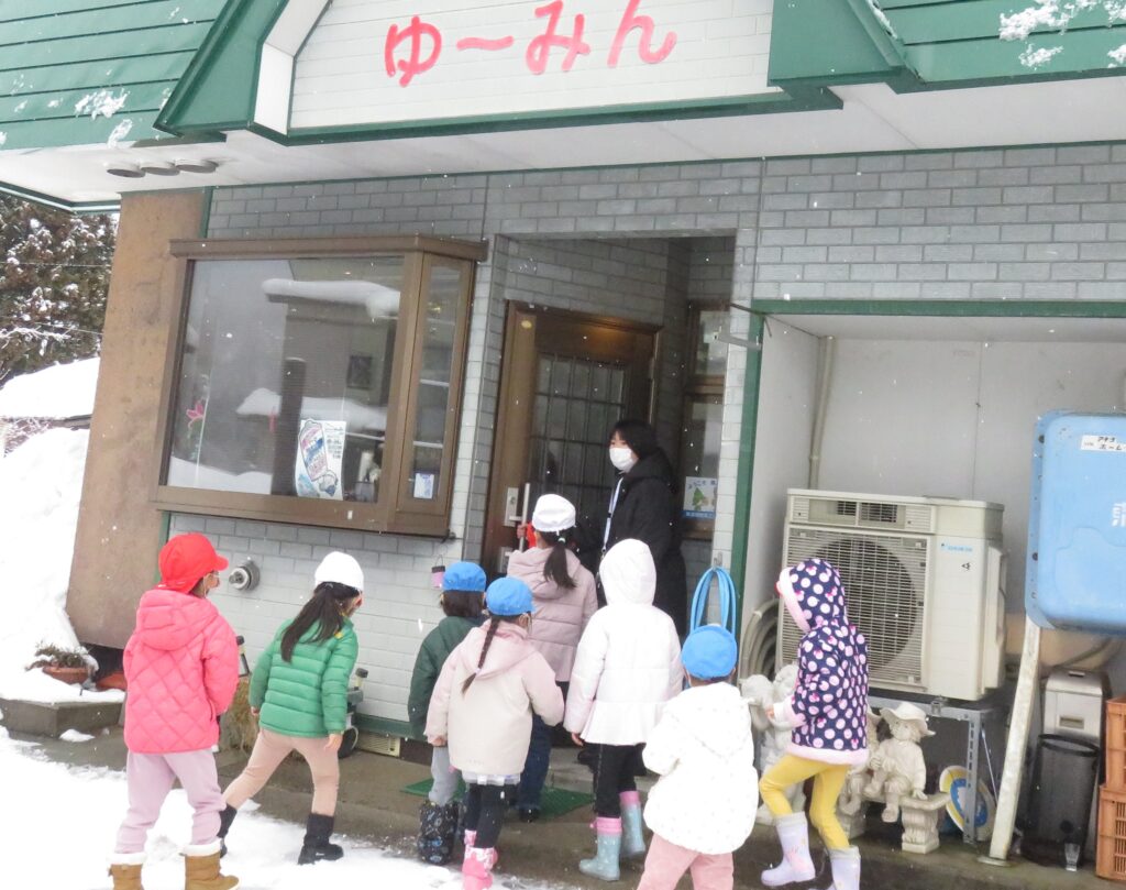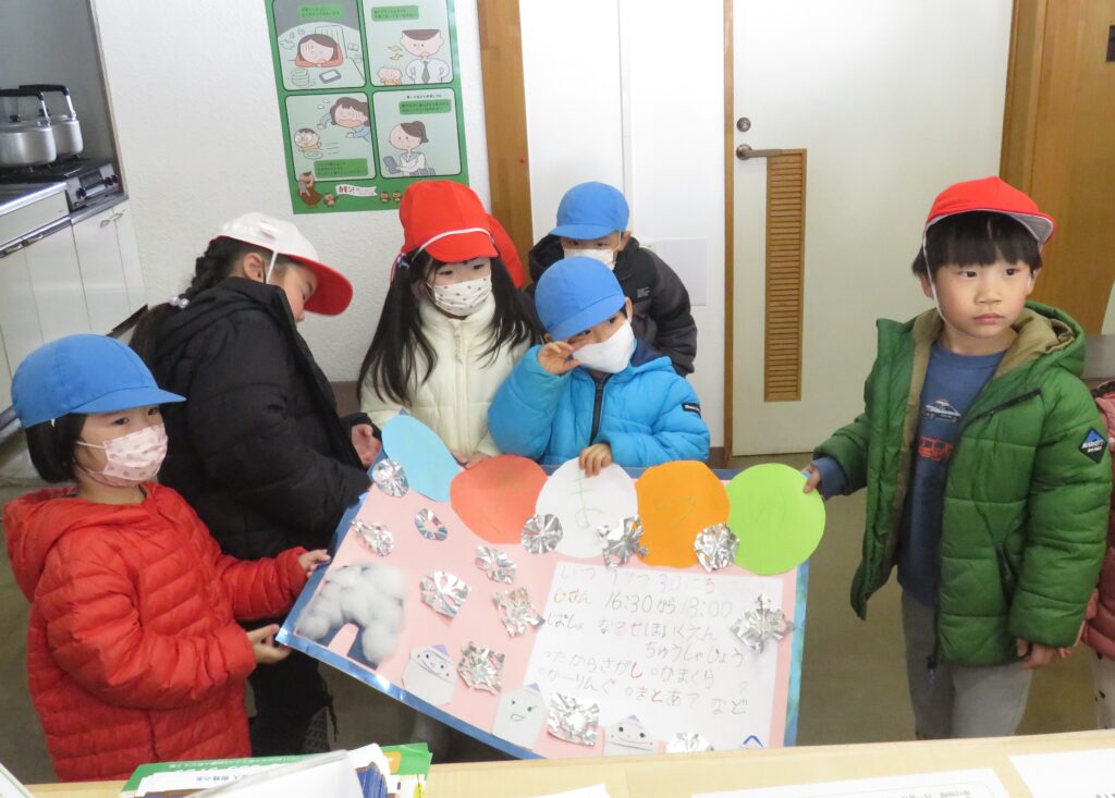 ポスターを貼りに地域へ! 2026.01.16 地域交流活動として、1月30日に行われる「雪まつり」のポスターを貼りに、3~5歳児が地域に出掛けました。「雪まつり」の開催は、子どもたちに季節の行事を体験させることで、日本の伝統文化に触れ、協調性や社会性を育むことをねらいとしています。また、地域の方々をお迎えして行われる行事は、保護者や地域とのつながりを深める貴重な機会と捉えています。 今回、ポスターの掲示を快く引き受けてくださった地域の皆様に感謝申し上げます。