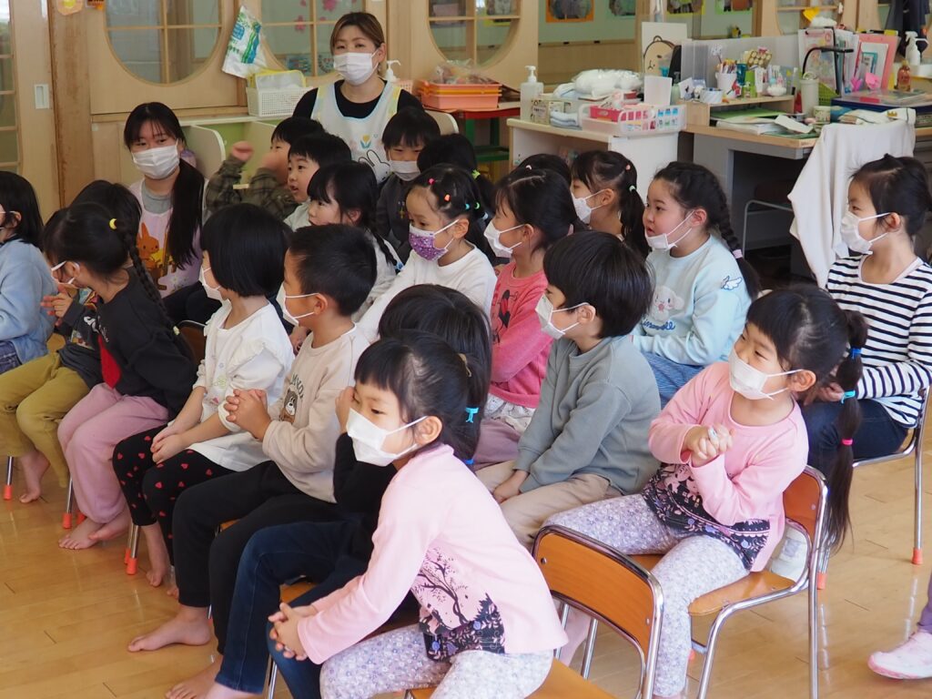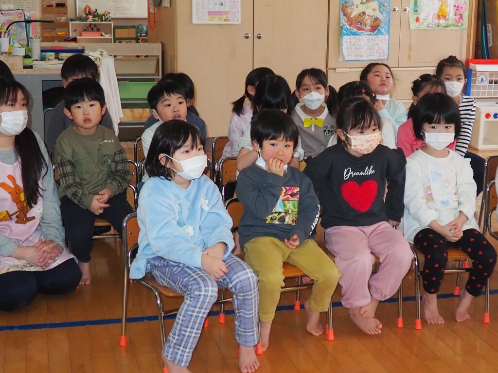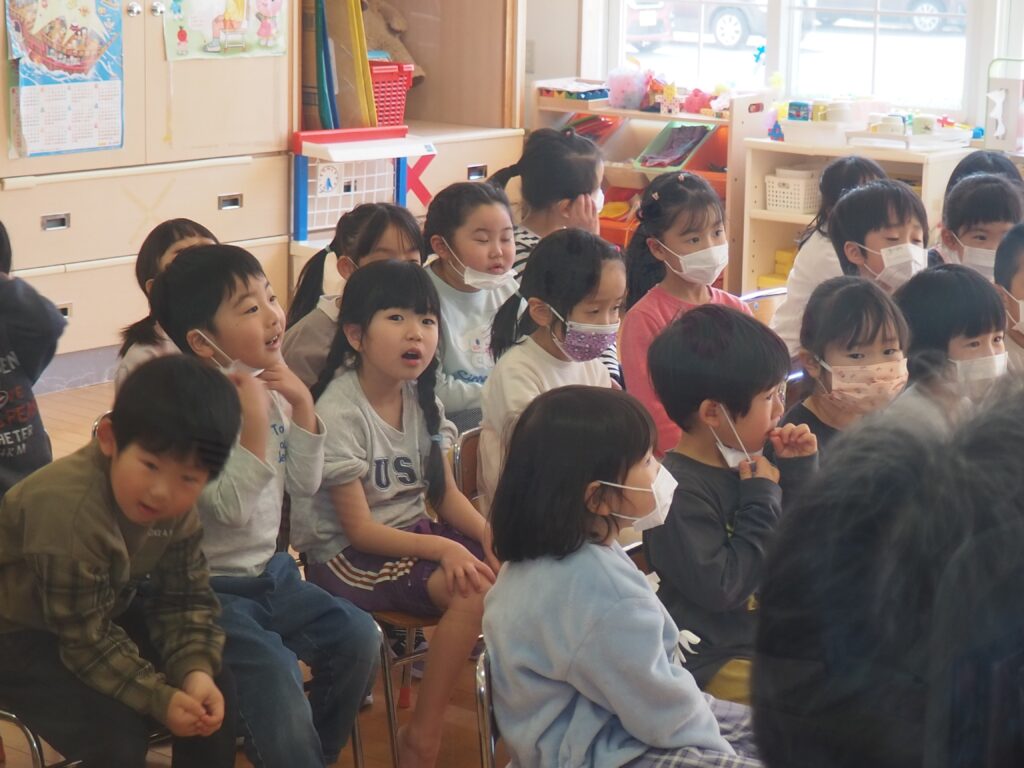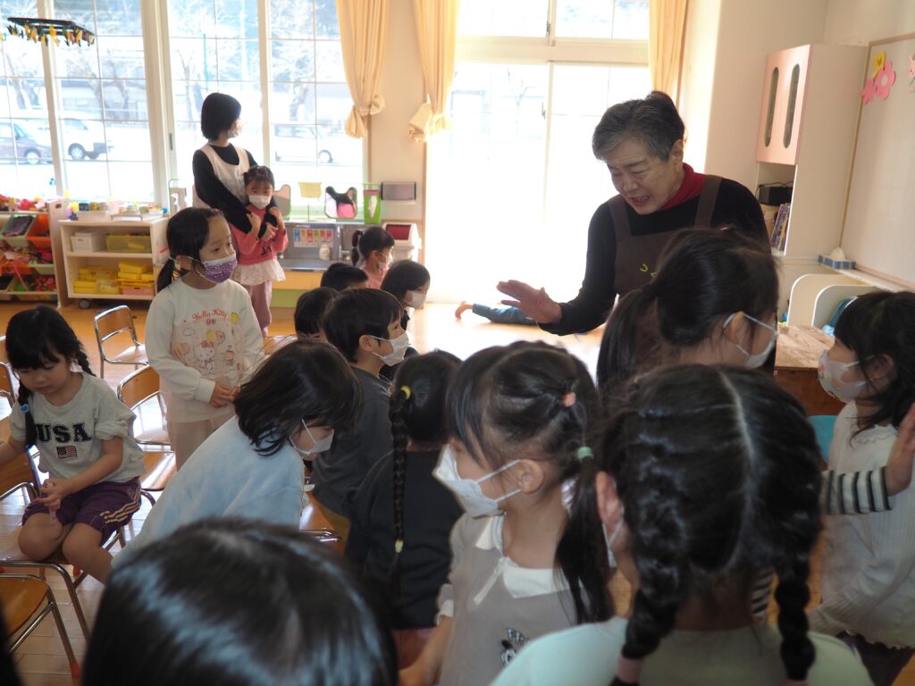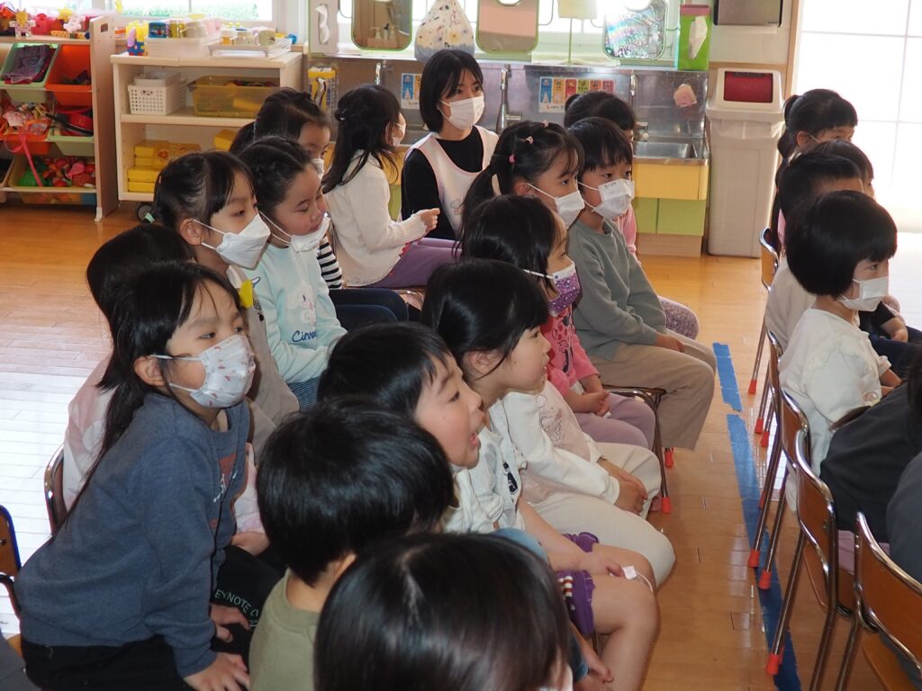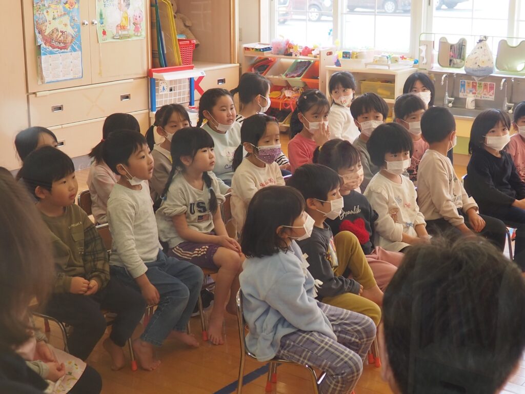 第4水曜日は、3~5歳児を対象にした、読みかたりグループ「つくしんぼ」によるおはなし会です。子どもたちは、真剣な眼差しで絵本の世界を楽しんでいました。地域の方々との触れ合いを通して社会性を育んだり、たくさんの絵本に触れることで、語彙力・読解力がアップすることをねらいとしています。