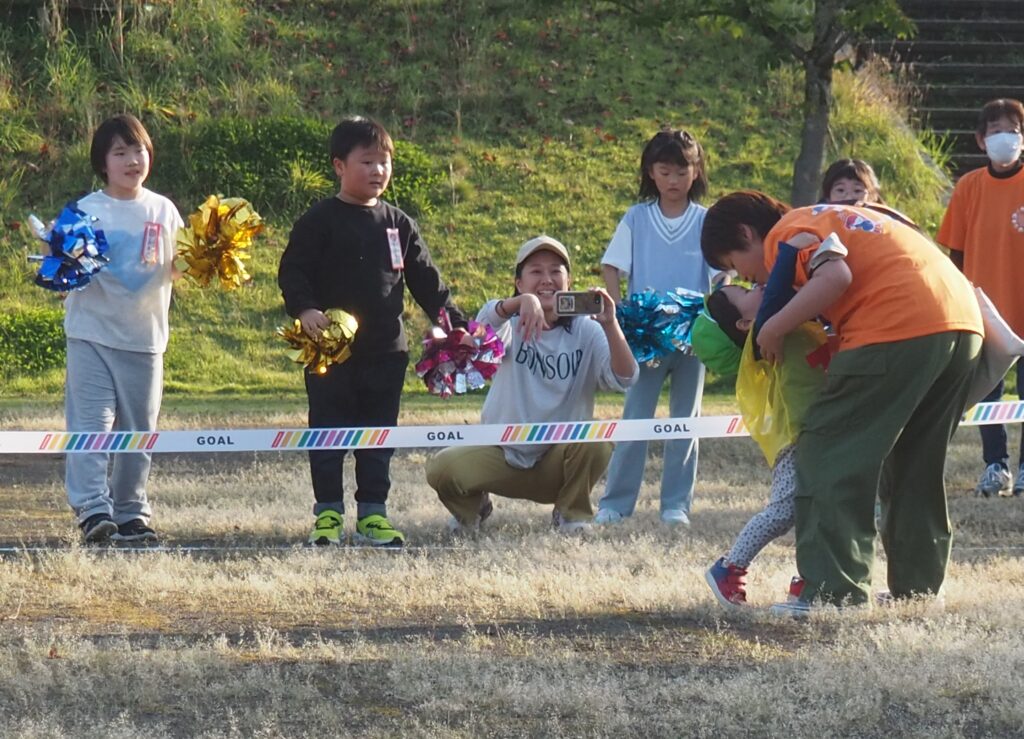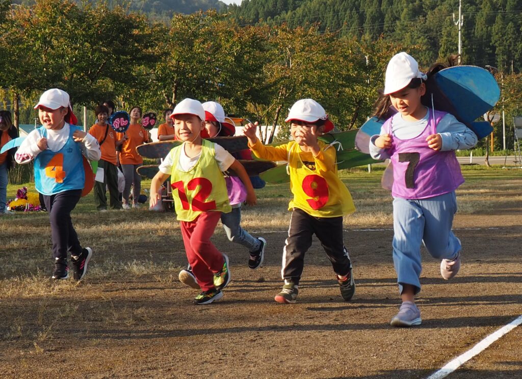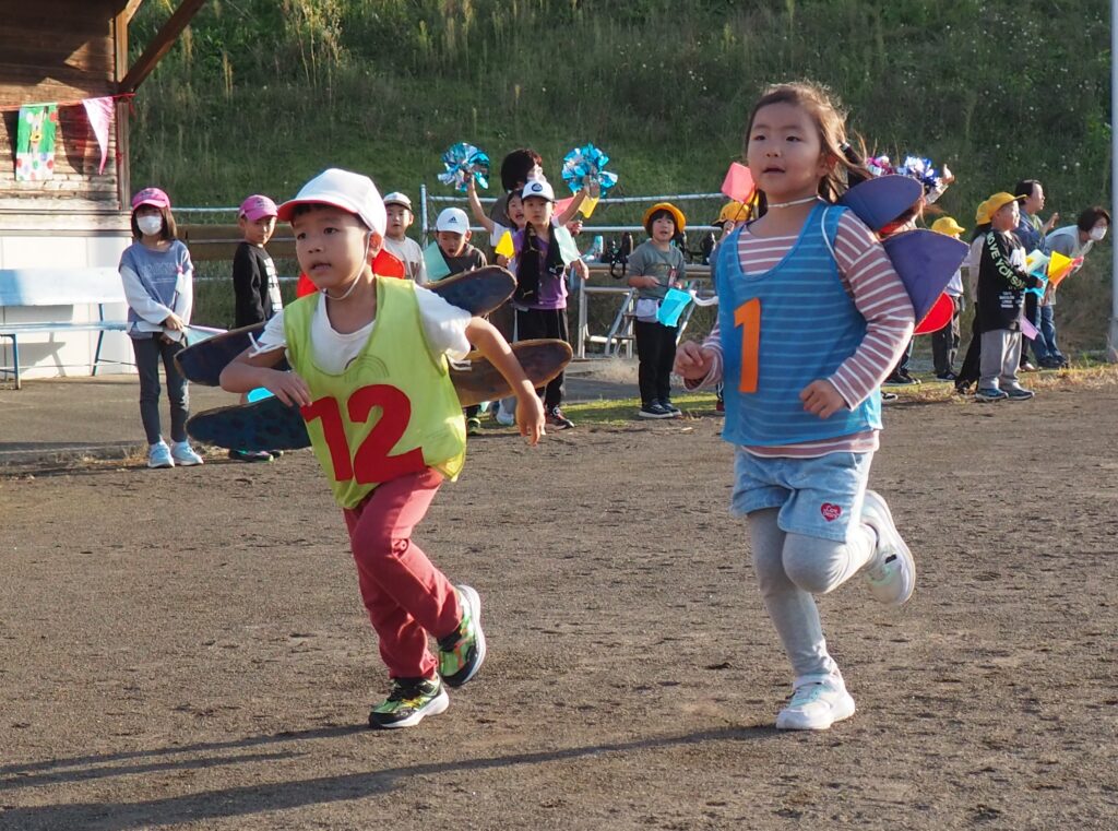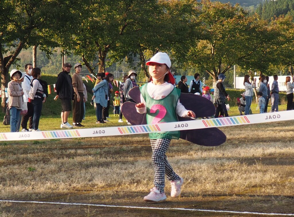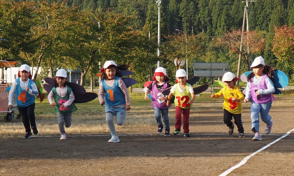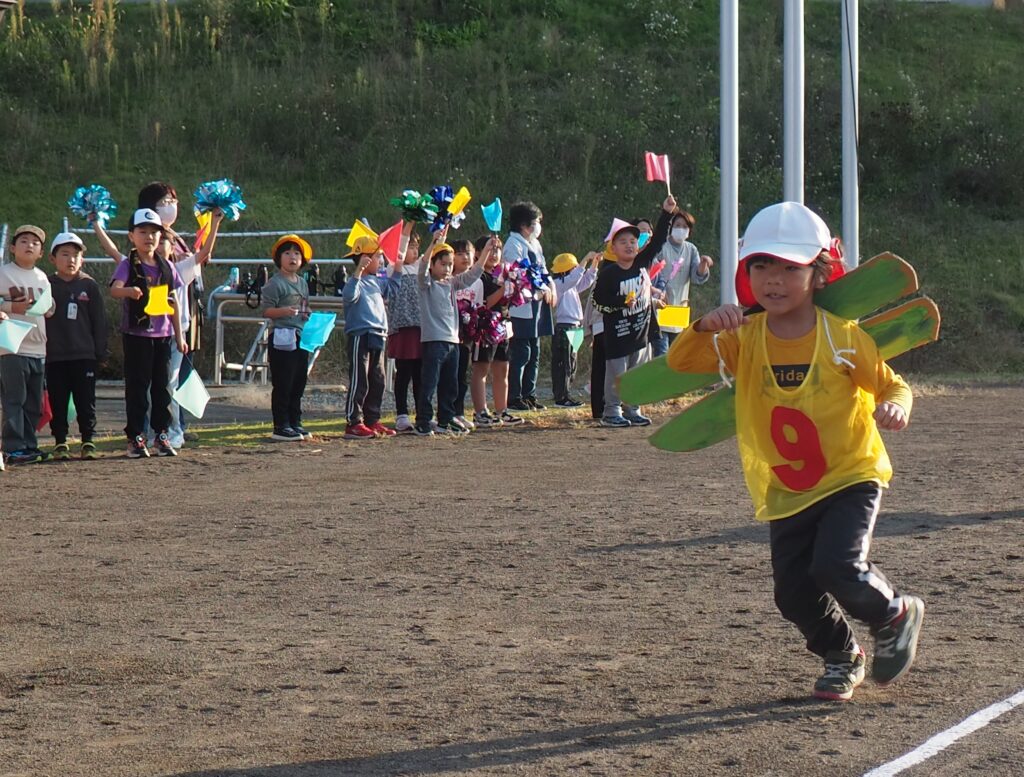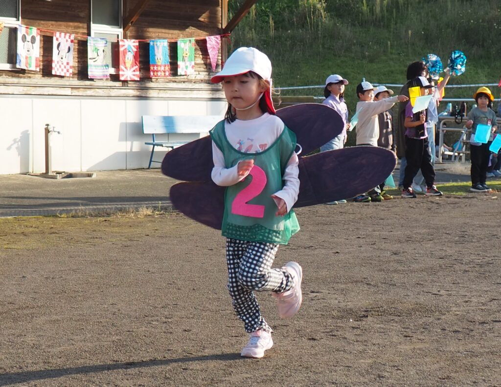5歳児はトンボになりきって全員完走。マラソンに抵抗を感じていた子に、どうしたら楽しくゴールを目指せるのかみんなで考えました。トンボの羽に見立てた羽を付けると、まるでトンボになったように軽やかに走り、見事ゴール!担任のちよっとした工夫と応援の気持ちが、子どもたちの力を引き出しました。