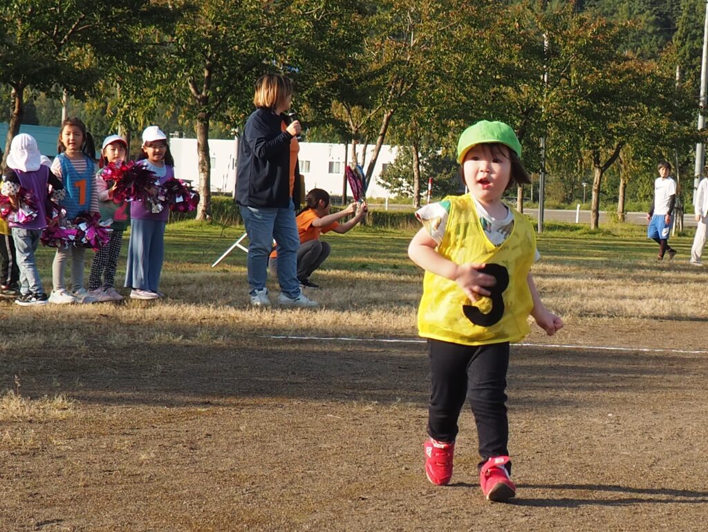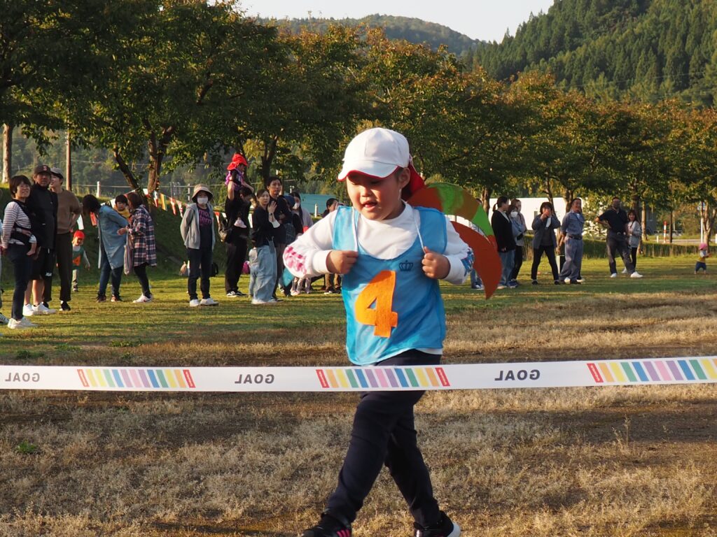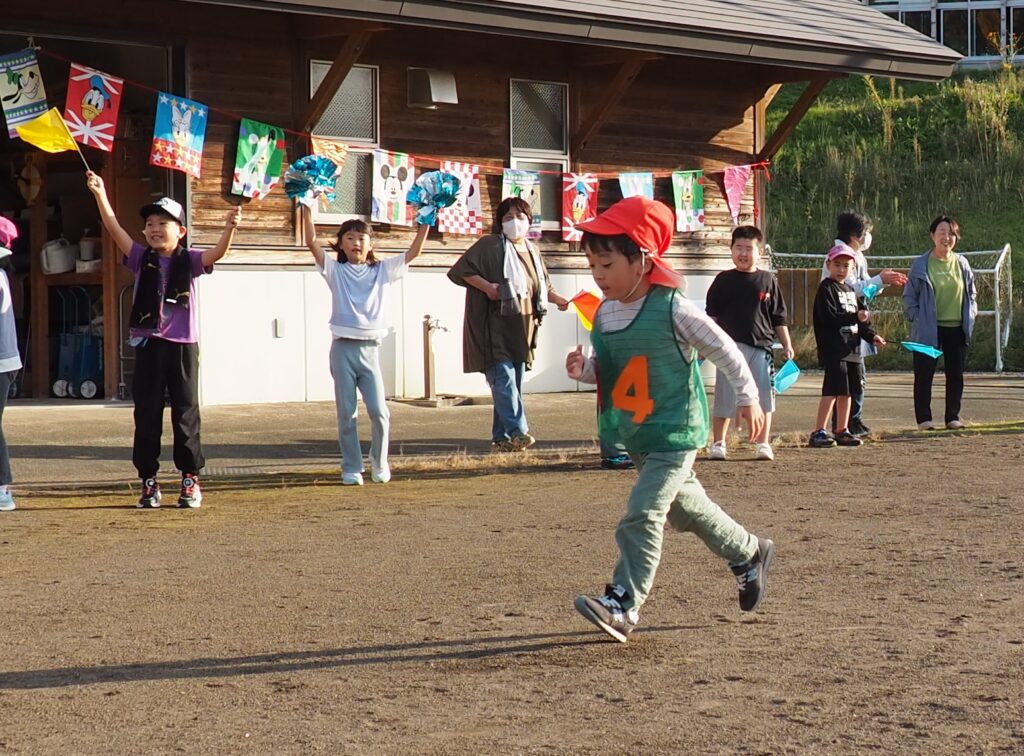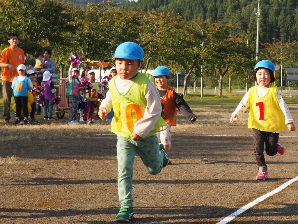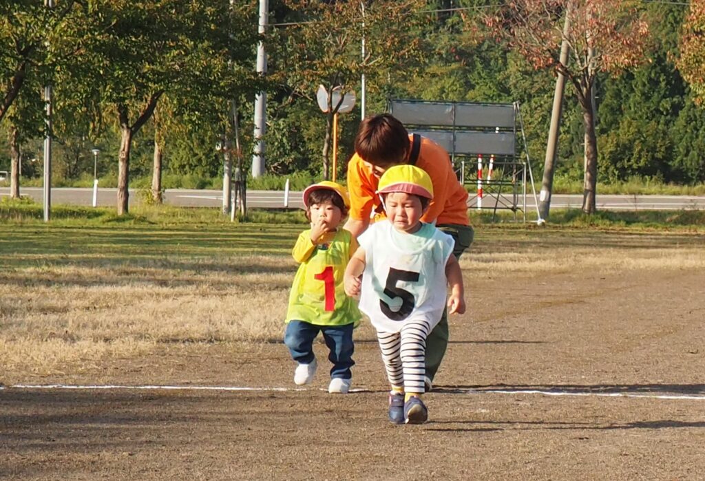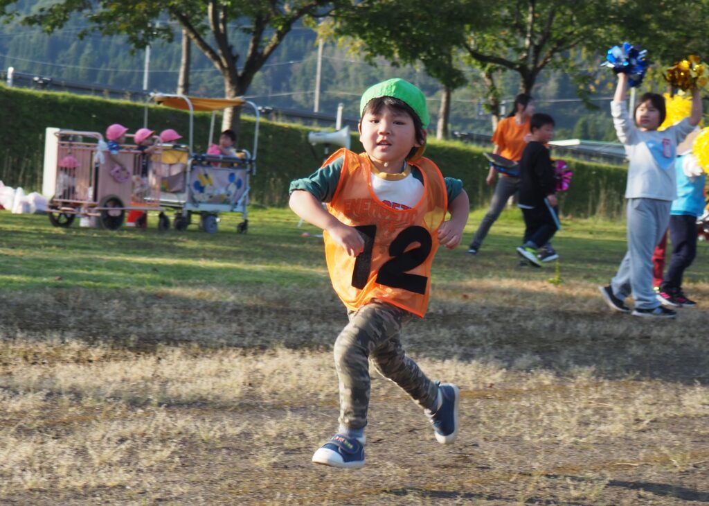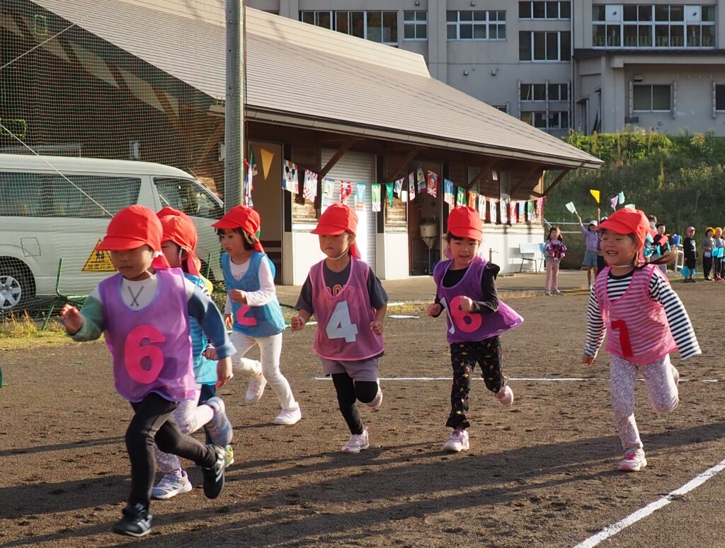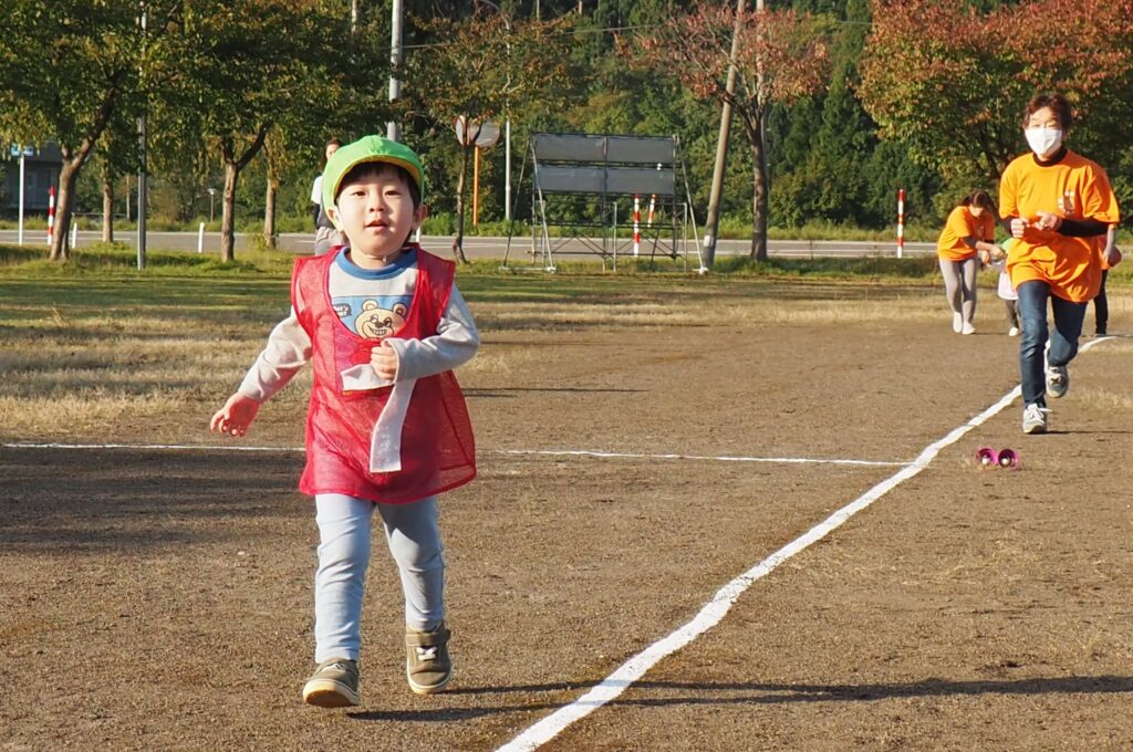 5歳児はトンボになりきって全員完走。マラソンに抵抗を感じていた子に、どうしたら楽しくゴールを目指せるのかみんなで考えました。トンボの羽に見立てた羽を付けると、まるでトンボになったように軽やかに走り、見事ゴール!担任のちよっとした工夫と応援の気持ちが、子どもたちの力を引き出しました。