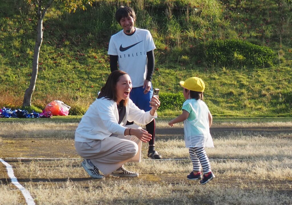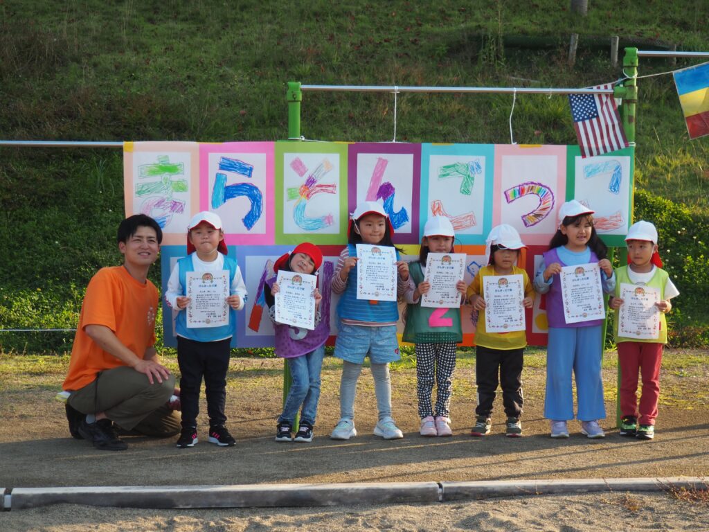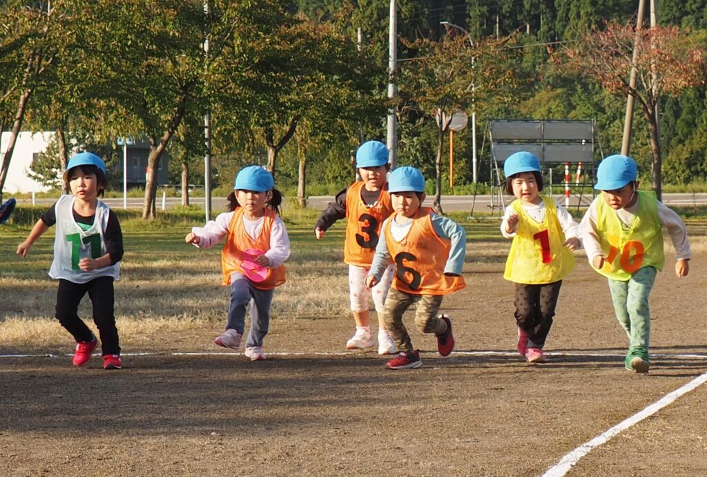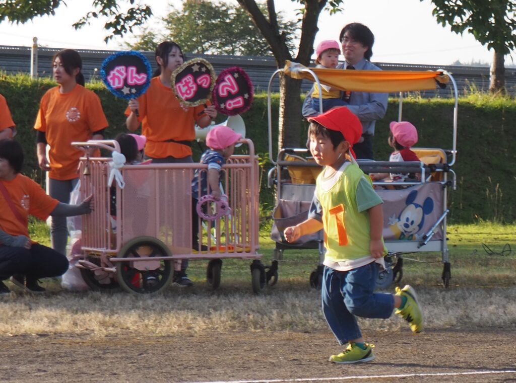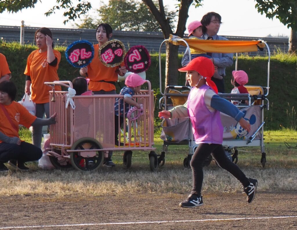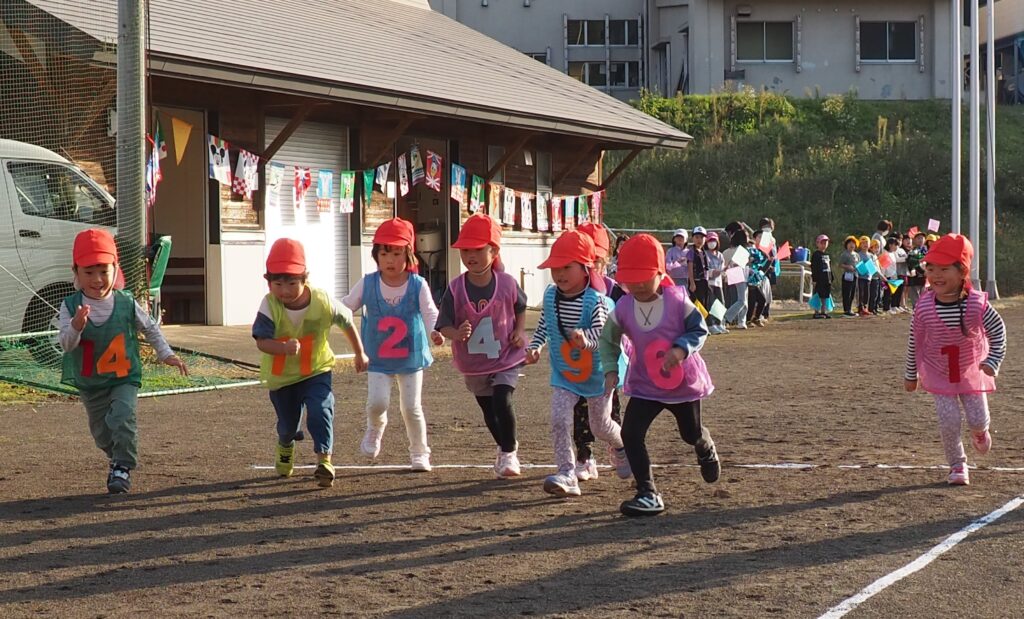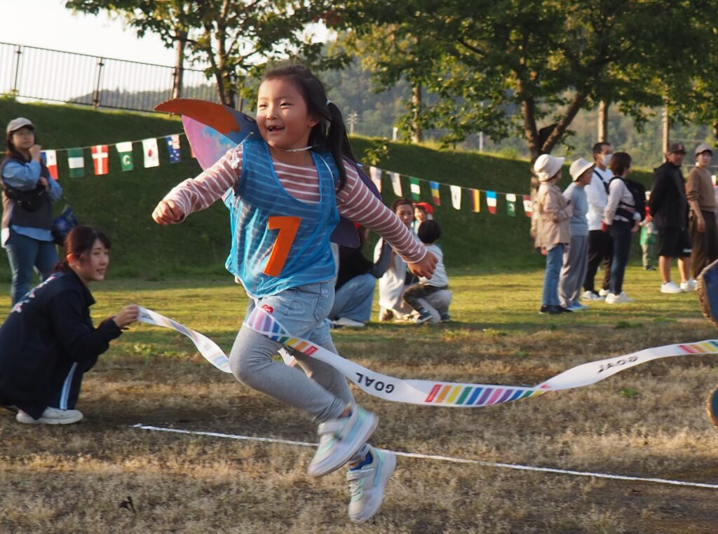 5歳児はトンボになりきって全員完走。マラソンに抵抗を感じていた子に、どうしたら楽しくゴールを目指せるのかみんなで考えました。トンボの羽に見立てた羽を付けると、まるでトンボになったように軽やかに走り、見事ゴール!担任のちよっとした工夫と応援の気持ちが、子どもたちの力を引き出しました。