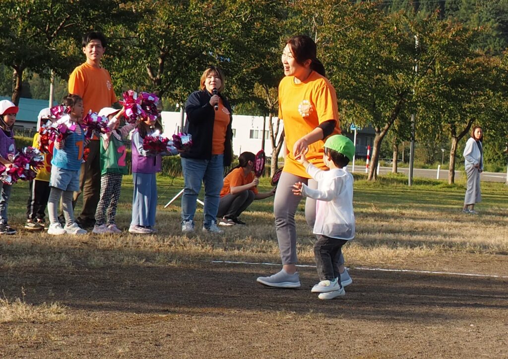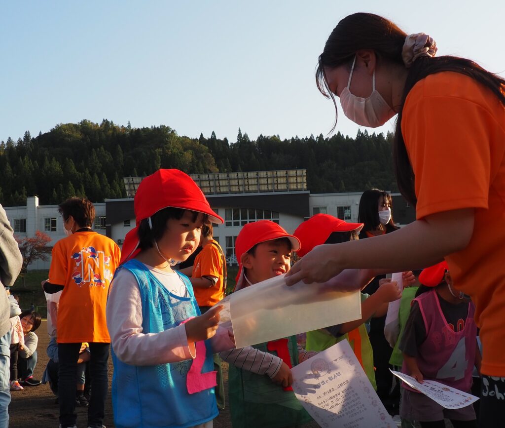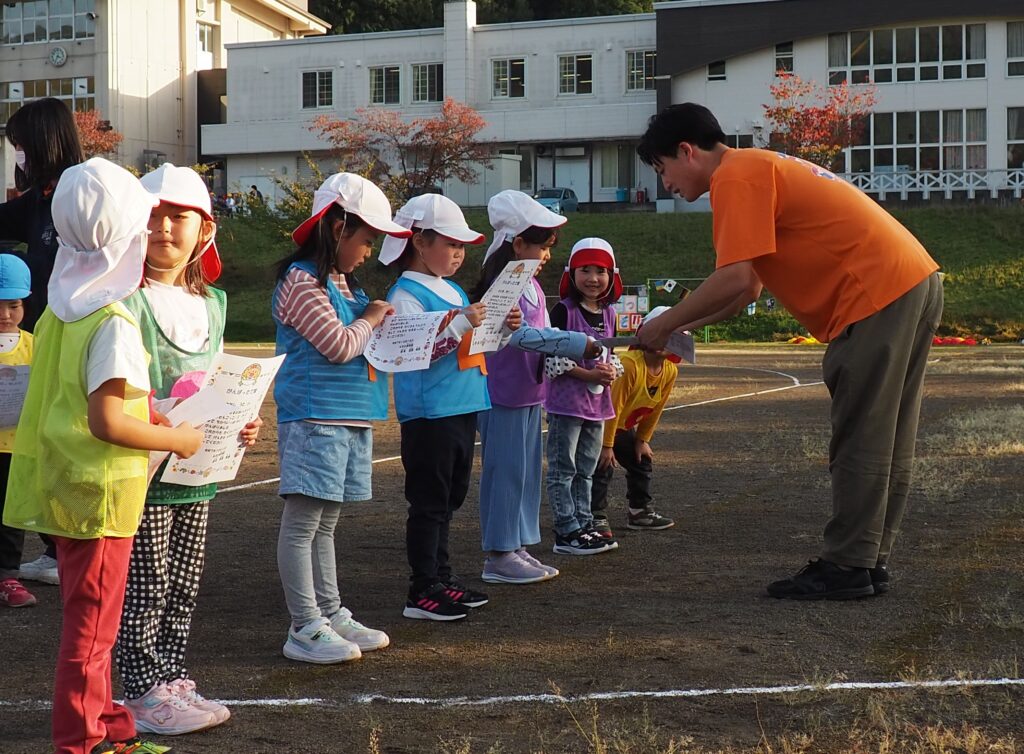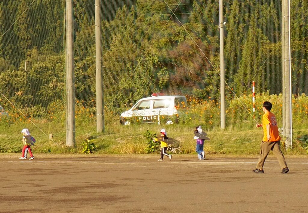 駐在さんが熊被害対策のためにパトカーを走らせながら見守ってくださいました。グラウンド周辺を何周もパトロールしながら子どもたちの安全を支えてくださったことに心より感謝いたします。また、役場からは音の鳴るものとして大太鼓とサイレン付き拡声器を貸していただいたことで、改めて地域に守られていることを実感する機会となりました。