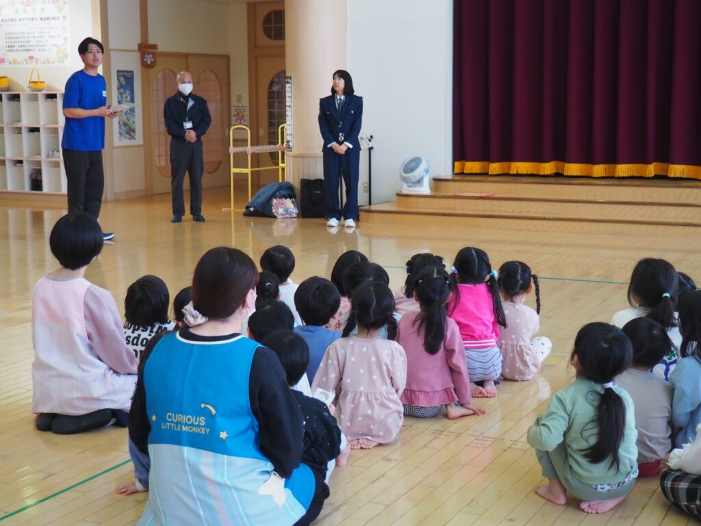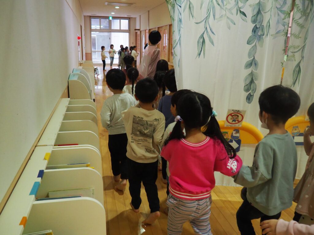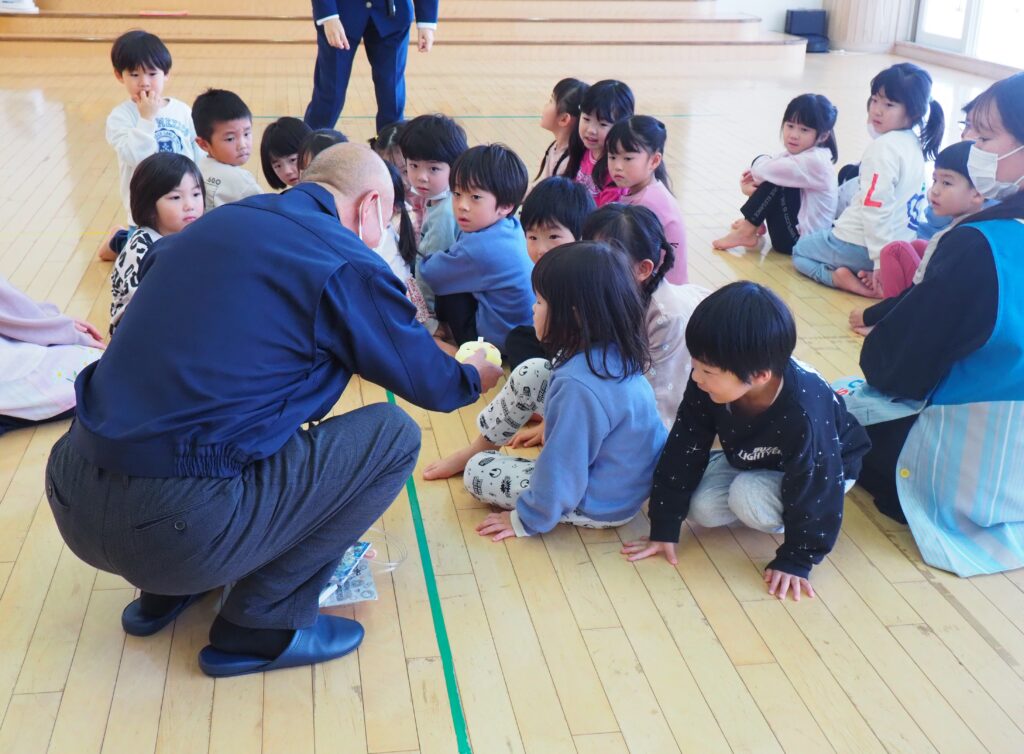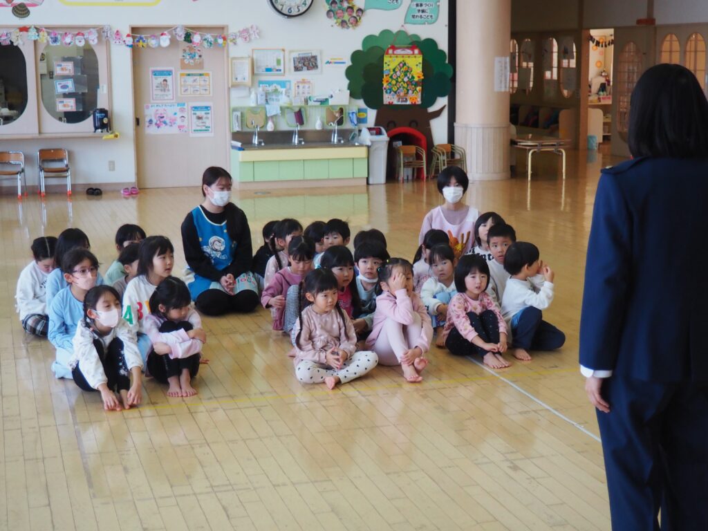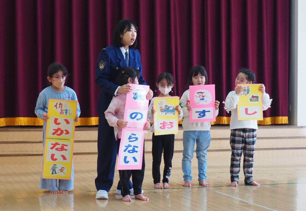 知らない人に声をかけられた場合を想定した模擬訓練を行いました。「おもちゃあげるから」という甘い言葉に、戸惑いながらも立ち止まり、、行かない選択をする子どもたち。その真剣な表情からは、自分を守ることを一生懸命考えるという成長した姿がみられました。小さな心の中で、大切な判断力が育っています。
