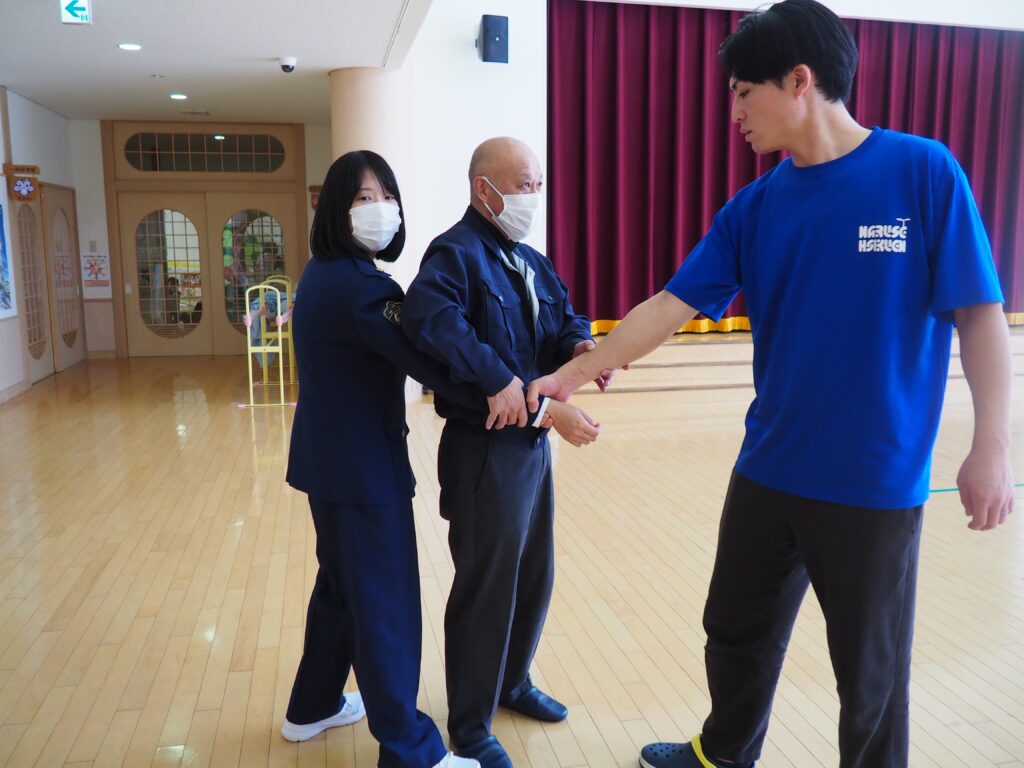 不審者対応を想定し、護身の基本を学びました。距離を保ち、相手を刺激せず、職員同士が連携することの重要性を確認する実践的な訓練となりました。