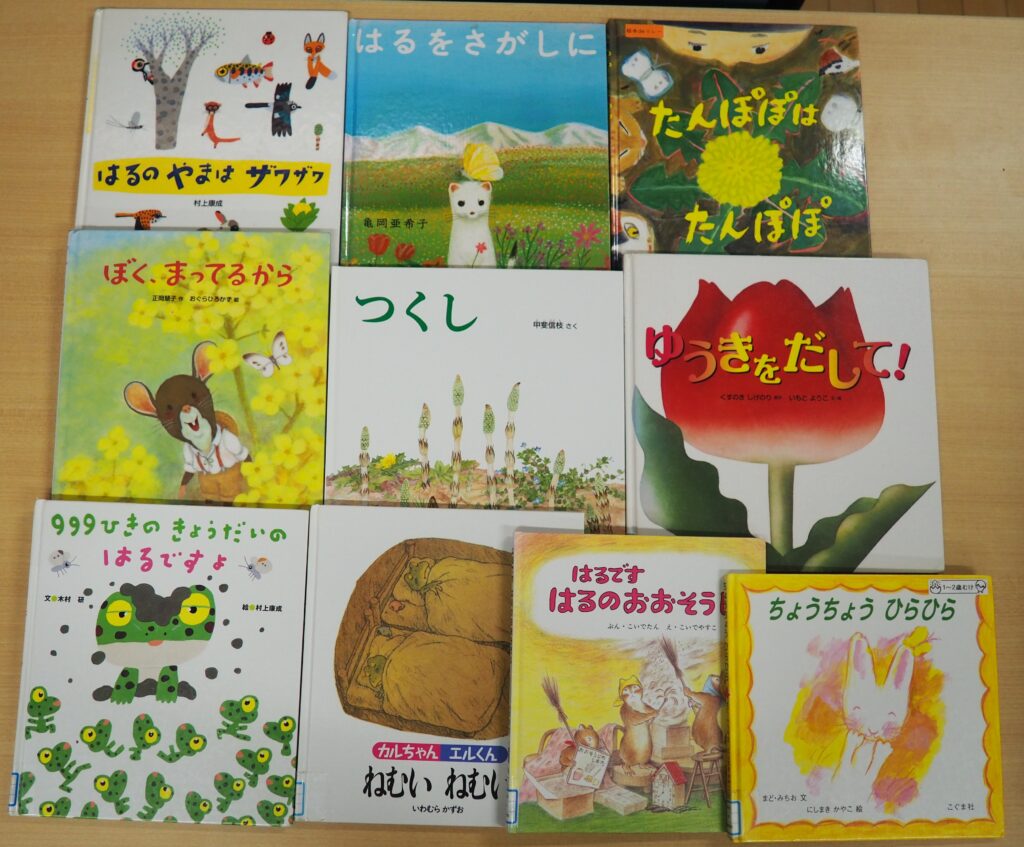 「ミニミニ探検隊」で使用される絵本は、児童館の図書担当職員の方が、図書館にある絵本の中から、毎月テーマに沿ってよりすぐりの絵本を選書してくださっており、大いに役立っています。