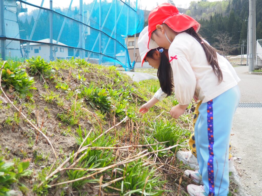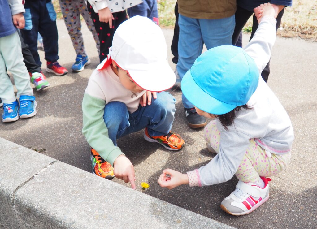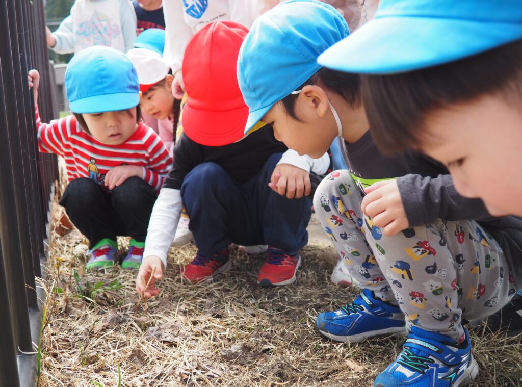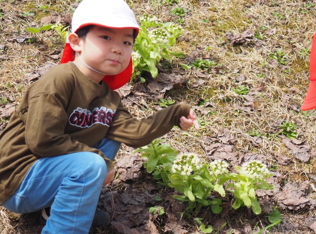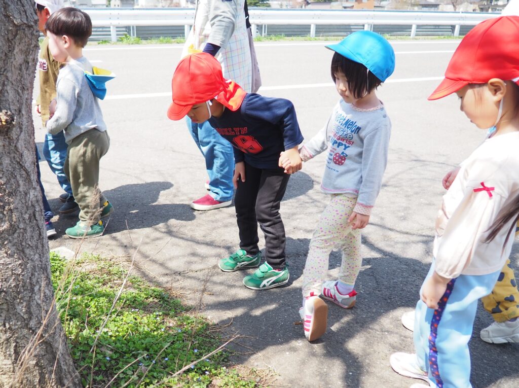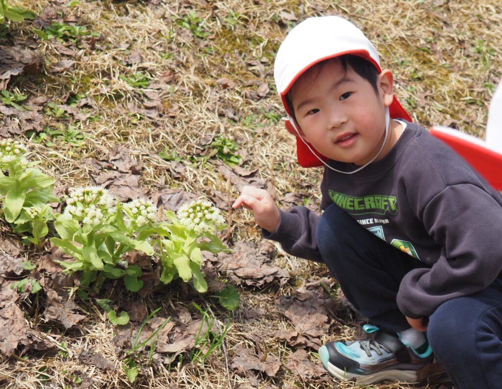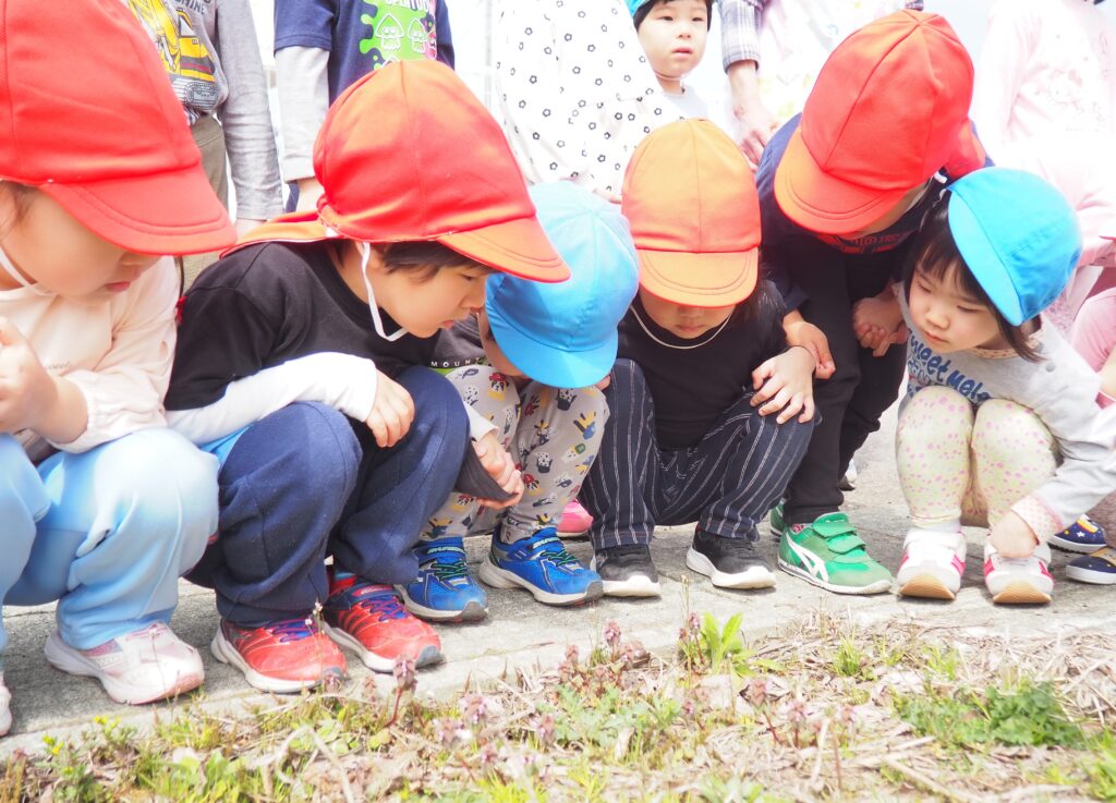 今年度からスタートした「ミニミニ探検隊」は、子どもたちの身近な世界への興味関心を広げることを目的に、子ども一人一人の気づきや好奇心を大切にしながら、見つける楽しさ・感じる喜びを味わえるような時間にしたいと思っています。今月のねらいは、「季節の変化に気づく」「小さな発見を楽しむ」です。