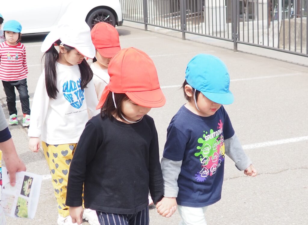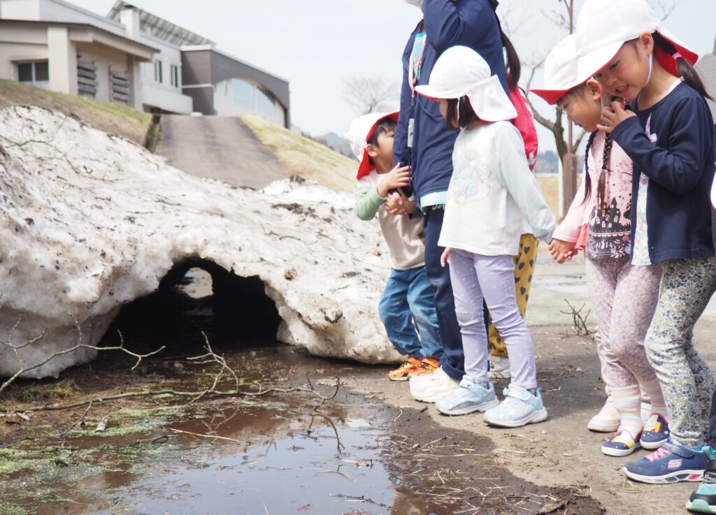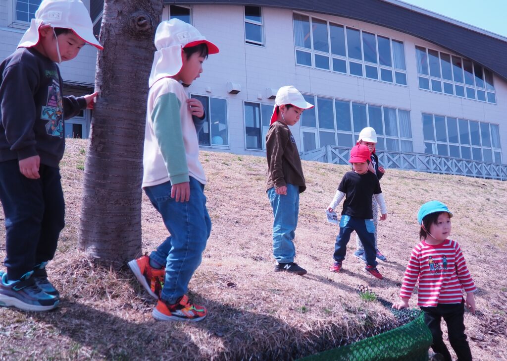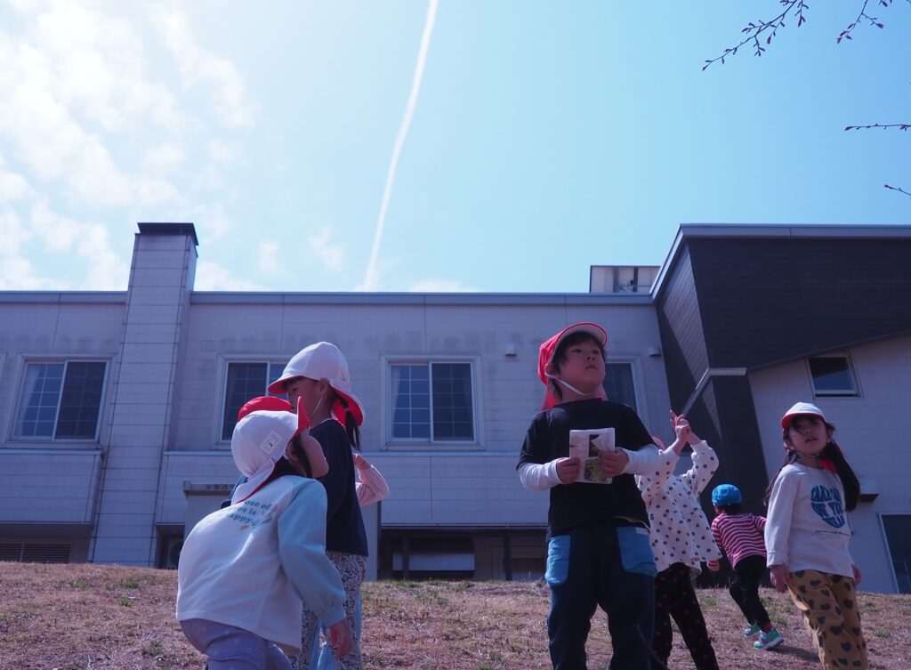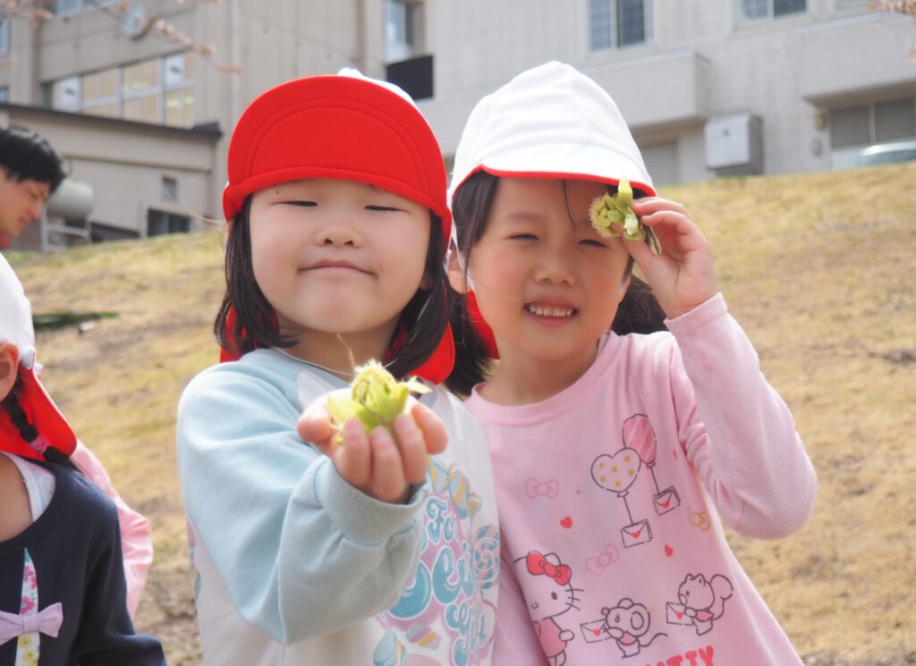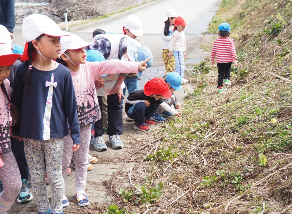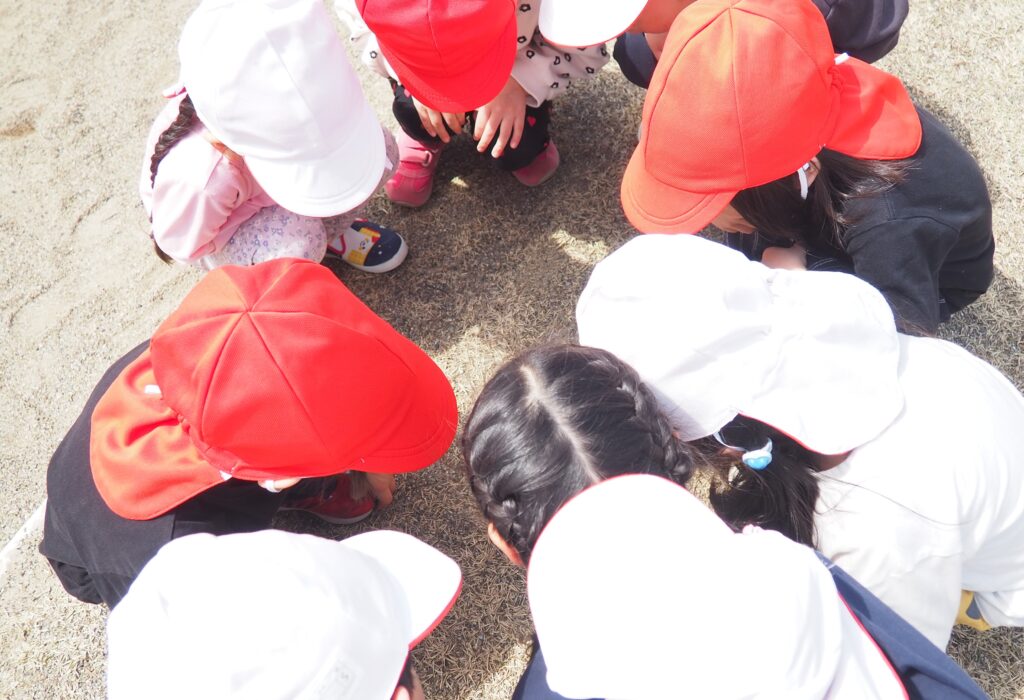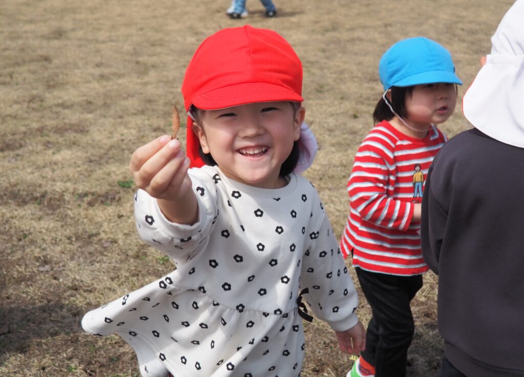 今年度からスタートした「ミニミニ探検隊」は、子どもたちの身近な世界への興味関心を広げることを目的に、子ども一人一人の気づきや好奇心を大切にしながら、見つける楽しさ・感じる喜びを味わえるような時間にしたいと思っています。今月のねらいは、「季節の変化に気づく」「小さな発見を楽しむ」です。