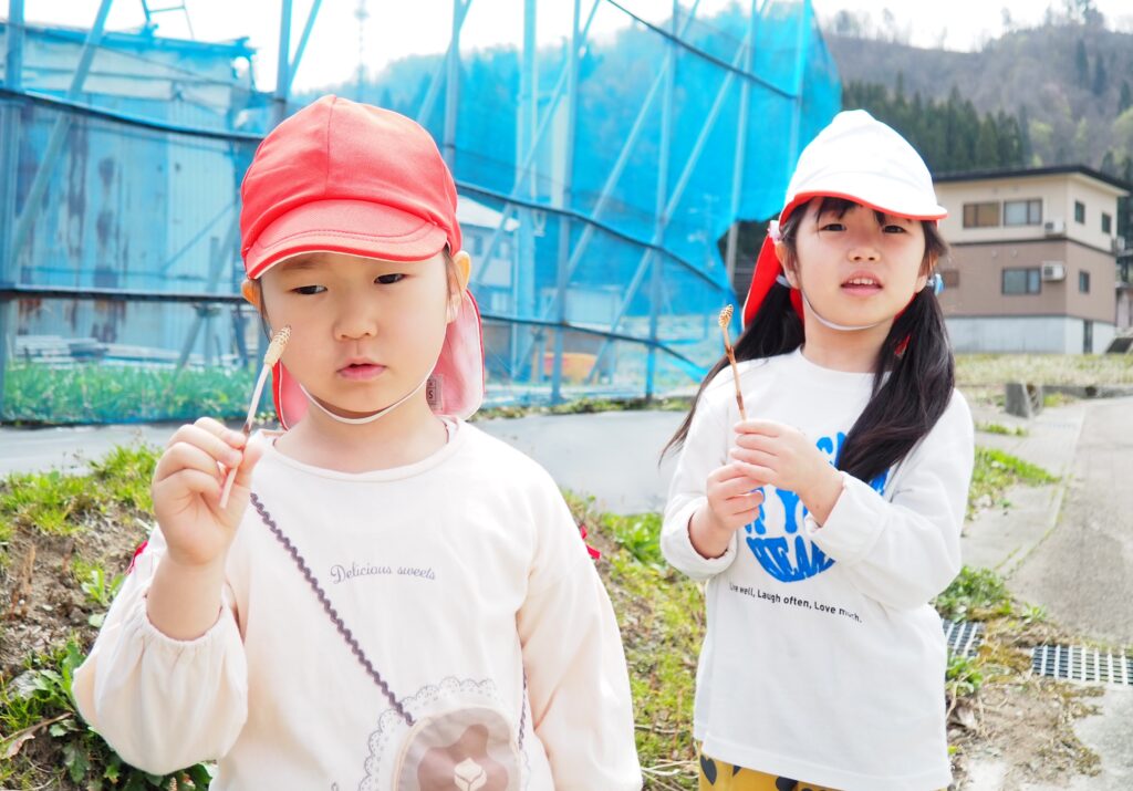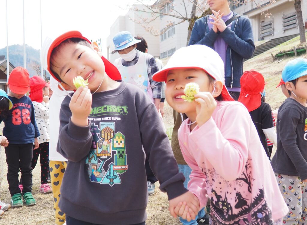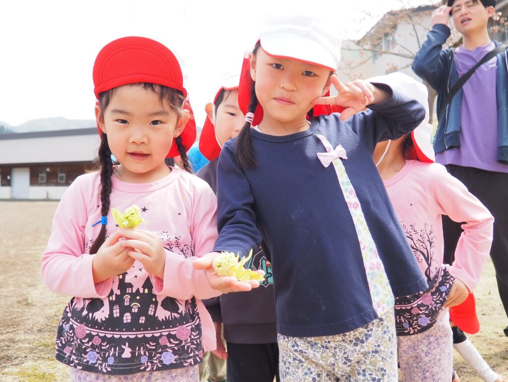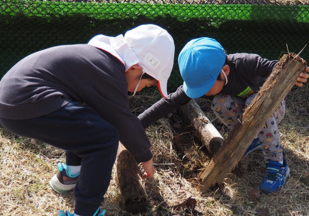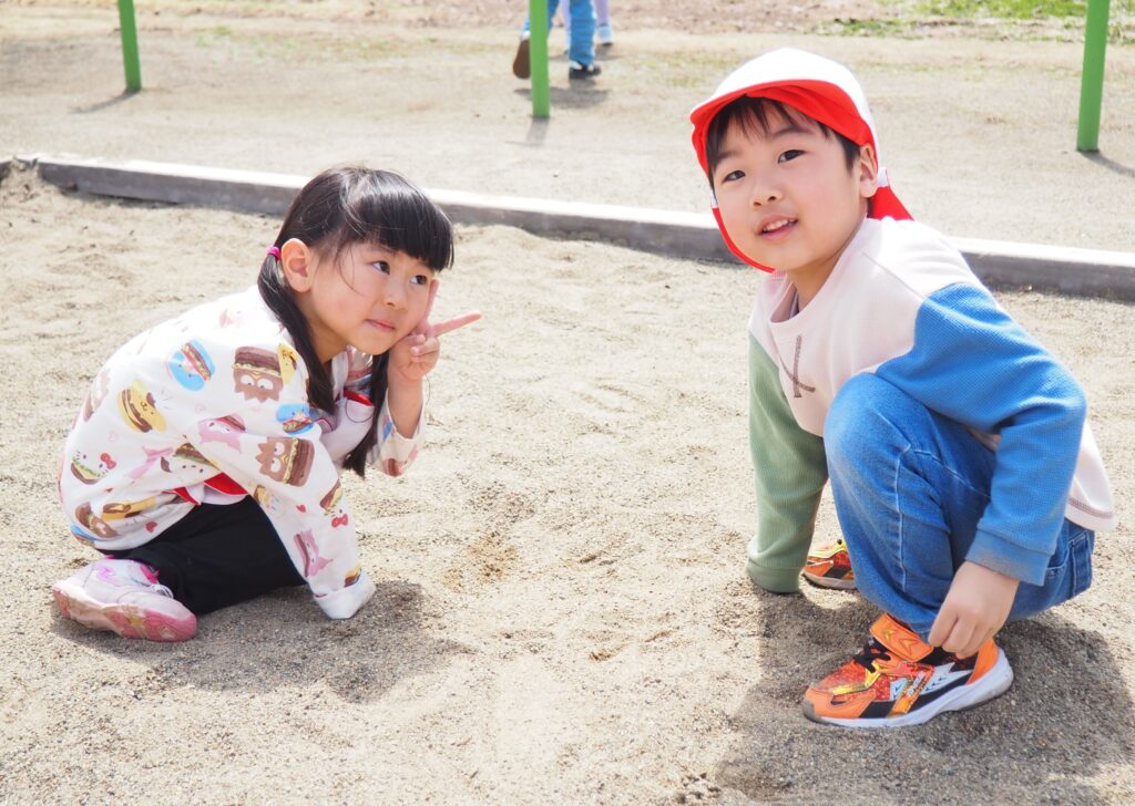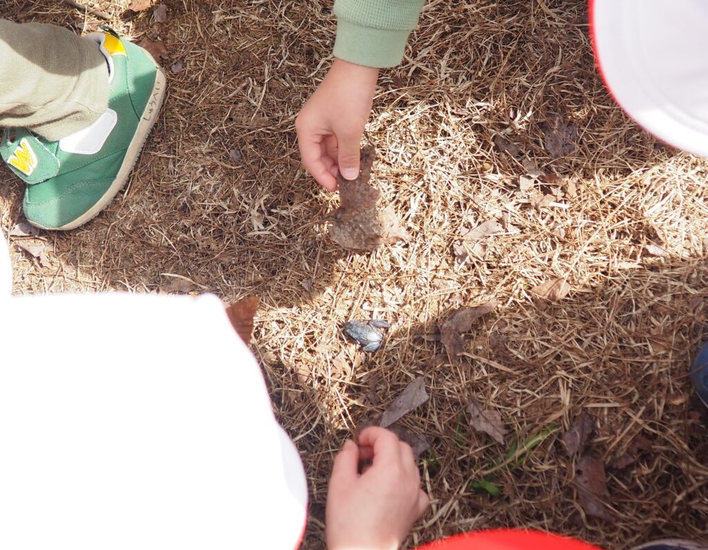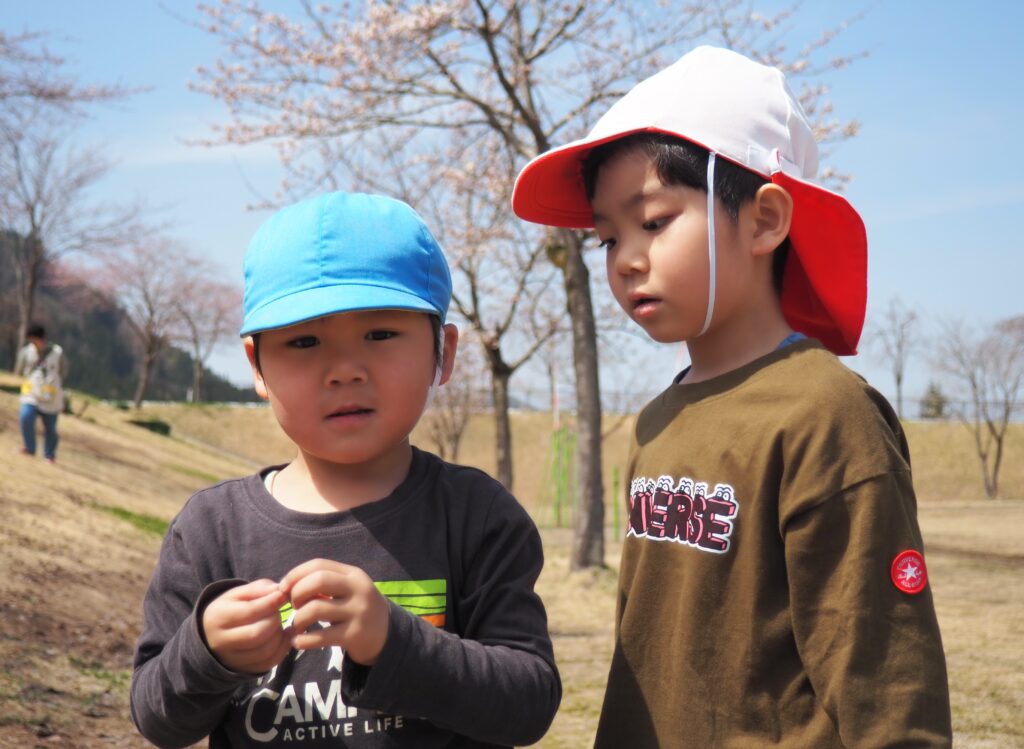 今年度からスタートした「ミニミニ探検隊」は、子どもたちの身近な世界への興味関心を広げることを目的に、子ども一人一人の気づきや好奇心を大切にしながら、見つける楽しさ・感じる喜びを味わえるような時間にしたいと思っています。今月のねらいは、「季節の変化に気づく」「小さな発見を楽しむ」です。