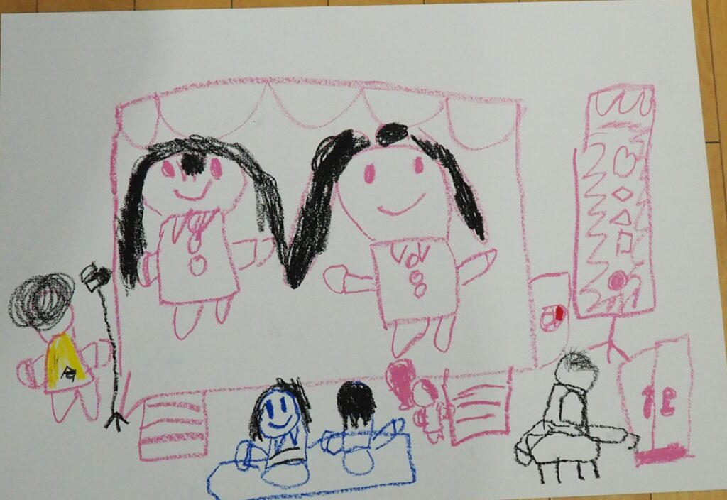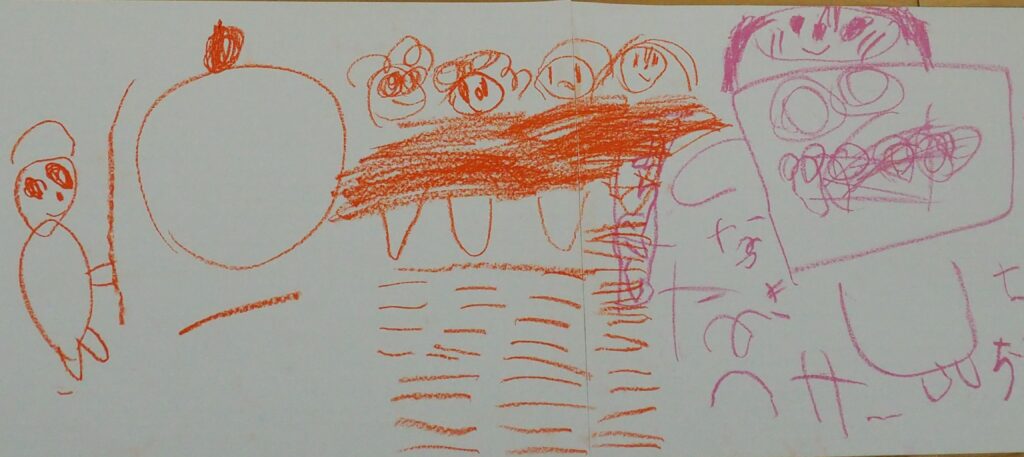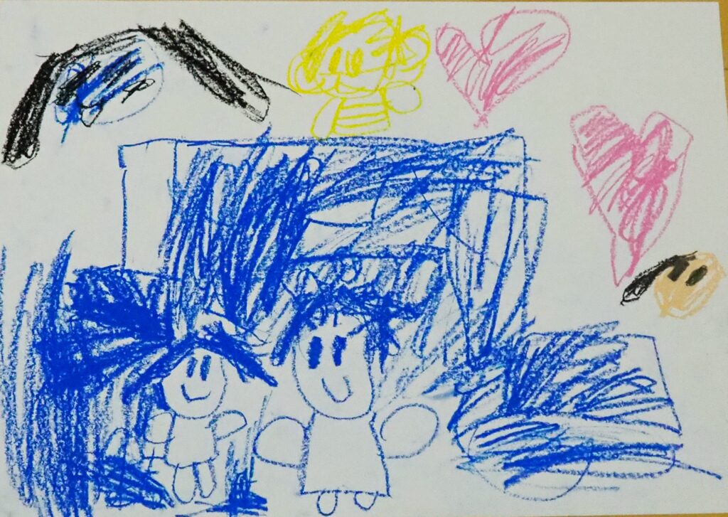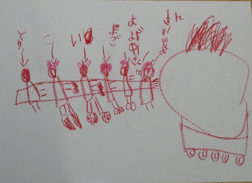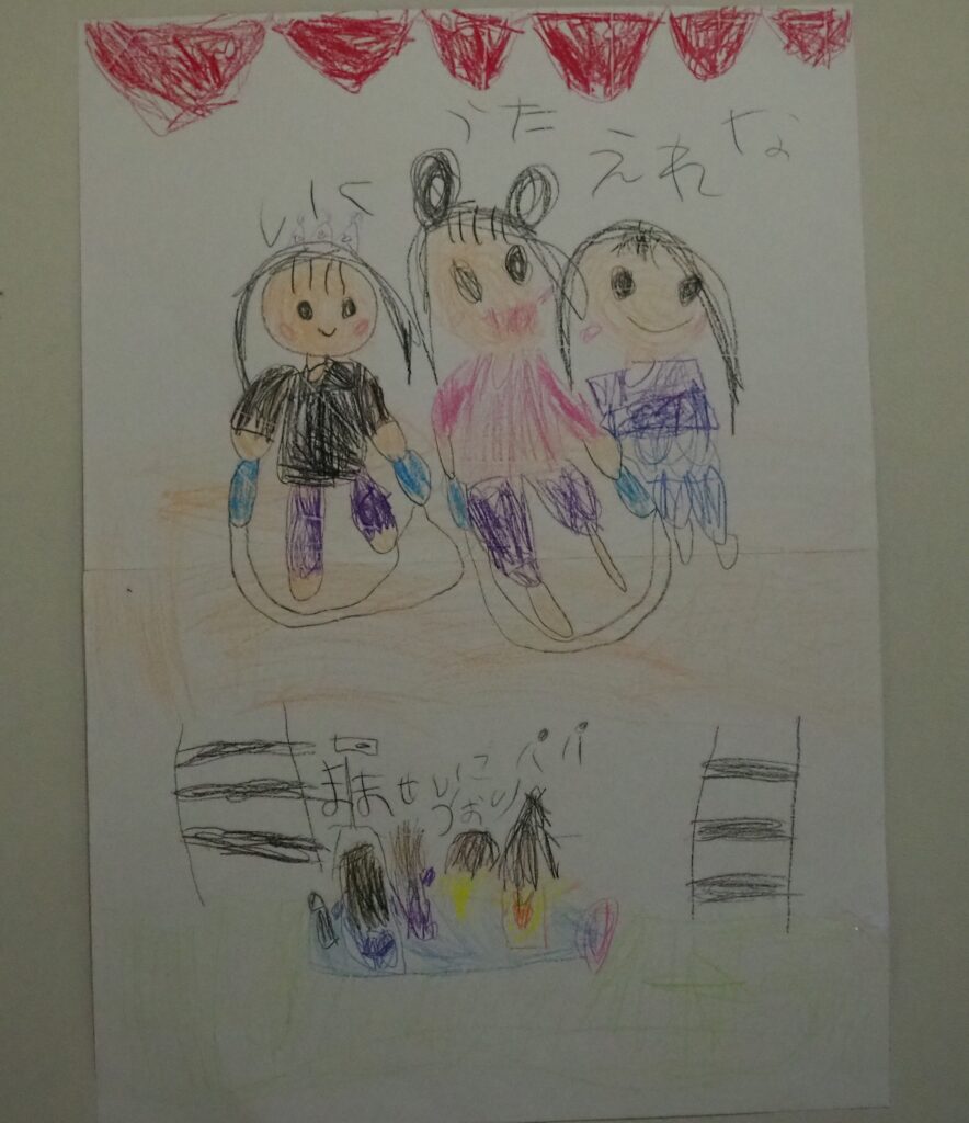 廊下の壁面に子どもたちが描いた「なかよし発表会」の絵を展示しておりますので、ご覧ください!