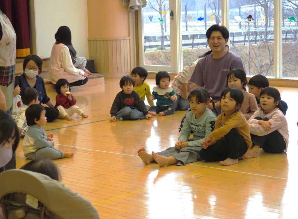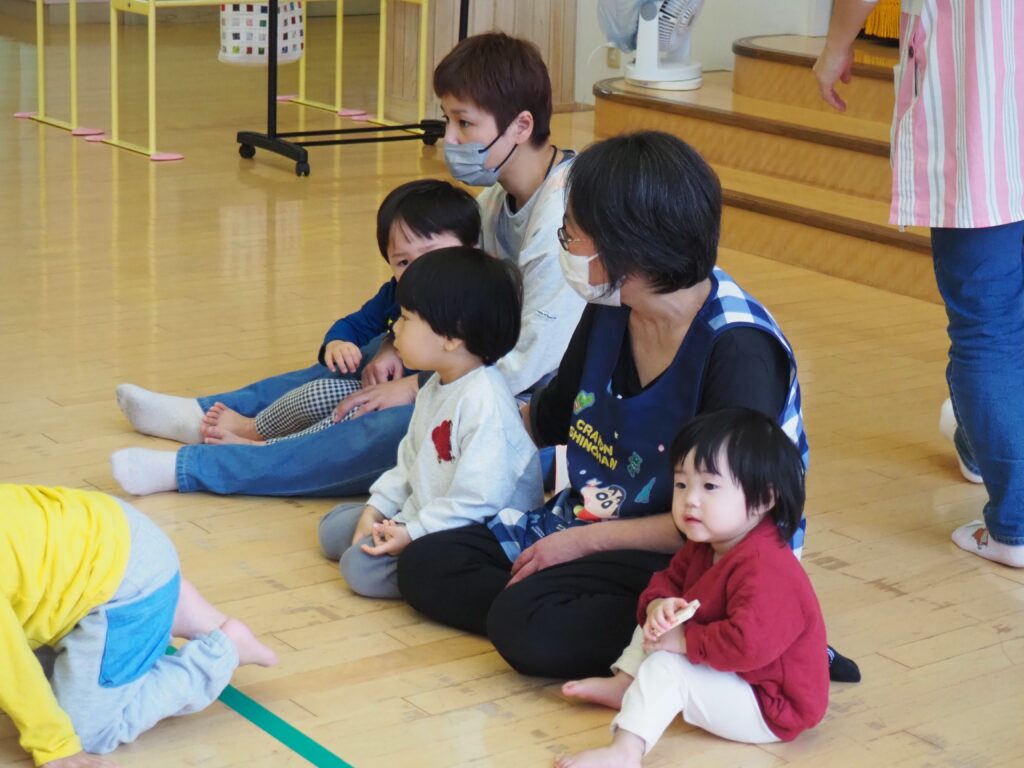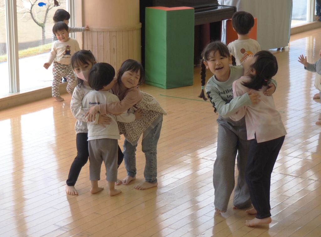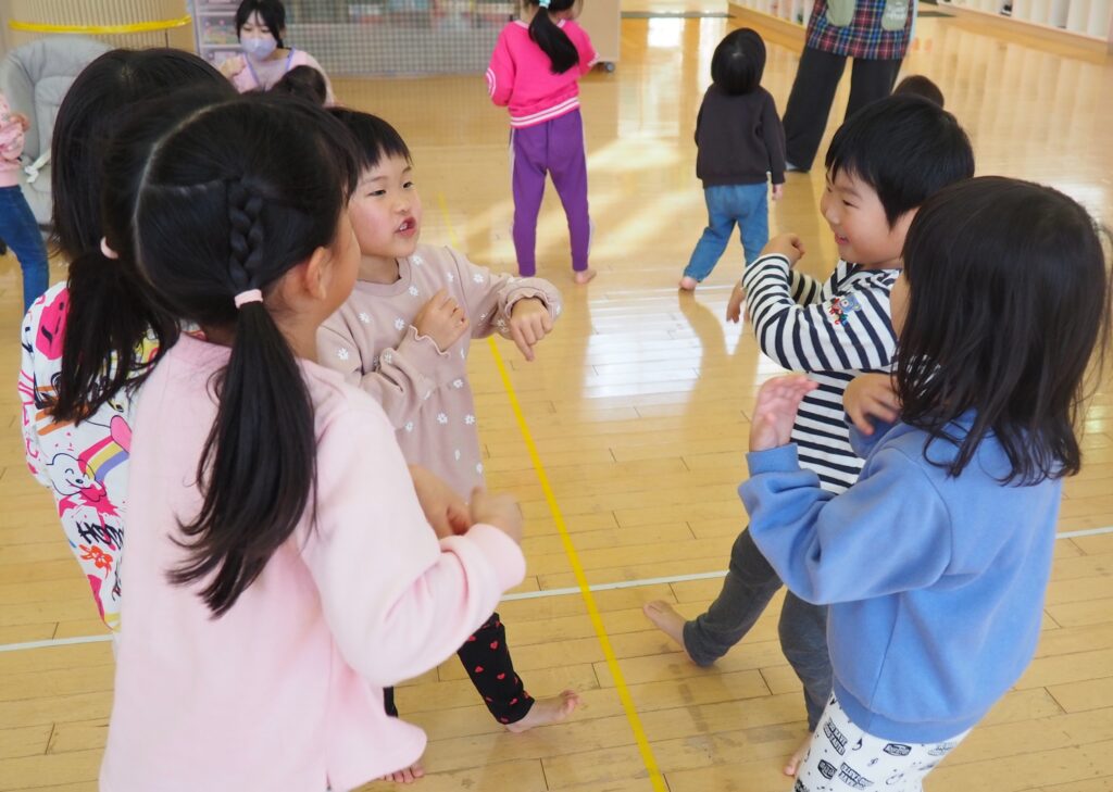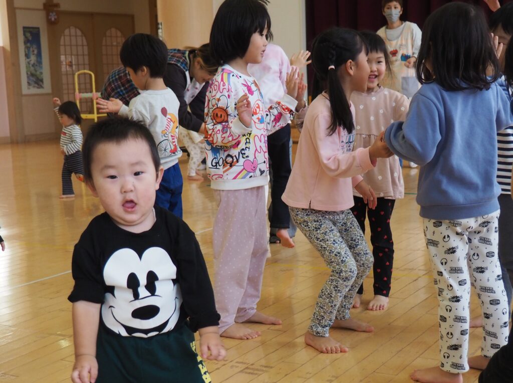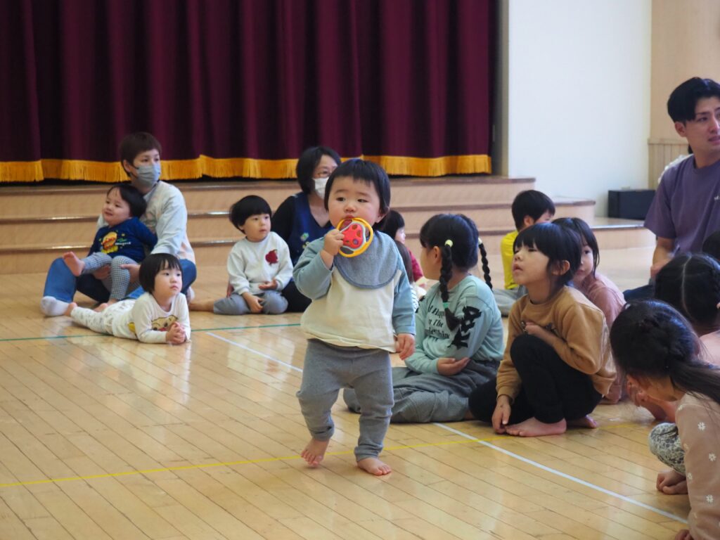 途中入園の0歳児1名を祝う会を行いました。みんなで「むすんでひらいて」「ハグしちゃお」を踊って楽しみました。