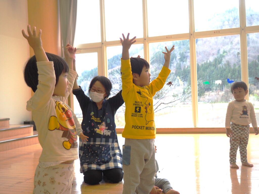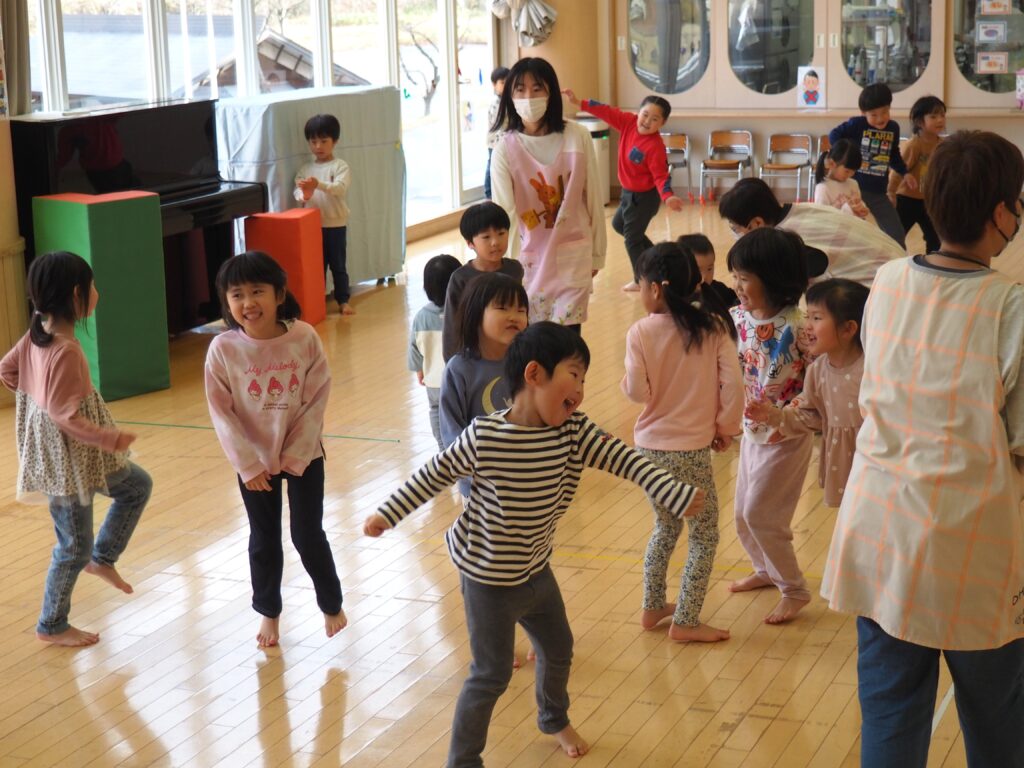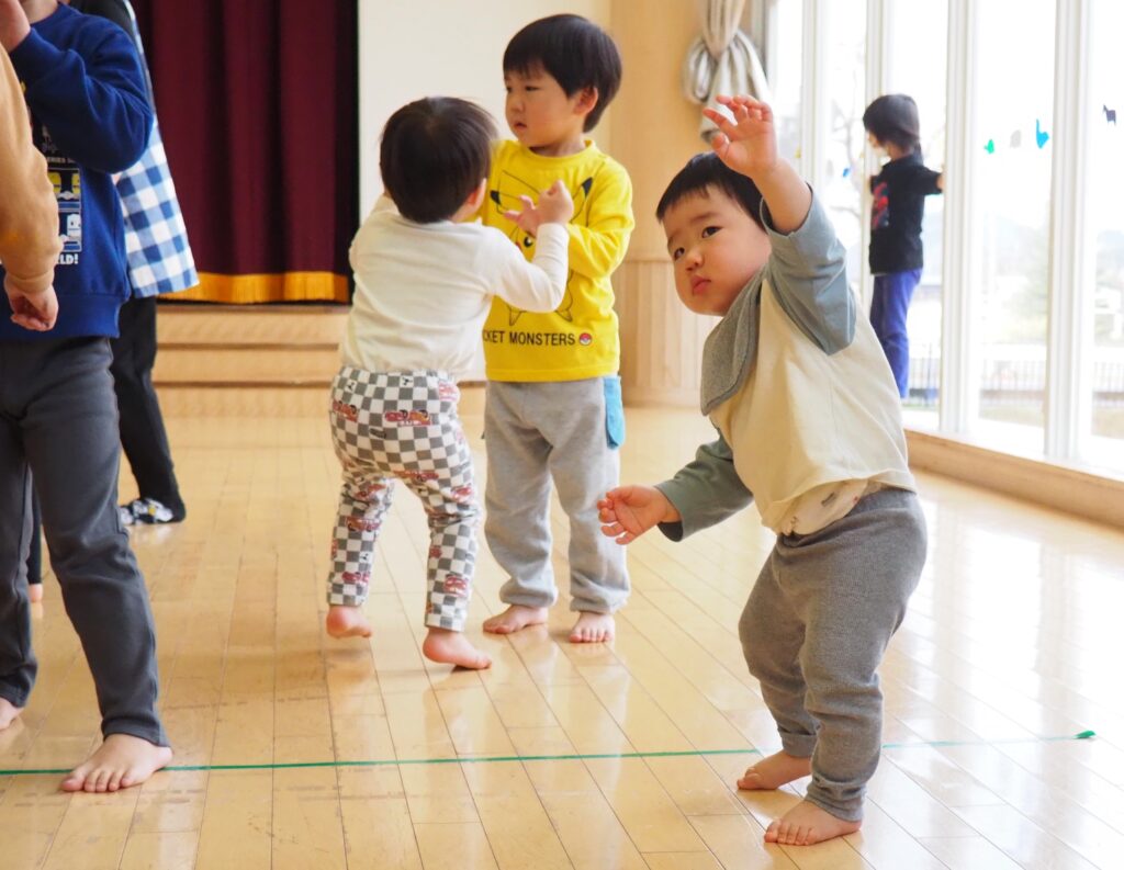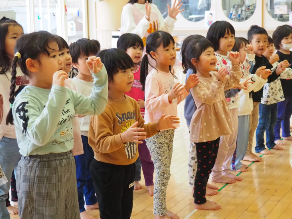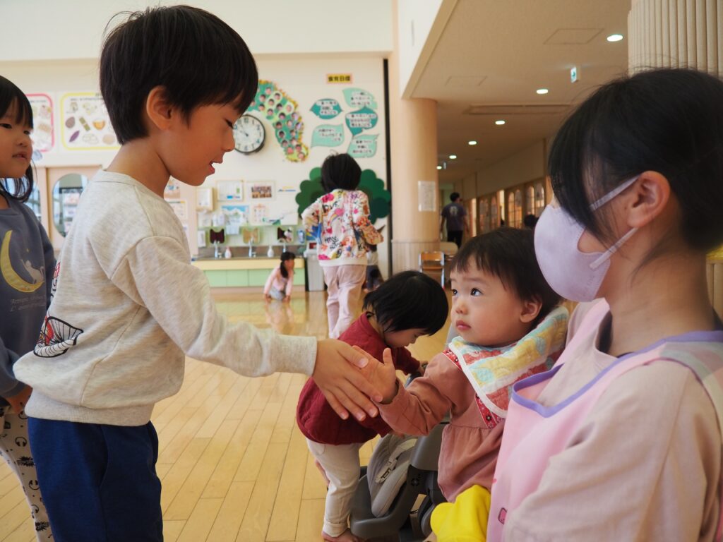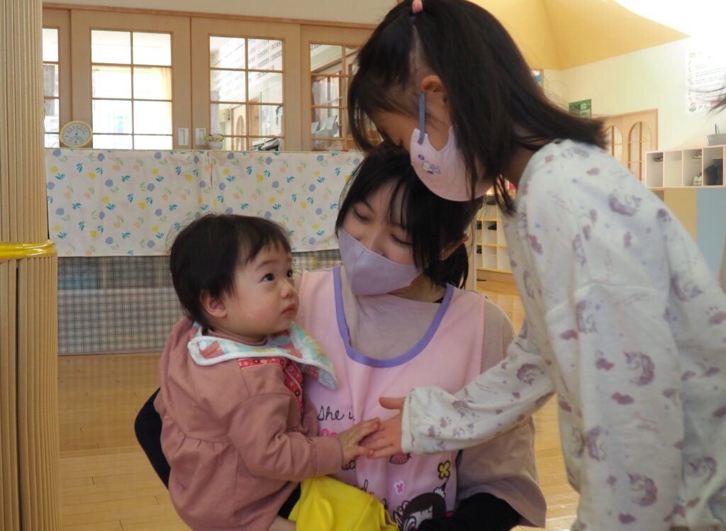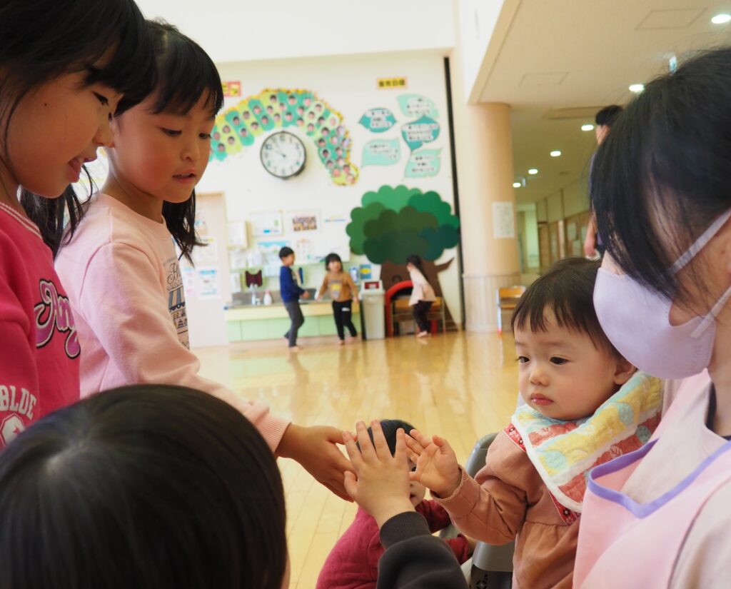 途中入園の0歳児1名を祝う会を行いました。みんなで「むすんでひらいて」「ハグしちゃお」を踊って楽しみました。