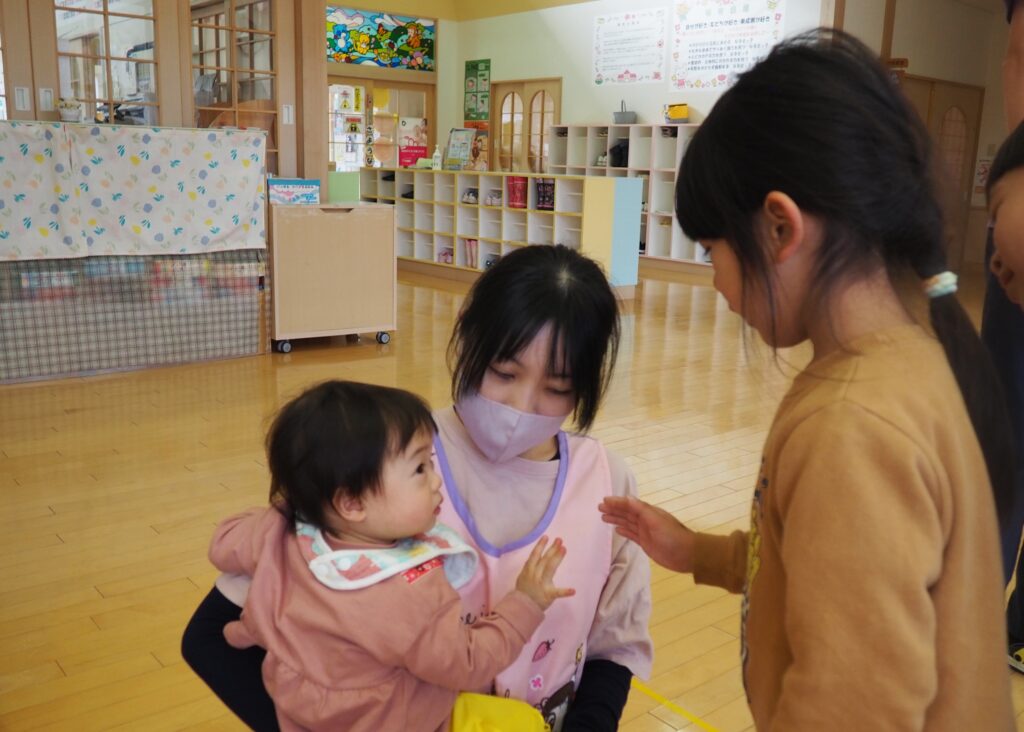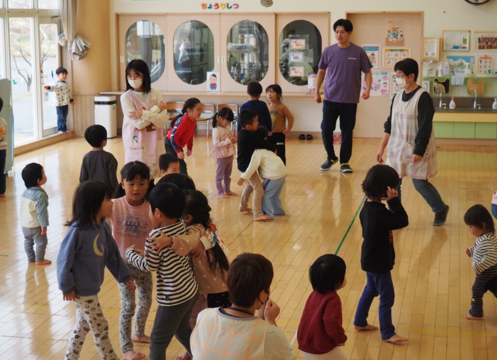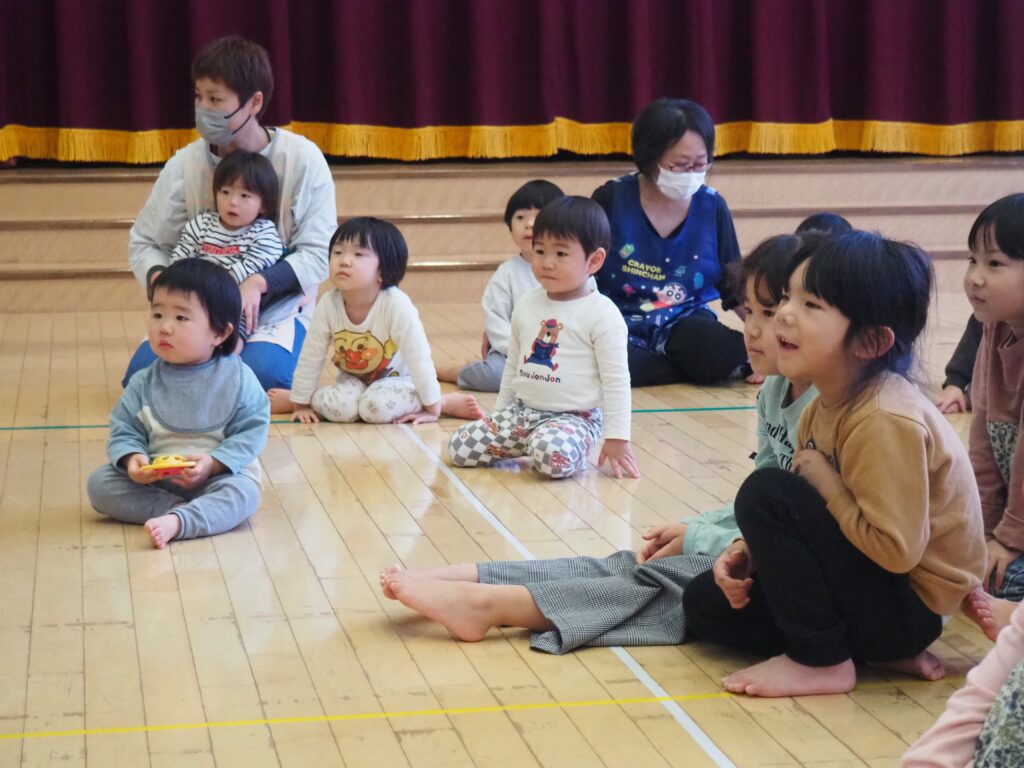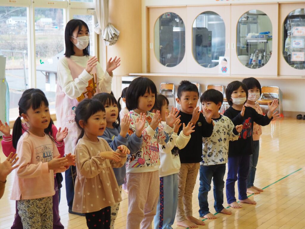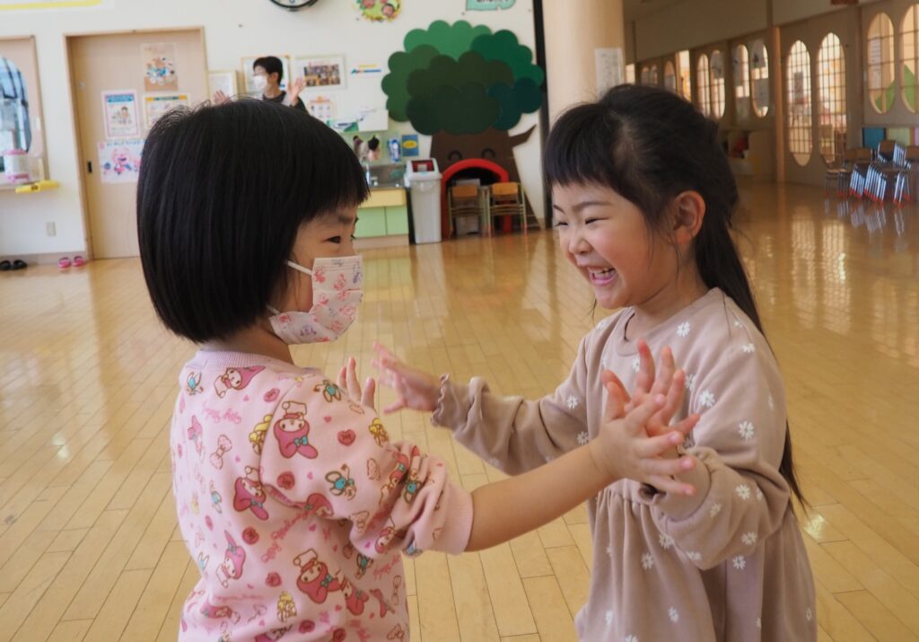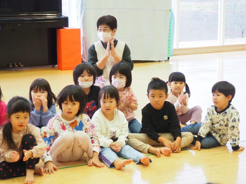 途中入園の0歳児1名を祝う会を行いました。みんなで「むすんでひらいて」「ハグしちゃお」を踊って楽しみました。