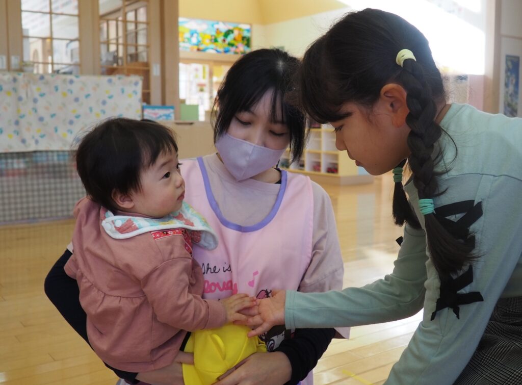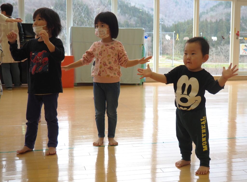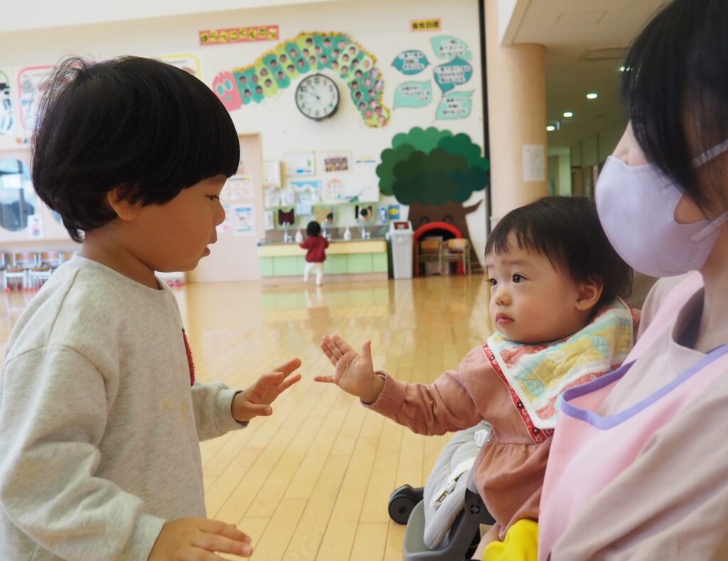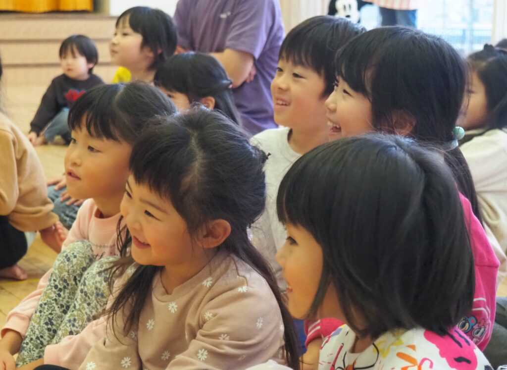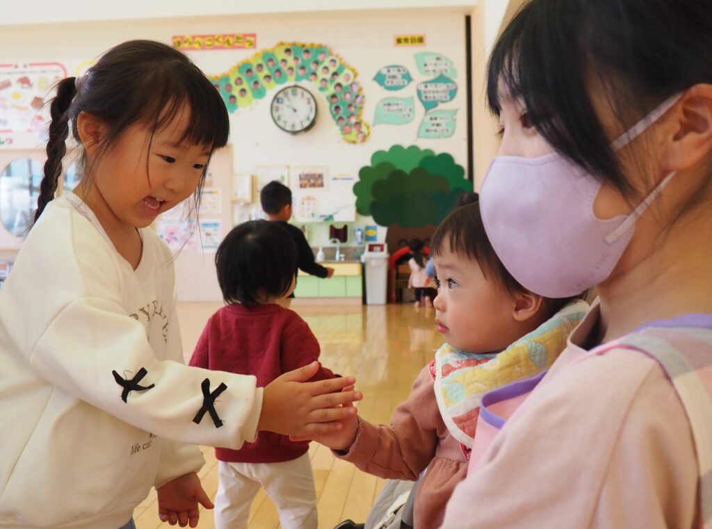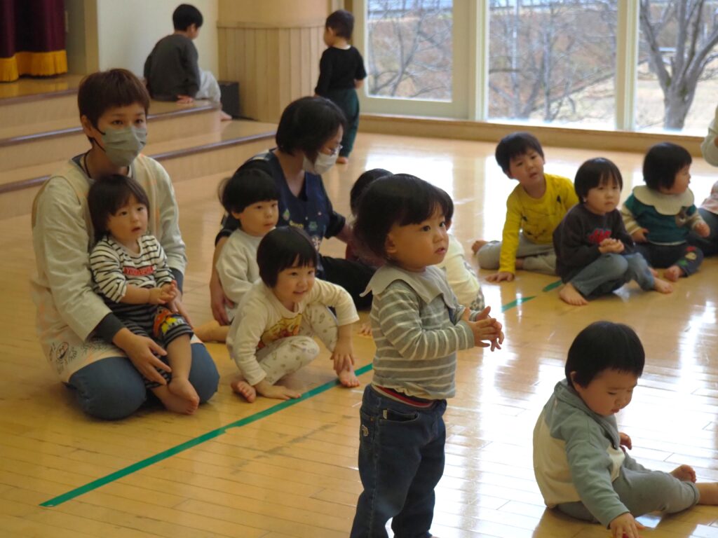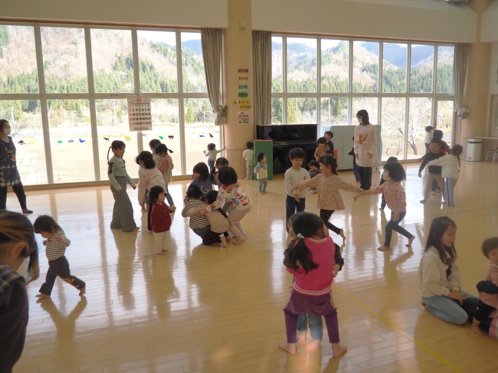 途中入園の0歳児1名を祝う会を行いました。みんなで「むすんでひらいて」「ハグしちゃお」を踊って楽しみました。