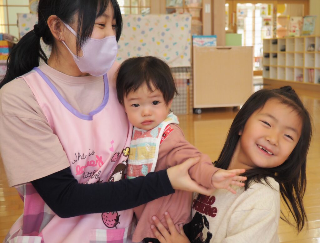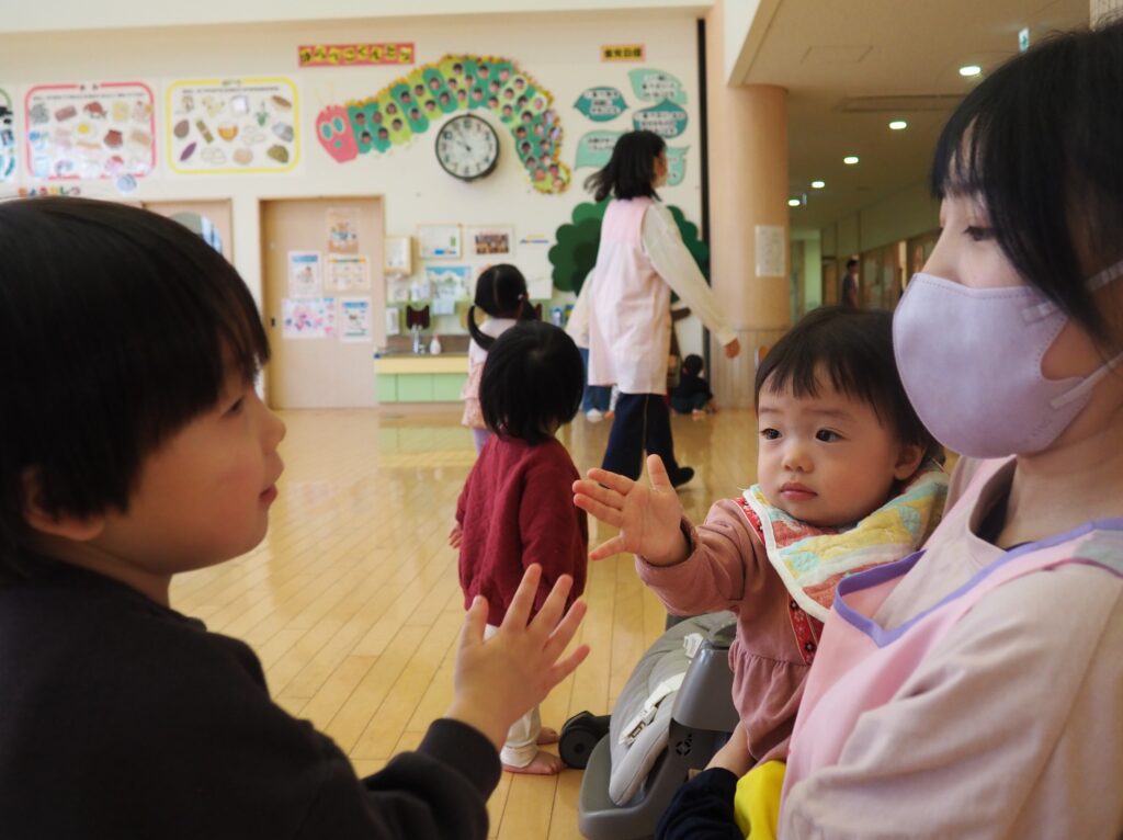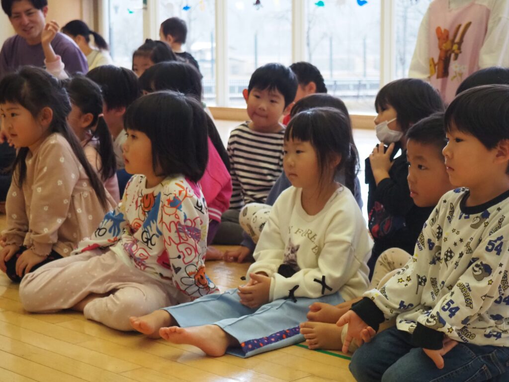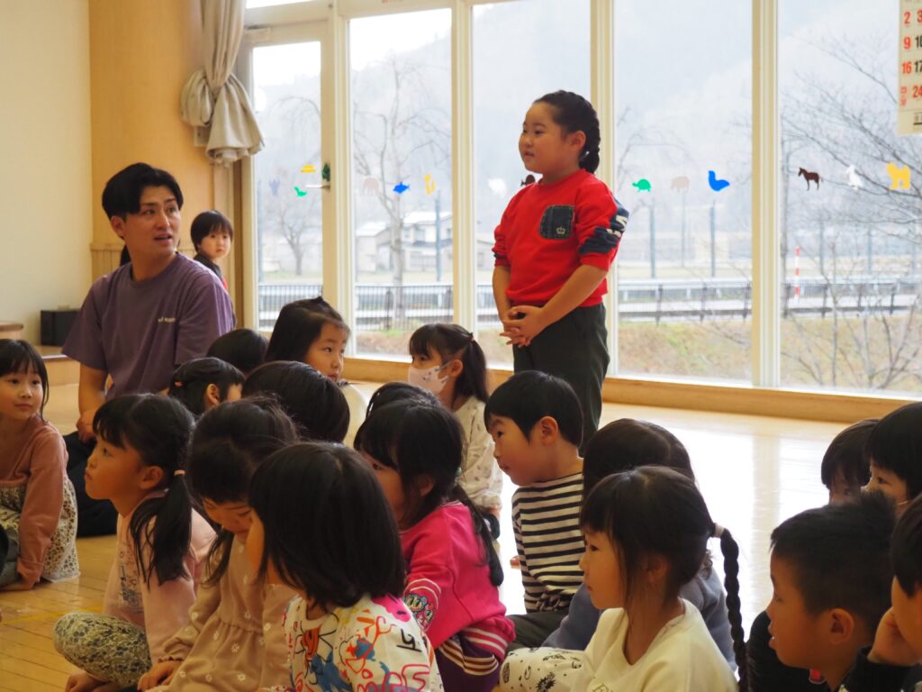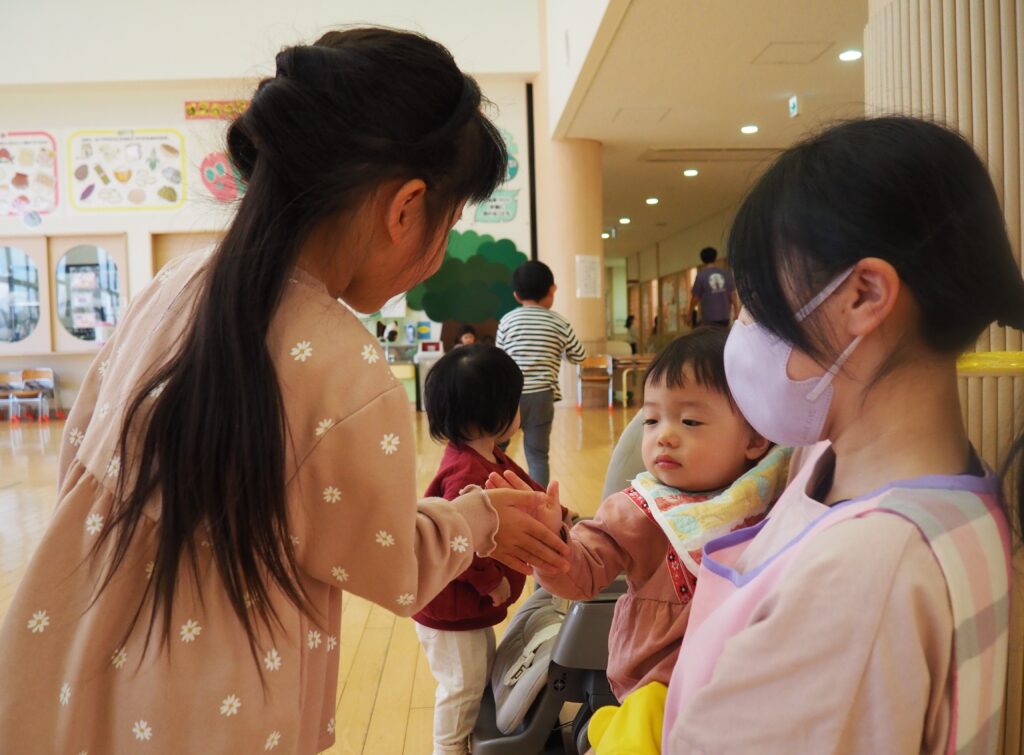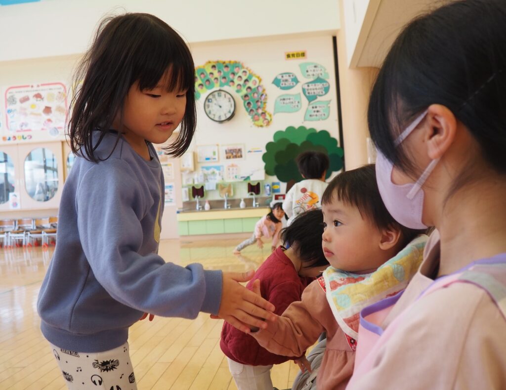 途中入園の0歳児1名を祝う会を行いました。みんなで「むすんでひらいて」「ハグしちゃお」を踊って楽しみました。