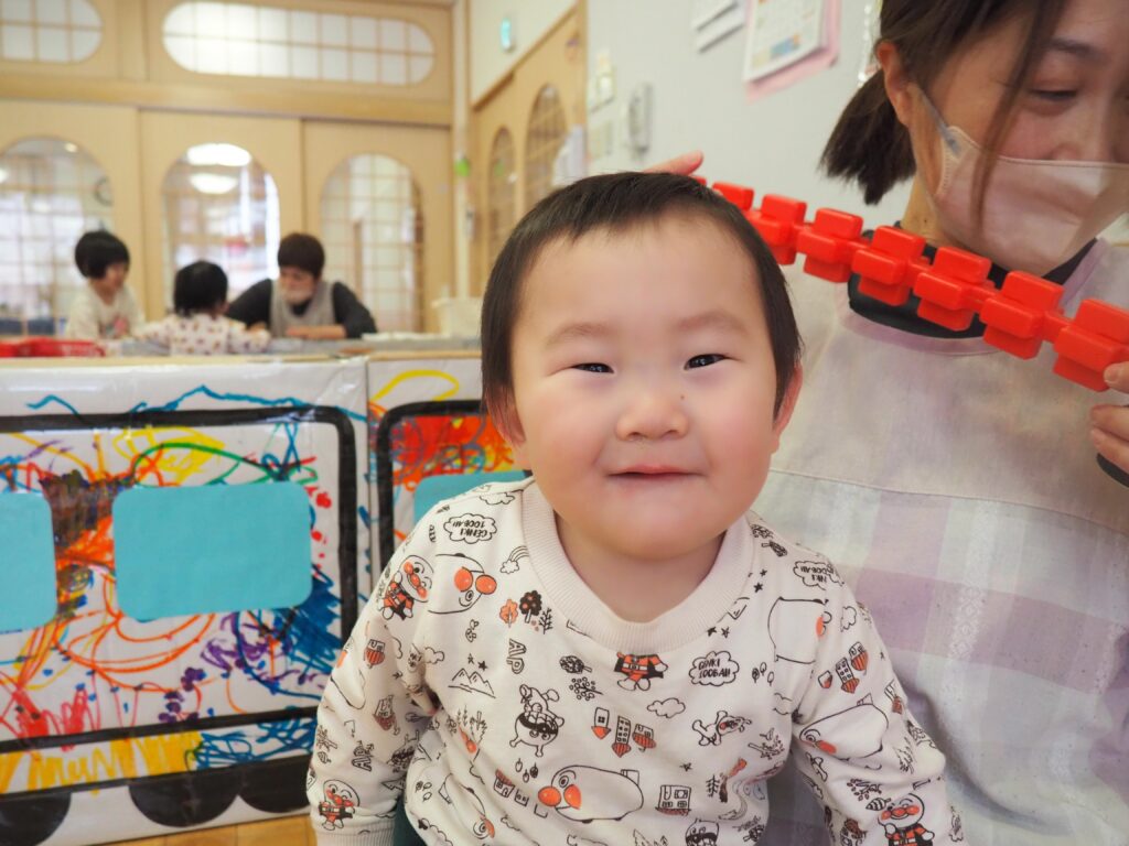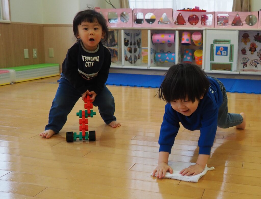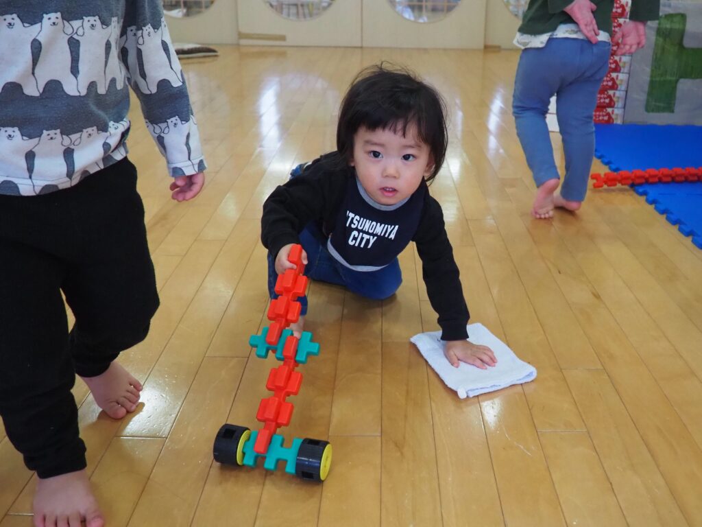 未満児のお部屋では、ブロックで作った掃除機で見立て遊びをしながら、お掃除気分を楽しんでいました。