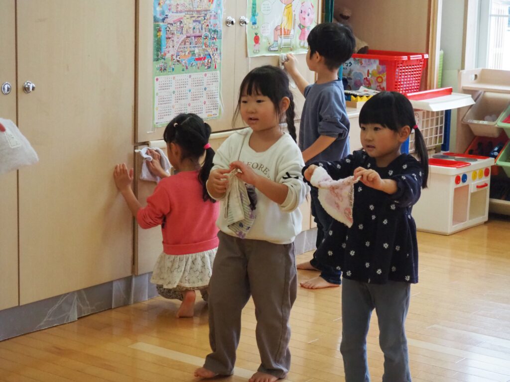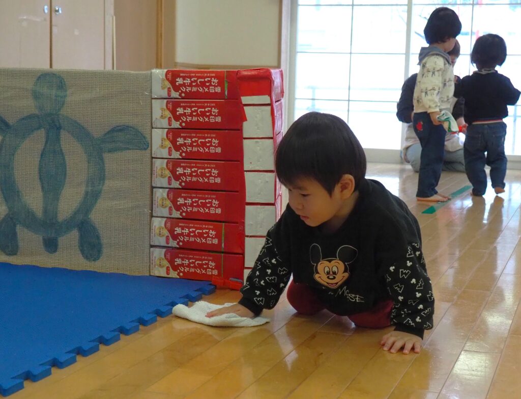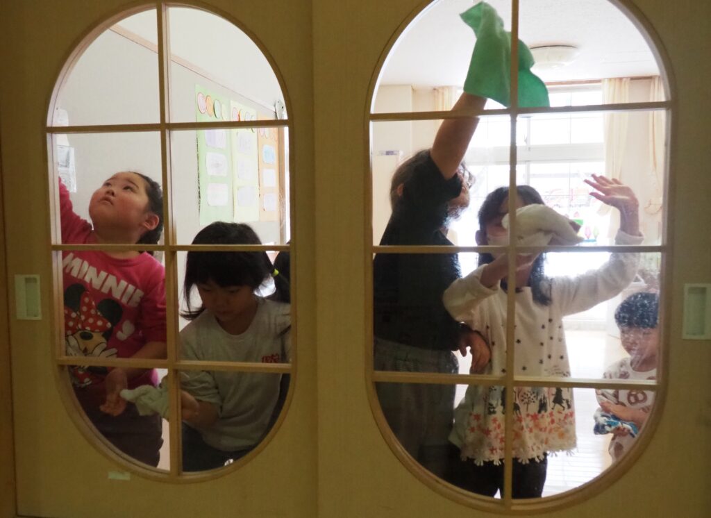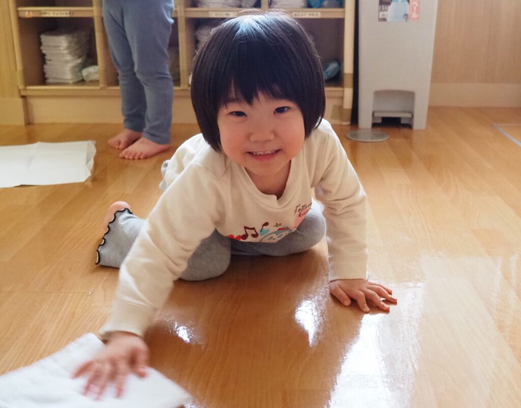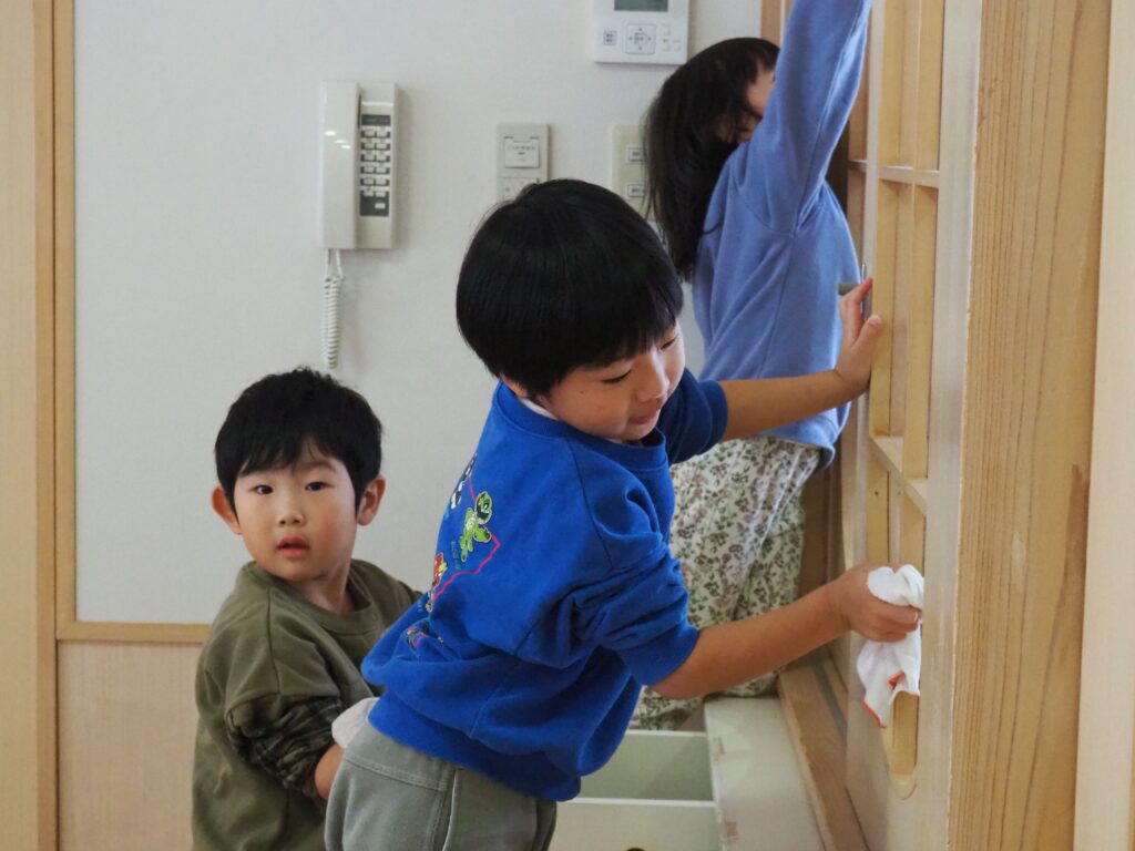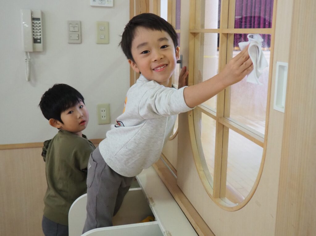 一年の締めくくりとして、子どもたちが感謝の気持ちをもって保育室の大掃除に取り組みました。自分たちの使ってきた場所をきれいにする経験を通して、物を大切にする心を育んでいます。