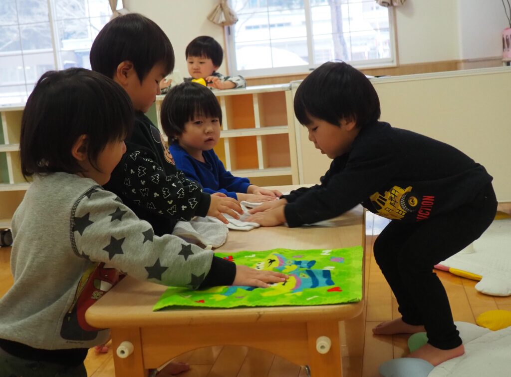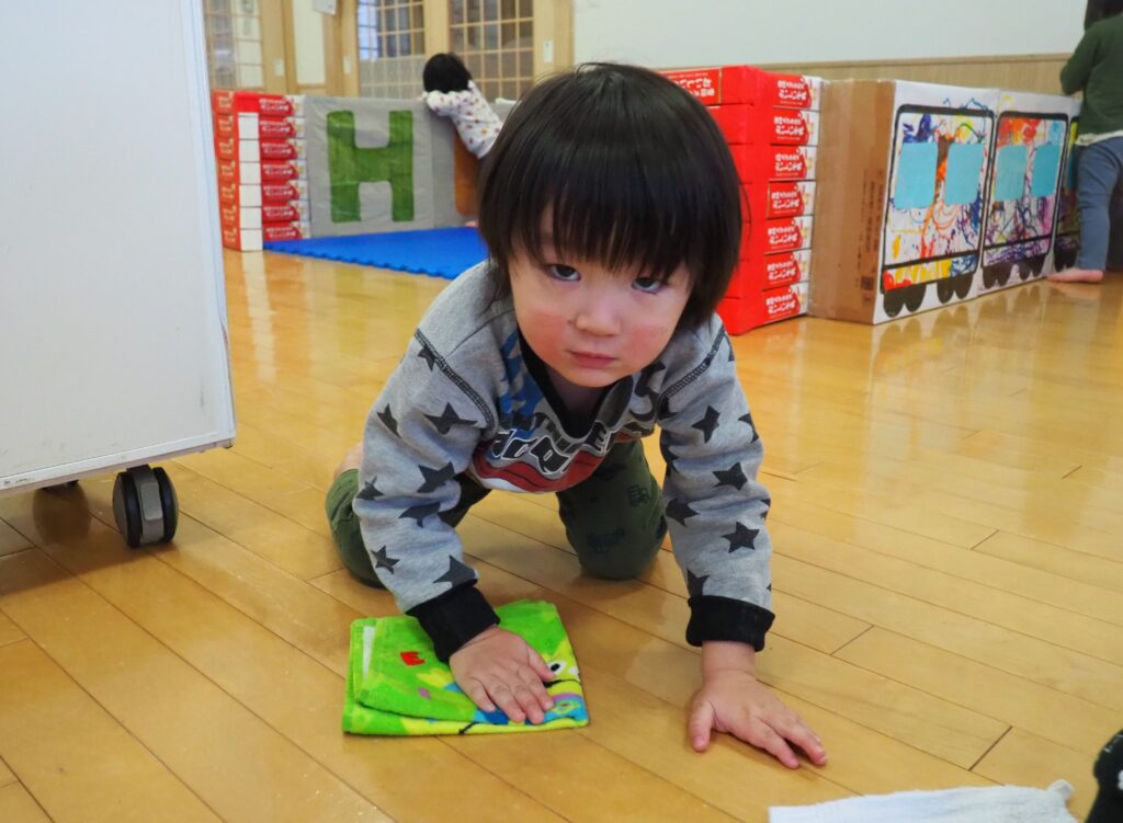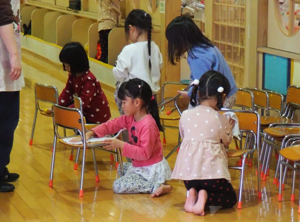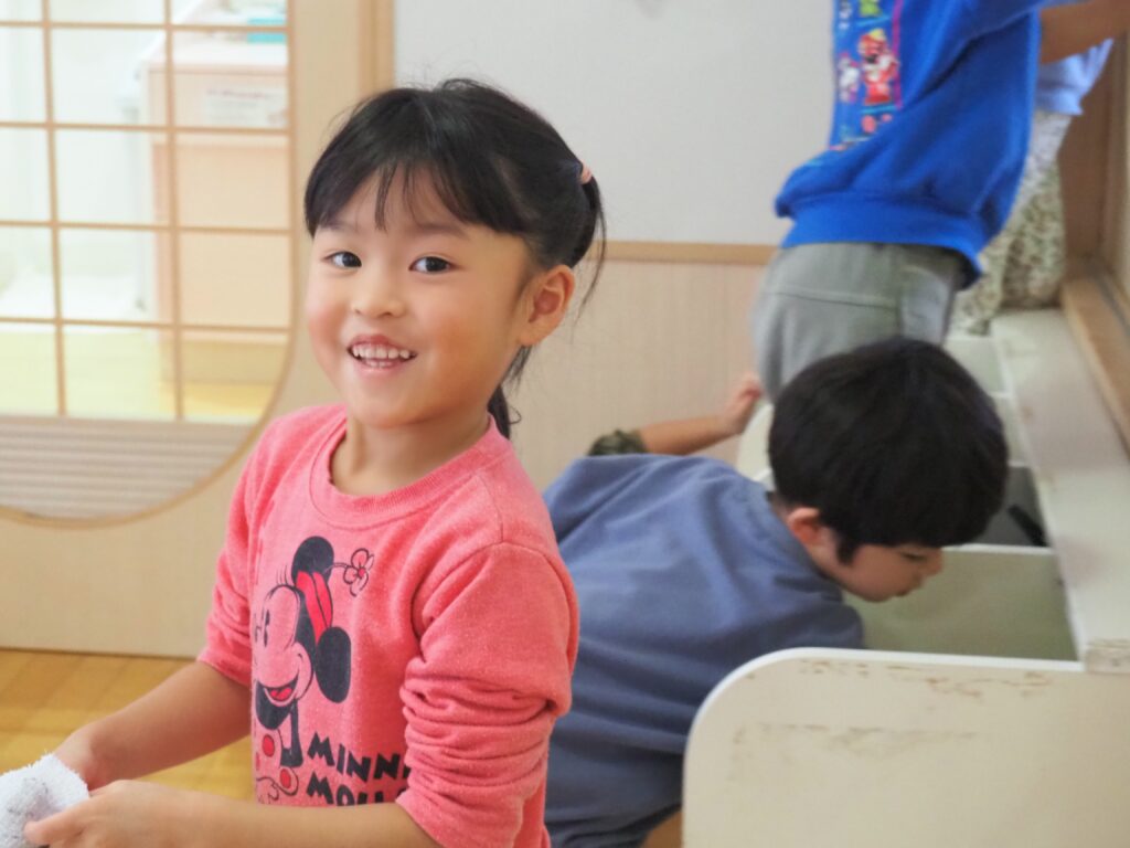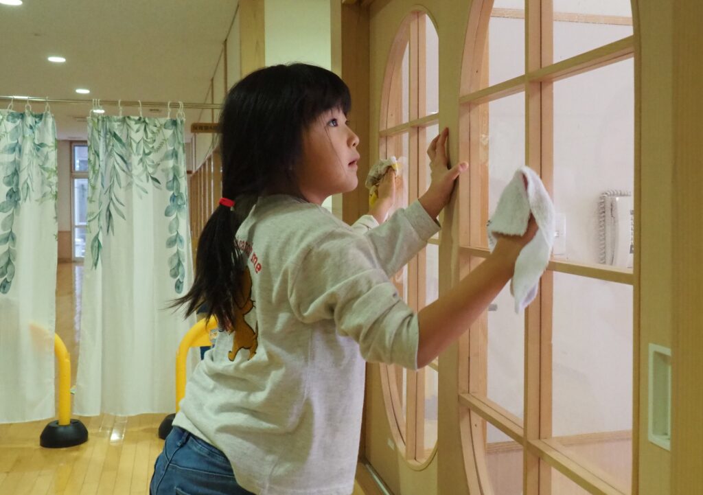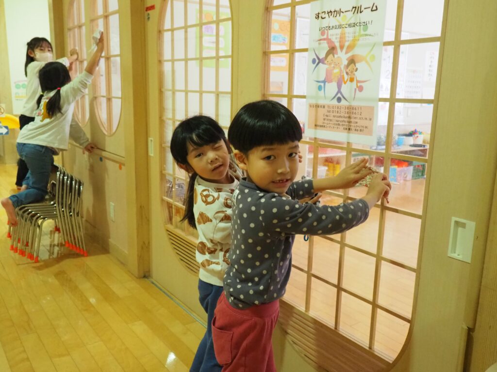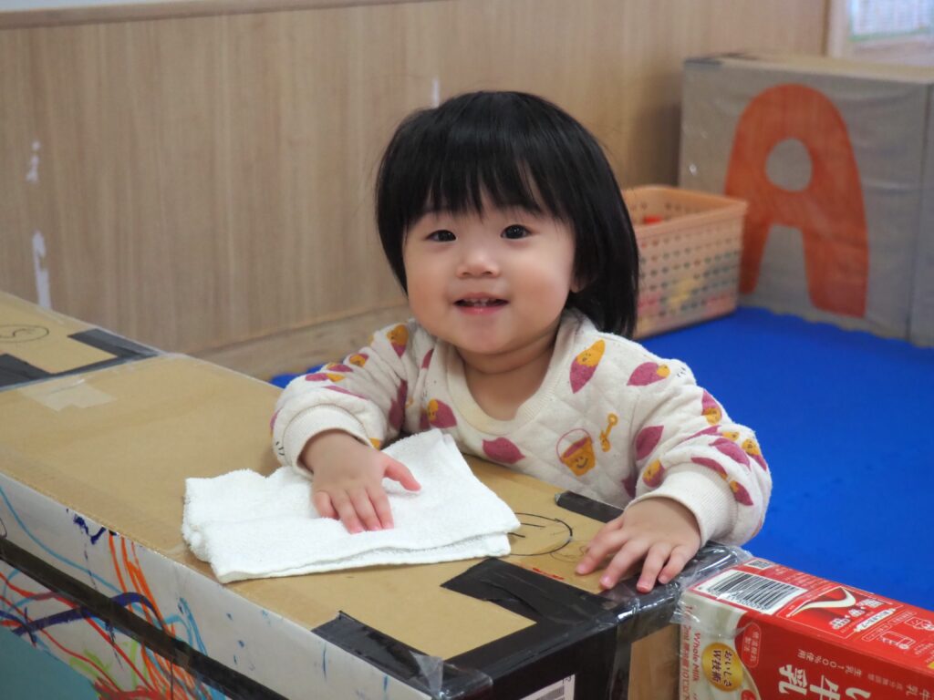 一年の締めくくりとして、子どもたちが感謝の気持ちをもって保育室の大掃除に取り組みました。自分たちの使ってきた場所をきれいにする経験を通して、物を大切にする心を育んでいます。