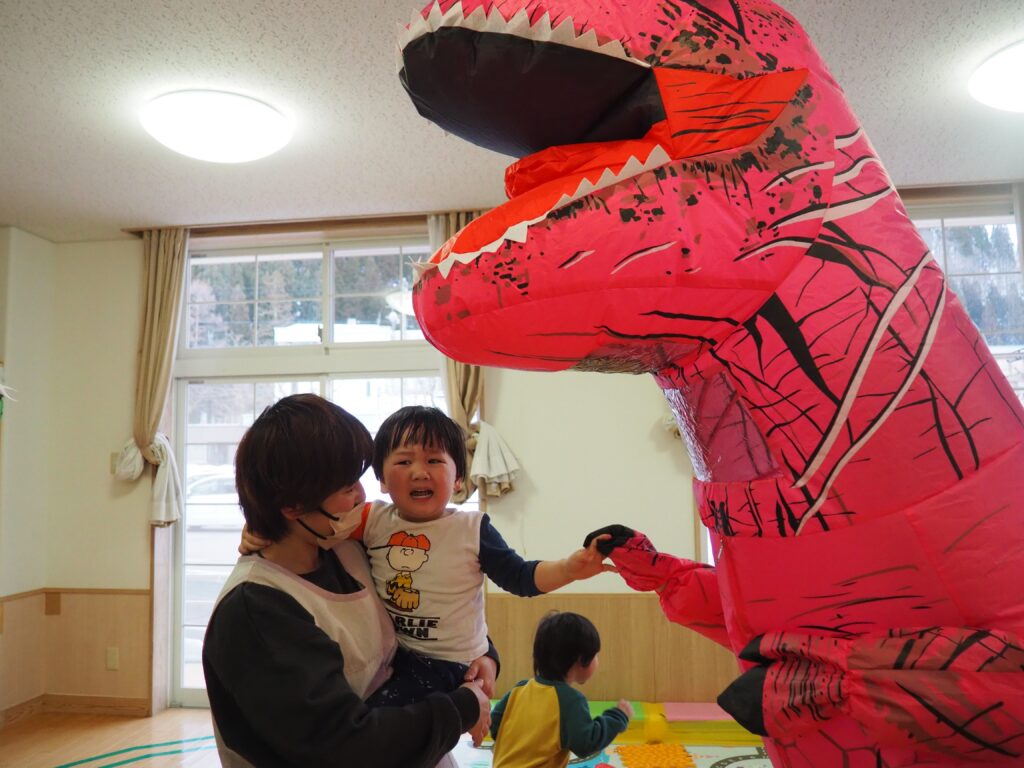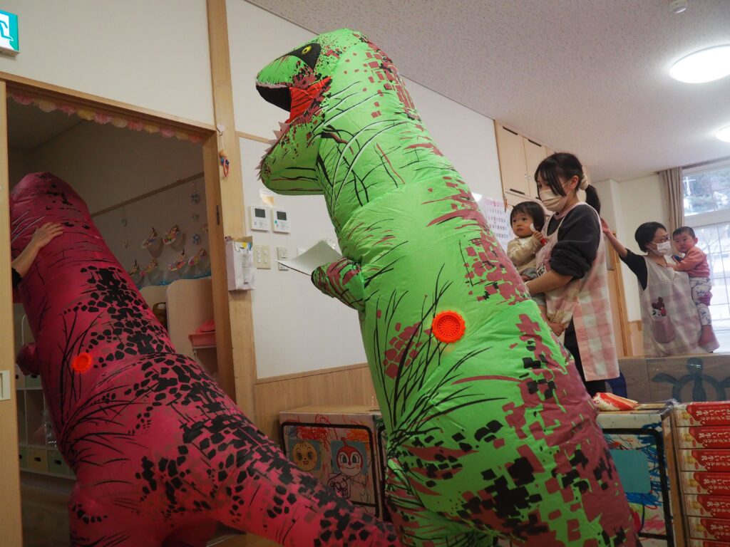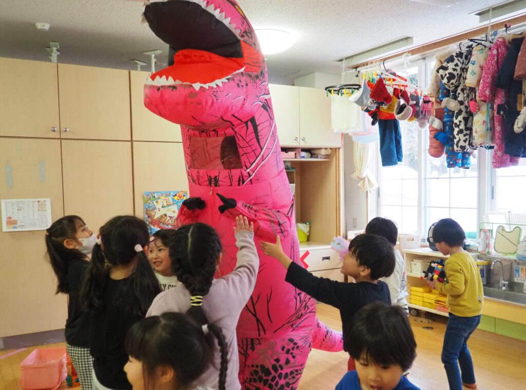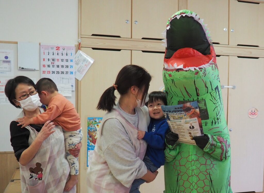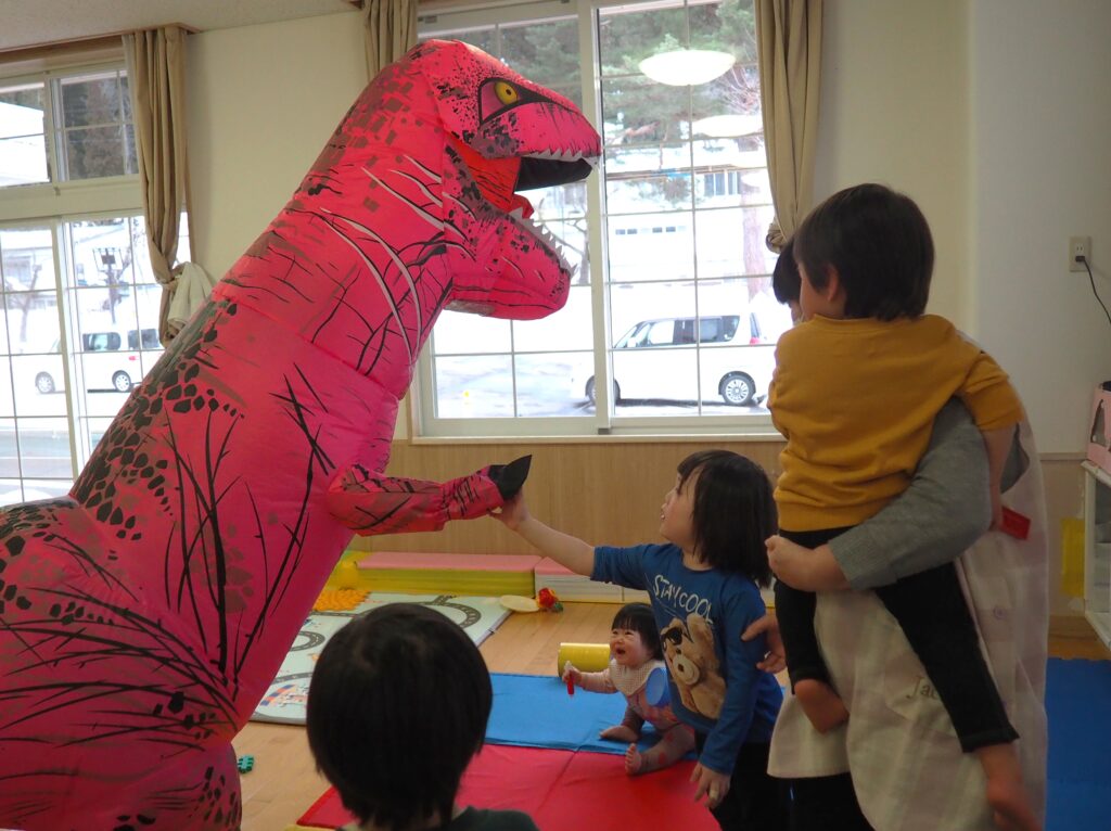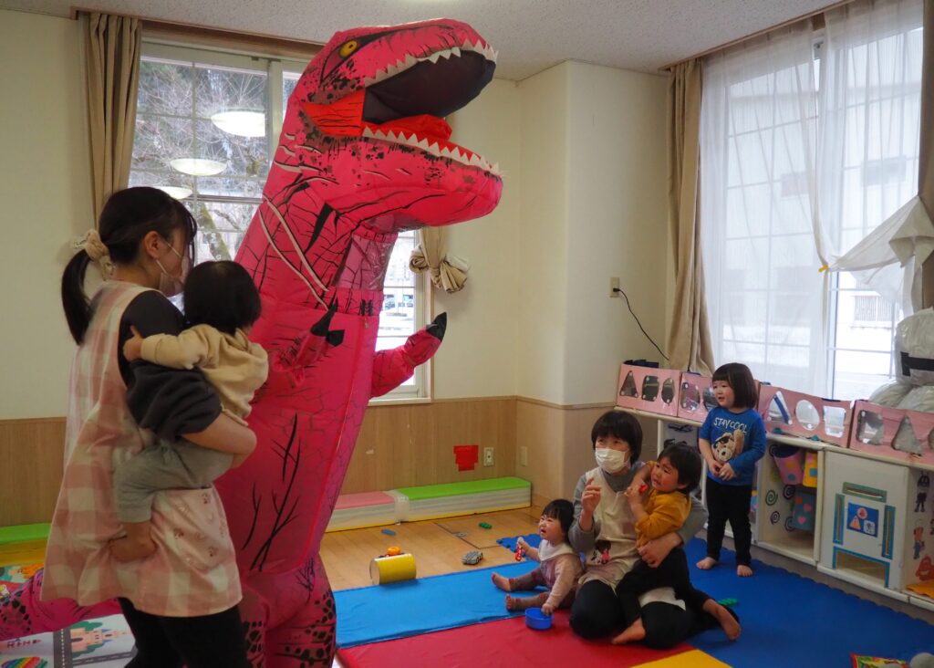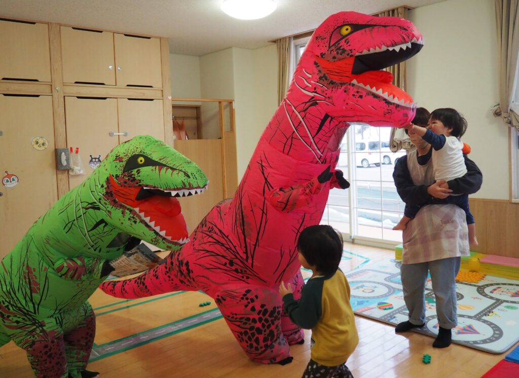明日はジュネスへGO! 2026.02.27 丸太組のスタッフさんが、「ティラノサウルスレース㏌ジュネス栗駒スキー場」のPRで、サプライズ訪問してくれました。楽しいイベントですので、都合のつく方はぜひ、ジュネス栗駒に足を運んでみてはいかがでしょうか!