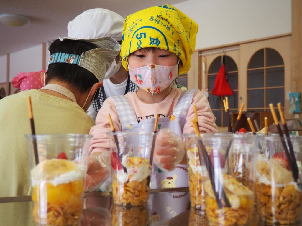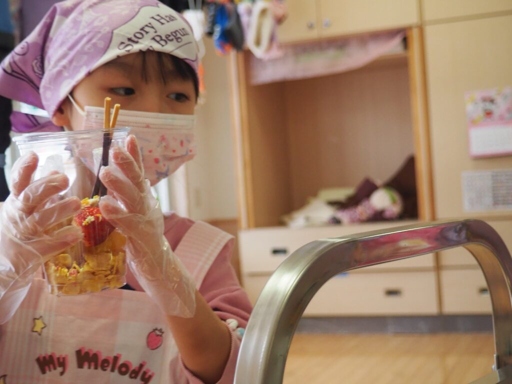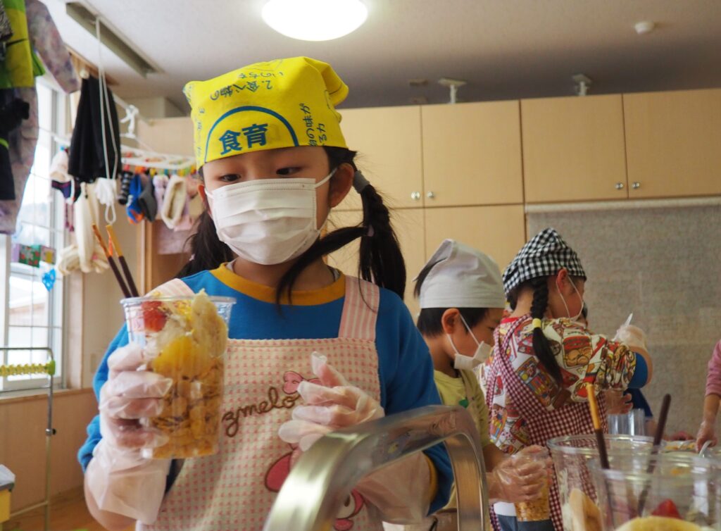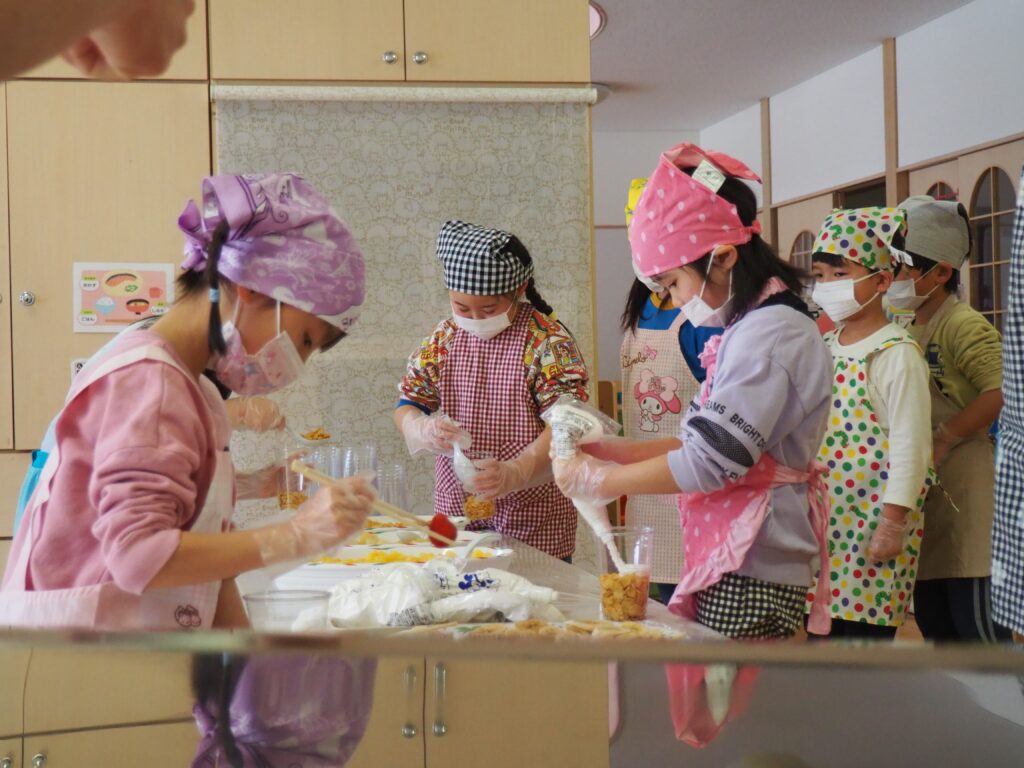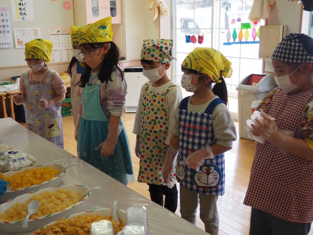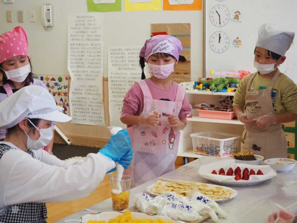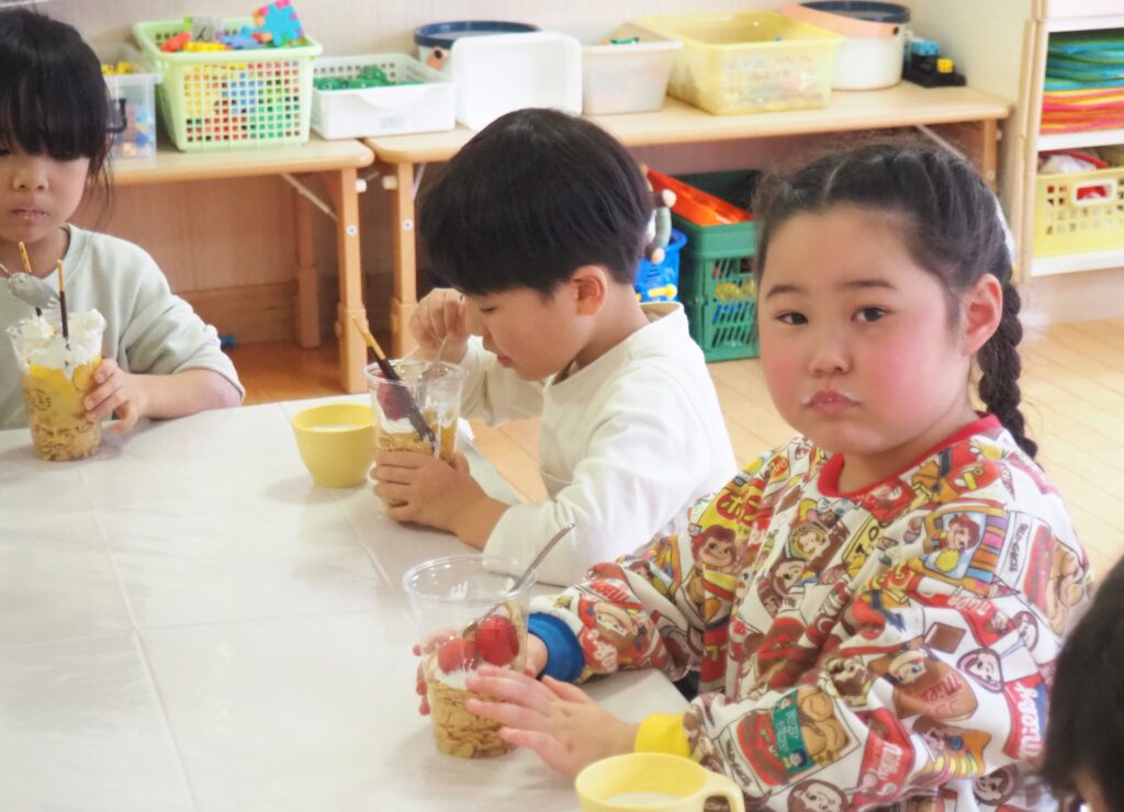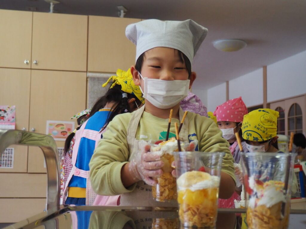 5歳児が食育教室で、午後のおやつ作りに挑戦しました。パティシエになりきって衛生面に配慮しながら、他クラスの子どもたちが午睡中の時間を利用して、年下児の分も作ってくれました。作っているときは真剣そのものでしたが、年下児には「食べるのもったいない!」「かわいい!」「おいしかった!ありがとう!」と口々にお礼を言われると、頬が緩み満足そうな表情をする子どもたちでした。