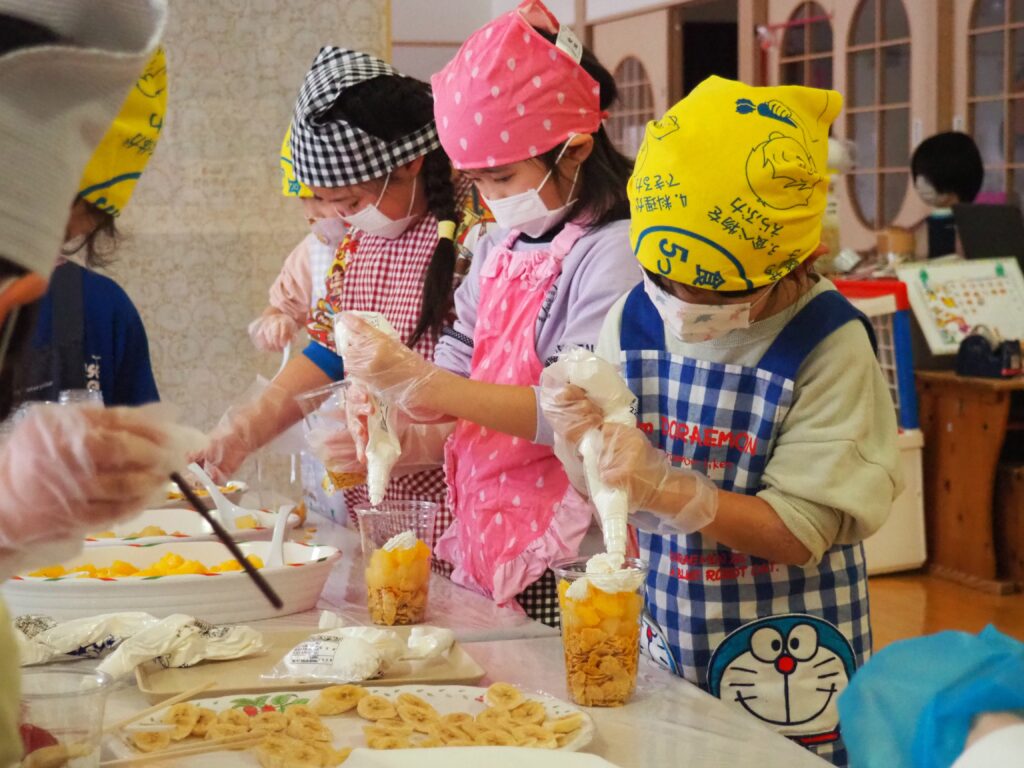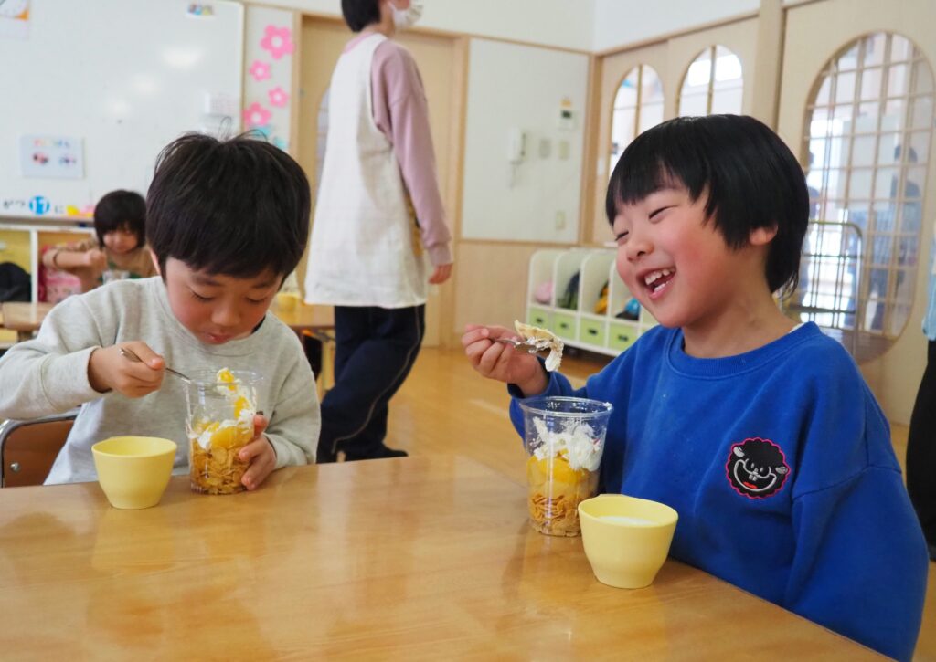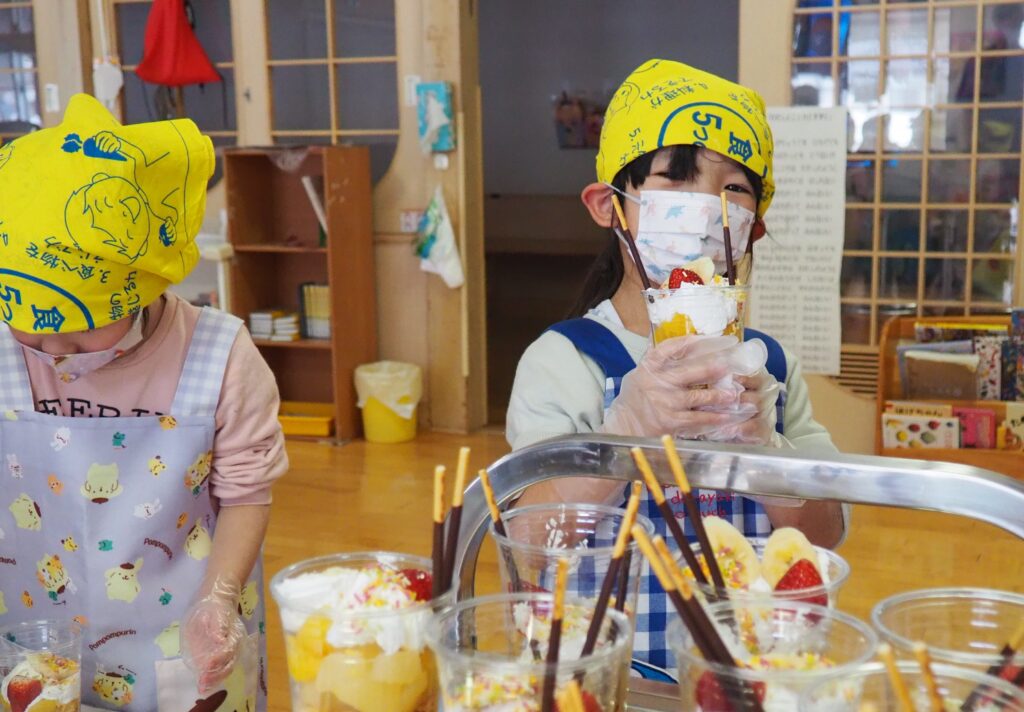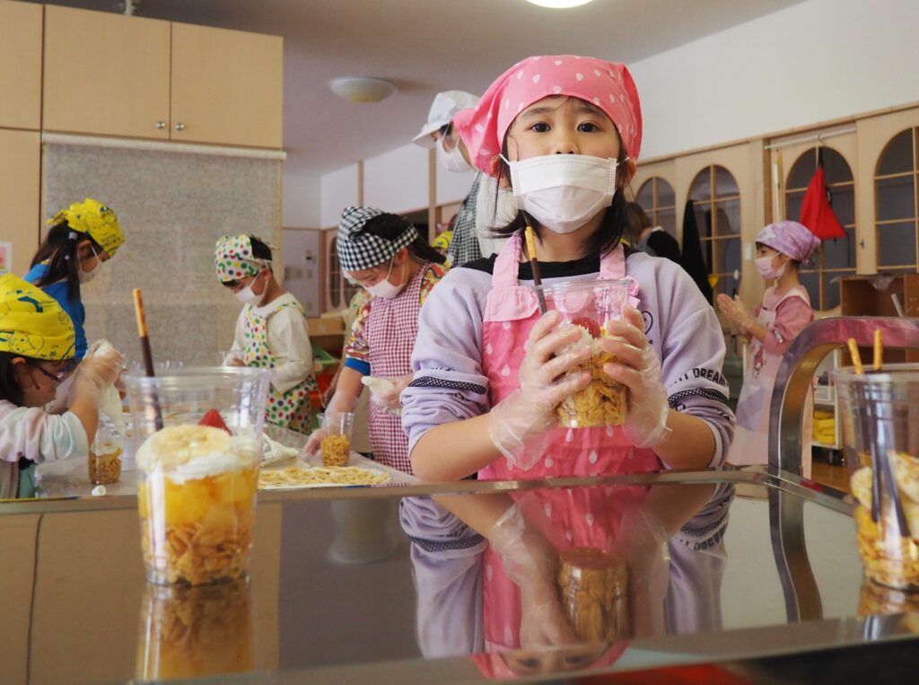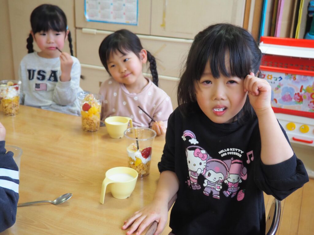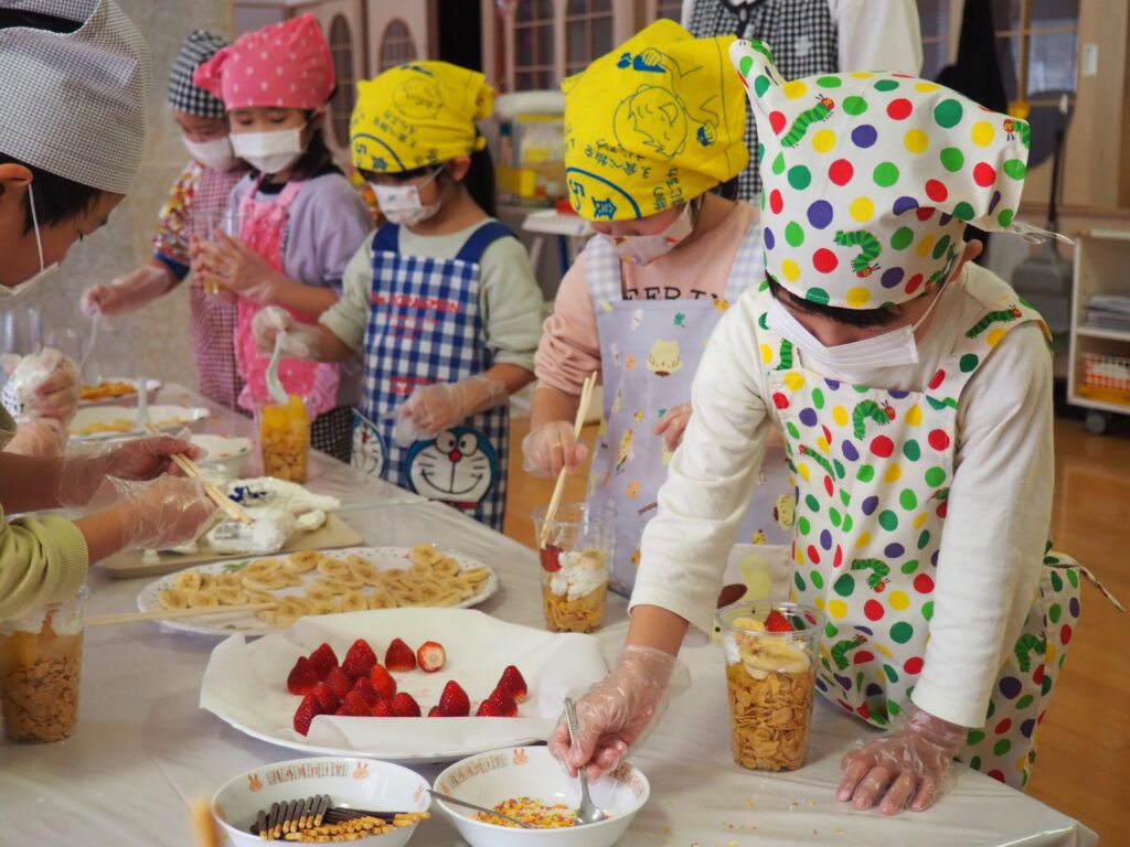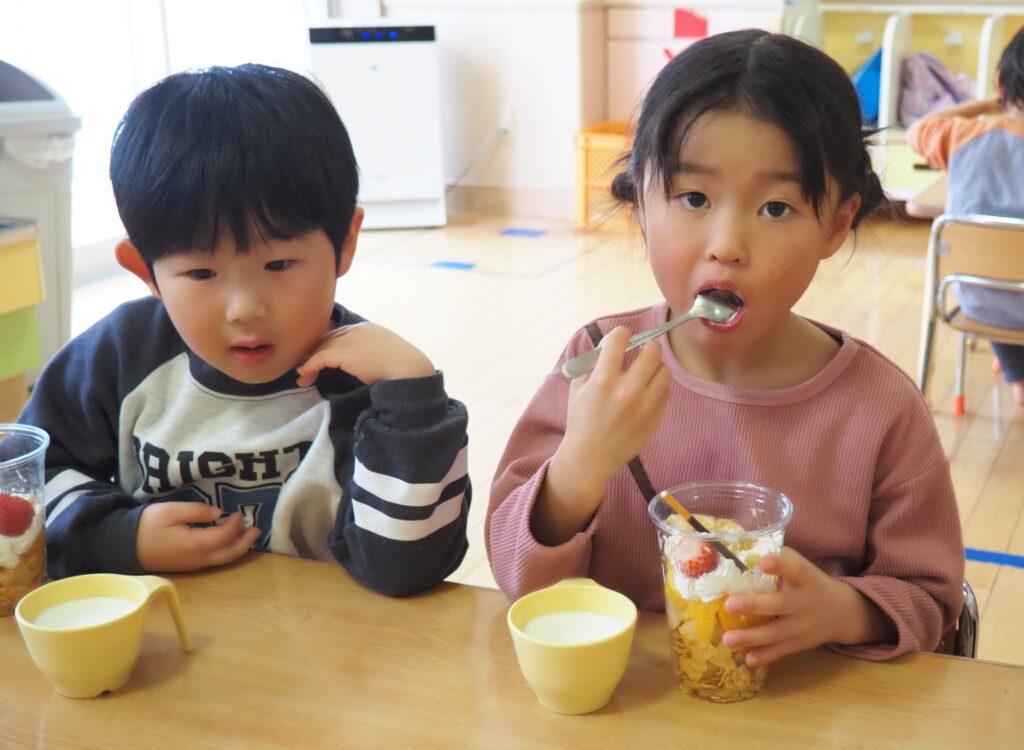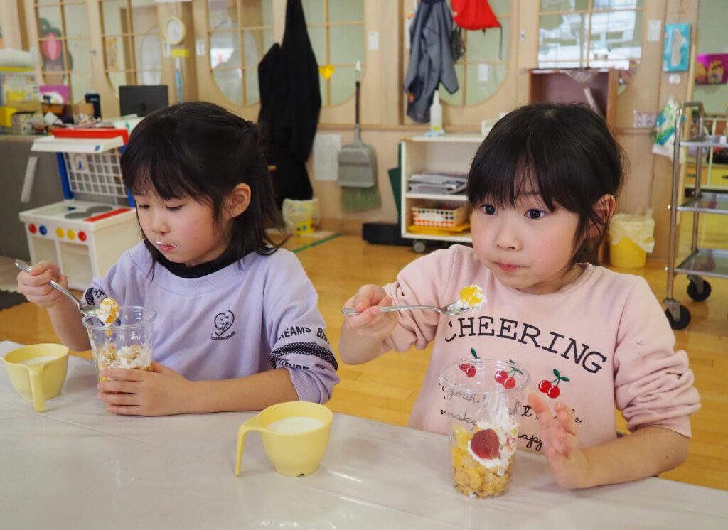 5歳児が食育教室で、午後のおやつ作りに挑戦しました。パティシエになりきって衛生面に配慮しながら、他クラスの子どもたちが午睡中の時間を利用して、年下児の分も作ってくれました。作っているときは真剣そのものでしたが、年下児には「食べるのもったいない!」「かわいい!」「おいしかった!ありがとう!」と口々にお礼を言われると、頬が緩み満足そうな表情をする子どもたちでした。