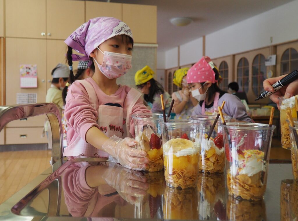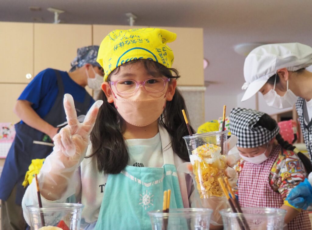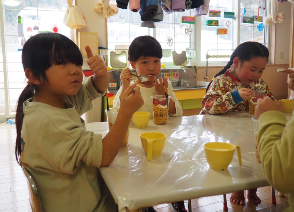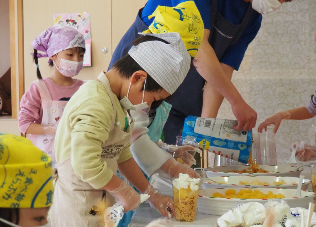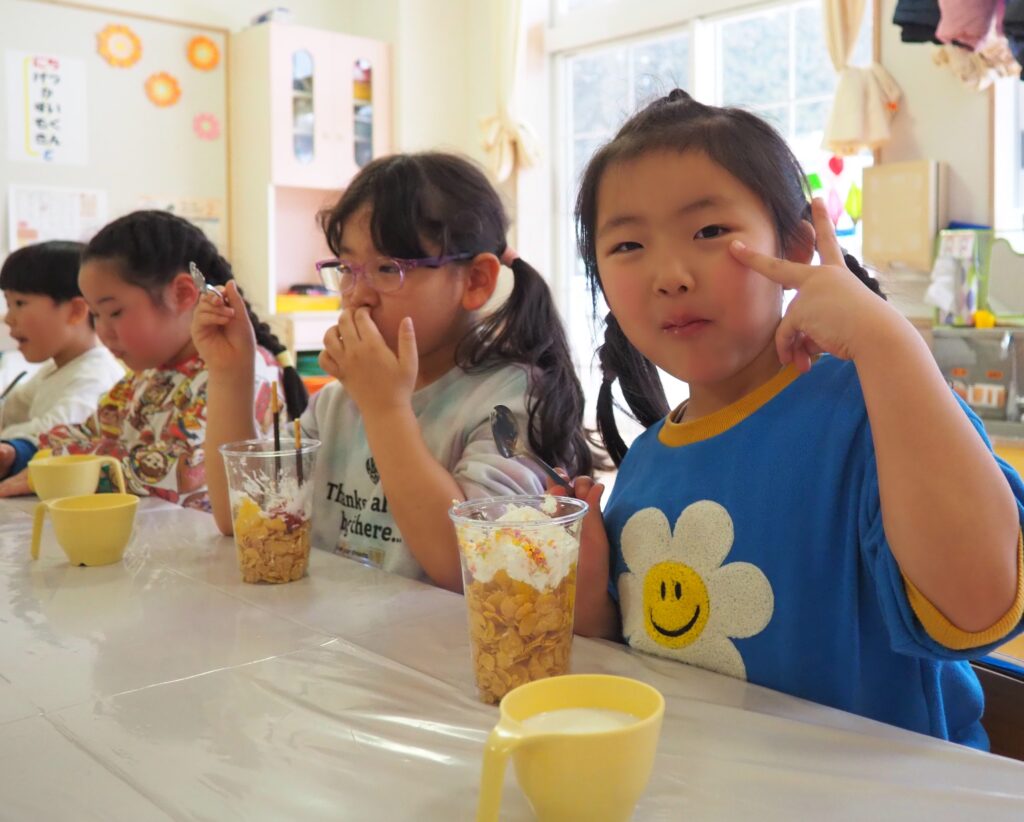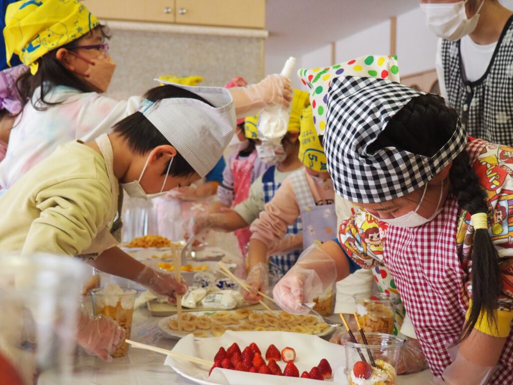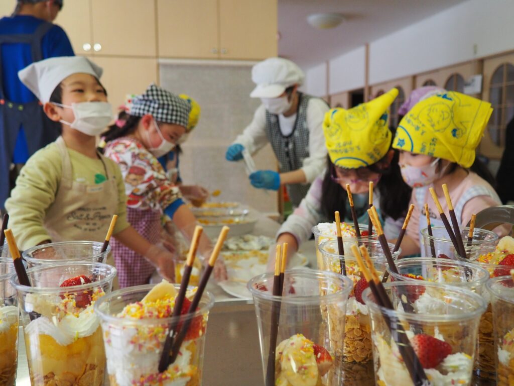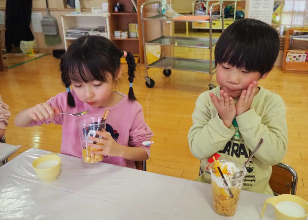 5歳児が食育教室で、午後のおやつ作りに挑戦しました。パティシエになりきって衛生面に配慮しながら、他クラスの子どもたちが午睡中の時間を利用して、年下児の分も作ってくれました。作っているときは真剣そのものでしたが、年下児には「食べるのもったいない!」「かわいい!」「おいしかった!ありがとう!」と口々にお礼を言われると、頬が緩み満足そうな表情をする子どもたちでした。