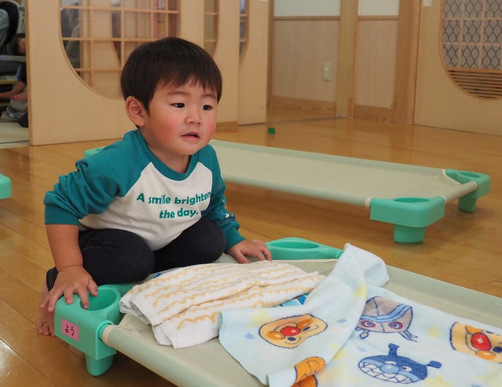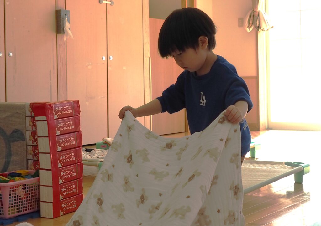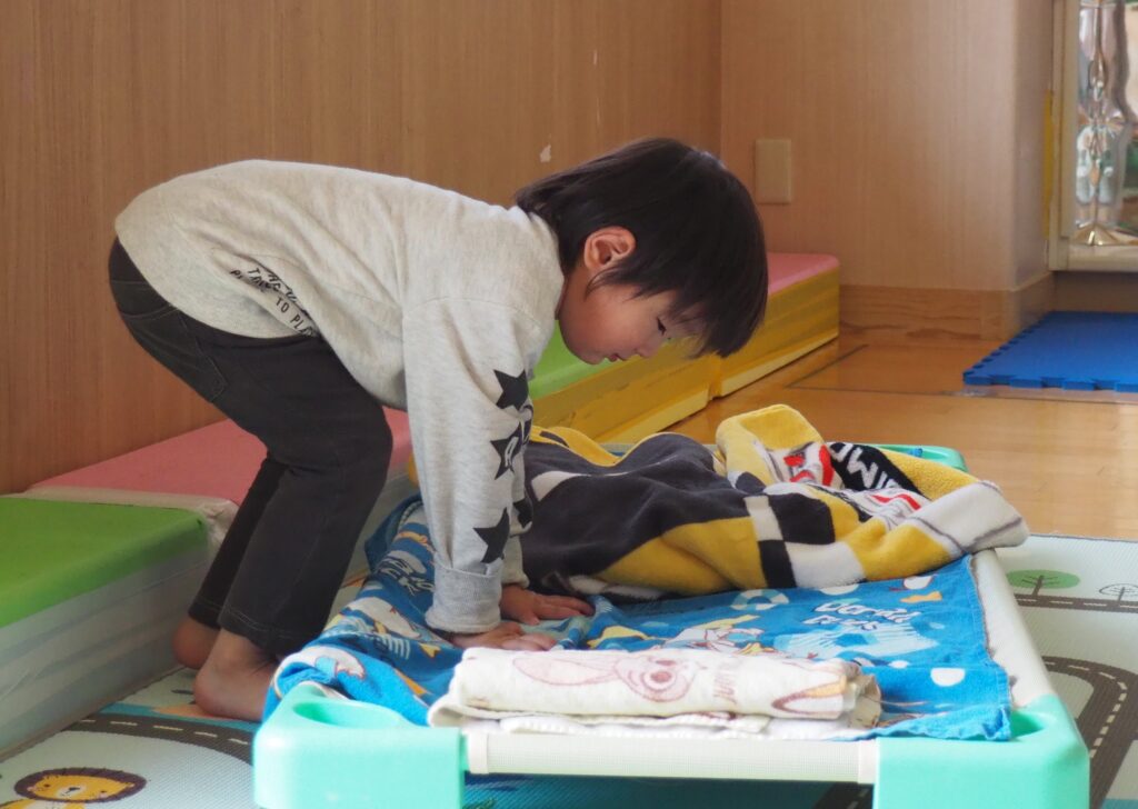 自分でできるよ! 2025.11.27 1・2歳児のクラスでは、毎日のお昼寝前の準備を、子どもたち自身が“できることから”取り組んでいます。バスタオルをそっと広げたり、小さな体で一生懸命に取り組む姿には、職員も微笑ましくなります。「自分でやってみたい」という気持ちを大切にしながら、これからも子どもたちの主体的な姿を丁寧に見守っていきます。