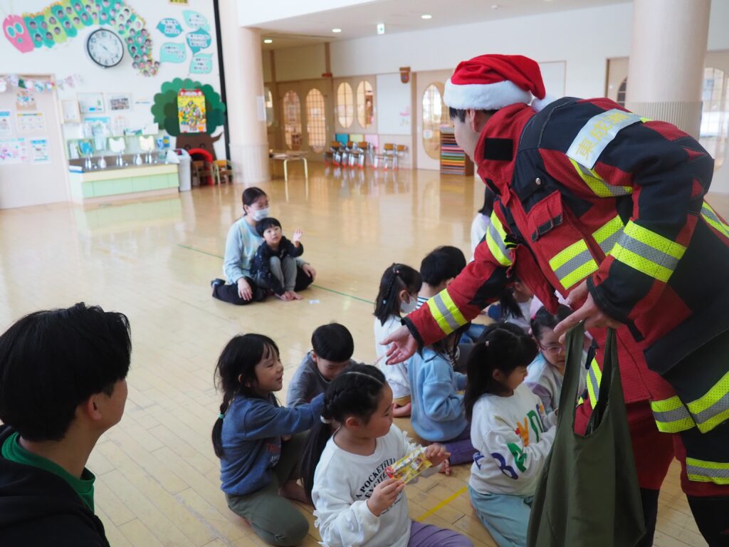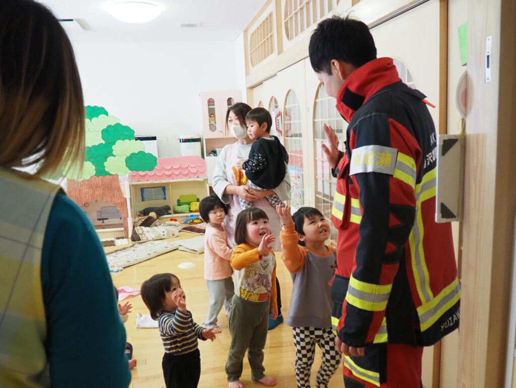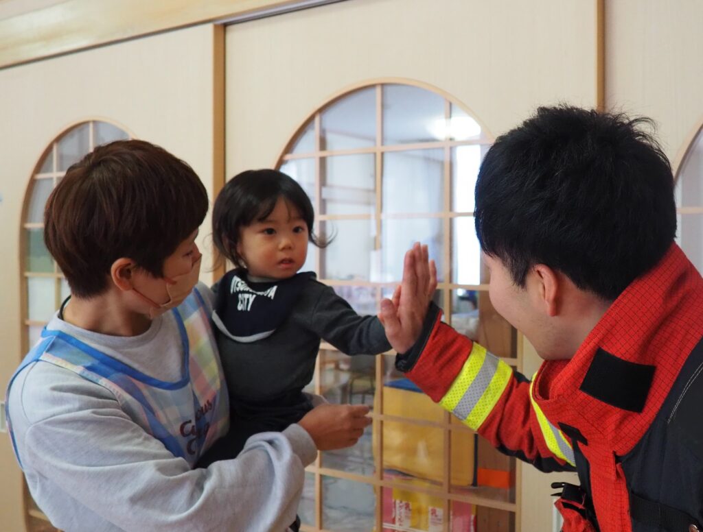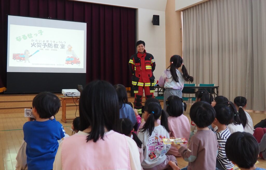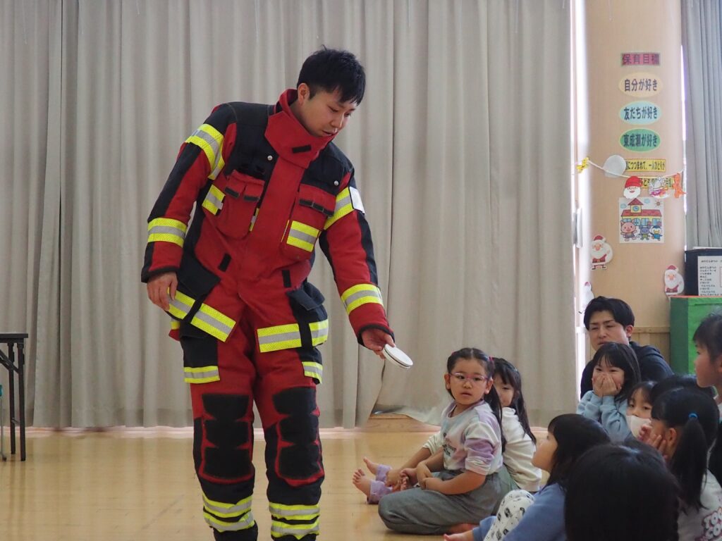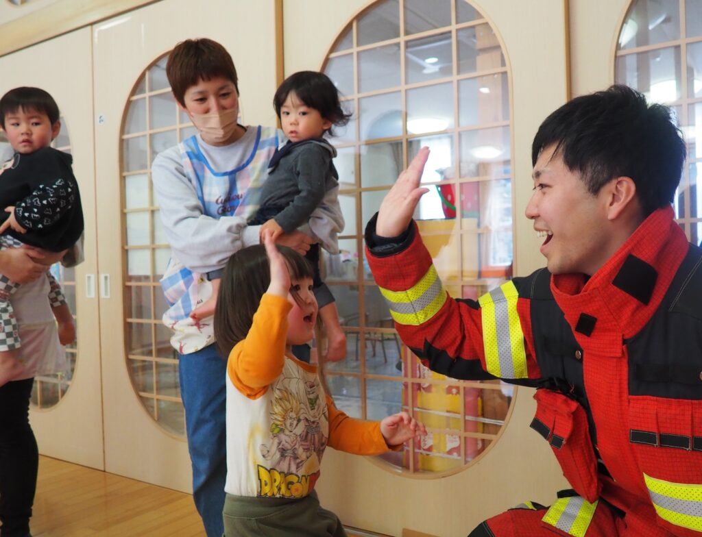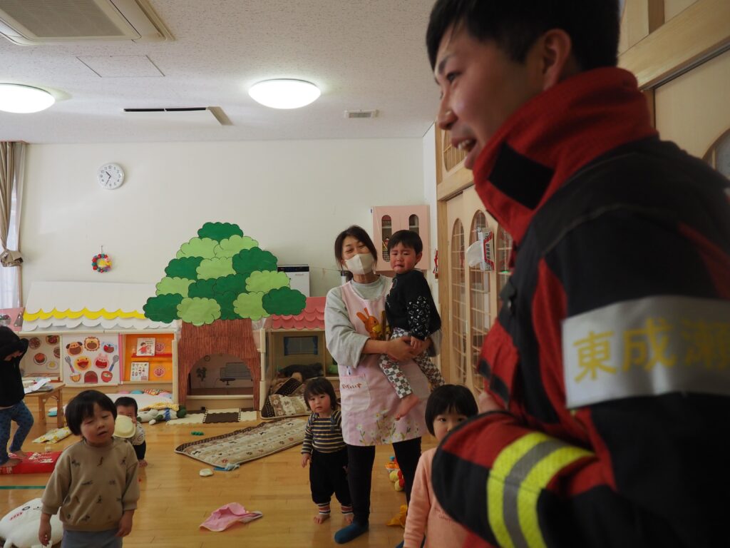 なるせ保育園の前身である「こばと保育園」の卒園児で、現在は消防署で使命感を胸に働く消防士さんが、園児のために特別な「火災予防教室」を開いてくださいました。「子どもたちに、どうしても伝えたいことがあるんです!」と、自ら申し出てくださり、教材づくりから構成まで、すべてオリジナルのプログラムを準備しての開催で、子どもたちのために時間をかけ、心を込めて作ってくれたことが伝わってくるみごとな内容でした!