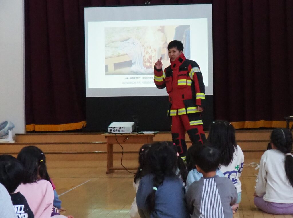 消防士としての誇りと優しさあふれる語り口に、子どもたちは食い入るように耳を傾けていました。子どもたちに寄り添い丁寧に伝える姿は、本当に頼もしく、まぶしく見えました。