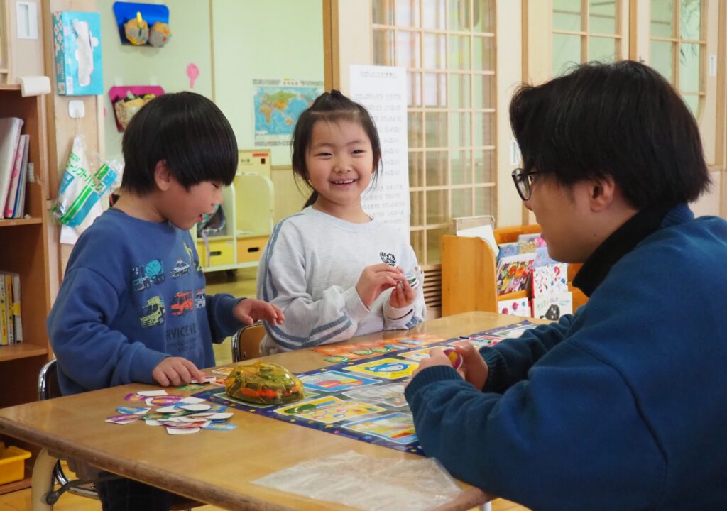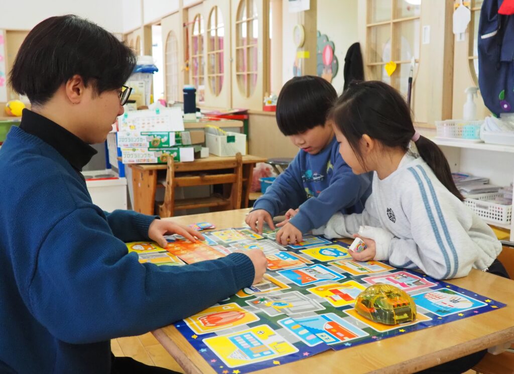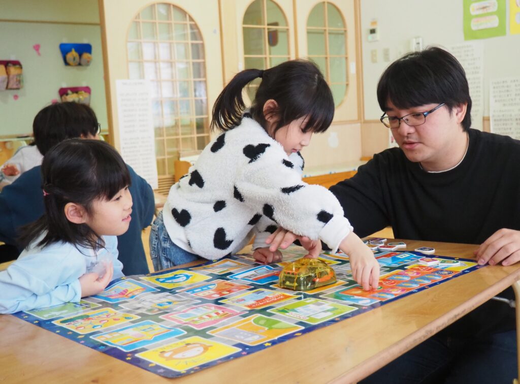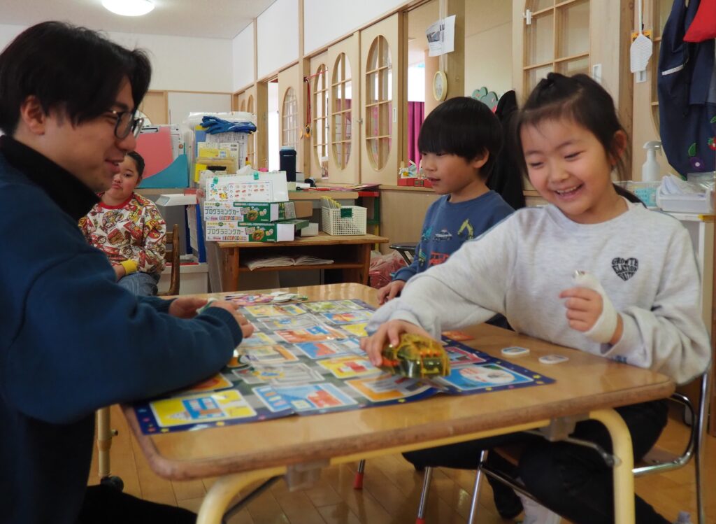 論理的思考力を育む! 2026.02.24 今年度最後のプログラミング教室が実施されました。今回は、プログラミングカーに命令してスタートからゴールまで動かすことの、総まとめを楽しみました。5歳児を対象に年間10回開催されたプログラミング教室。プログラミングカーを使った遊びを通して論理的思考力を育んできました。この積み重ねが、子どもたちの大きな成長につながりました。ご協力をいただいた、なるテックのスタッフさんに感謝いたします。