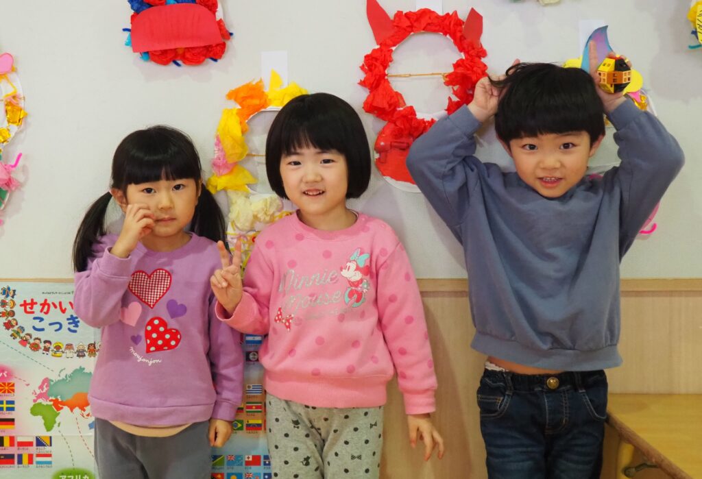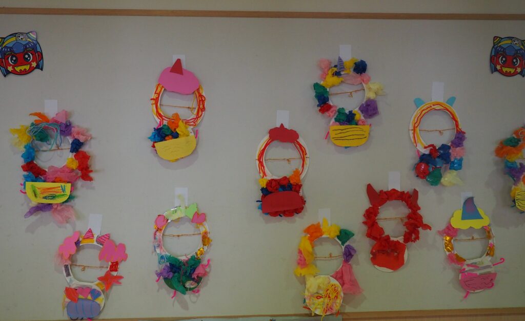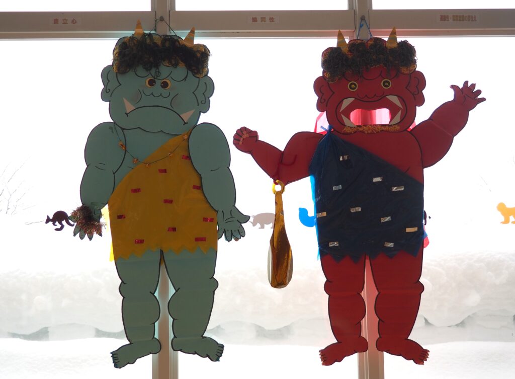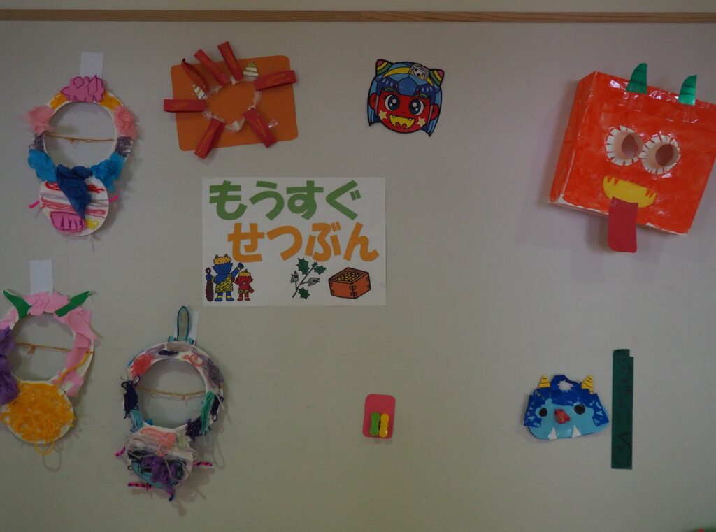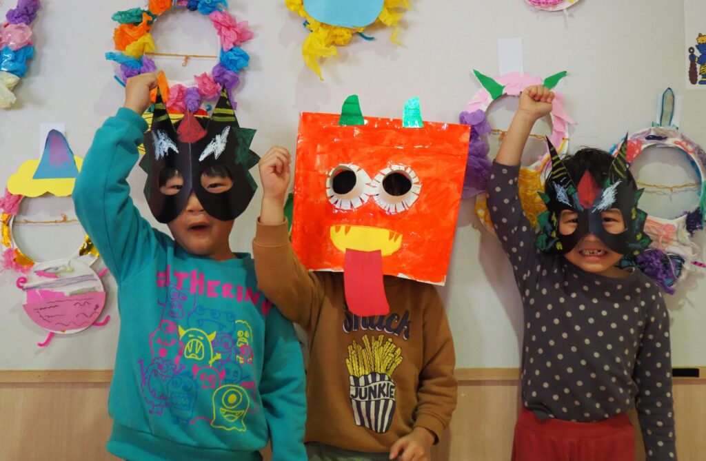 豆まきの準備万端! 2026.02.02 節分を明日に控え、子どもたちは豆まきに向けて準備を進めました。自分たちで作った鬼のお面や衣装を身に着けて「鬼は外!福は内!」と元気な声を響かせながら、当日を心待ちにする姿が見られました。期待と少しのドキドキを胸に、豆まきの準備は万端です。