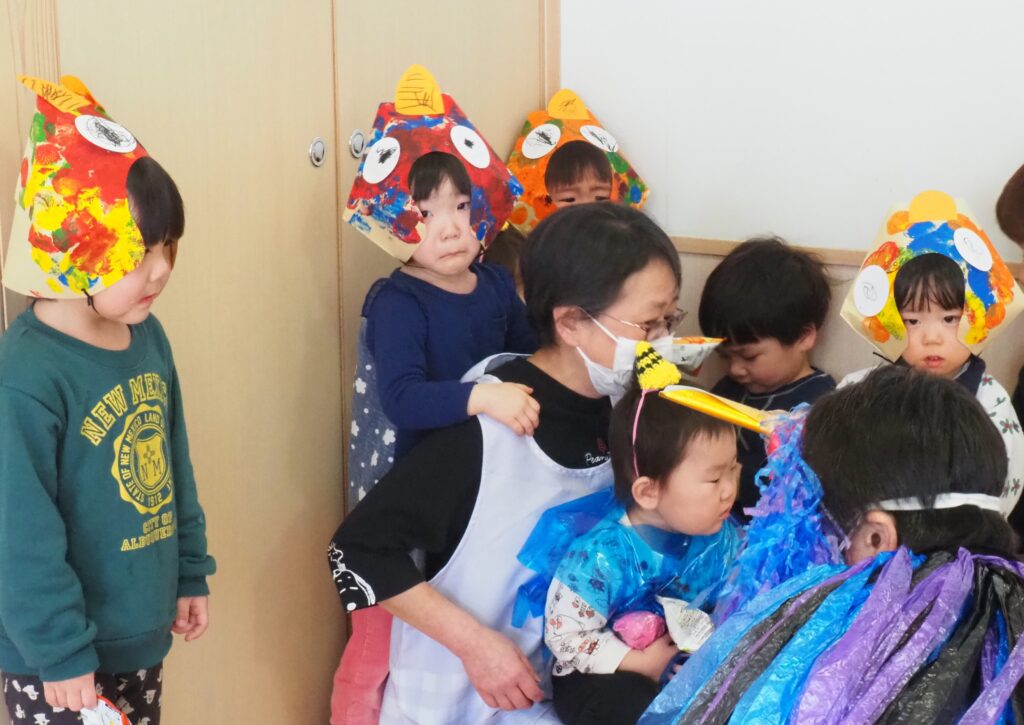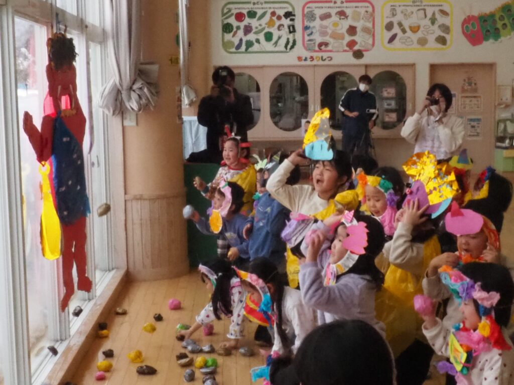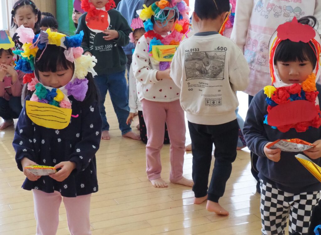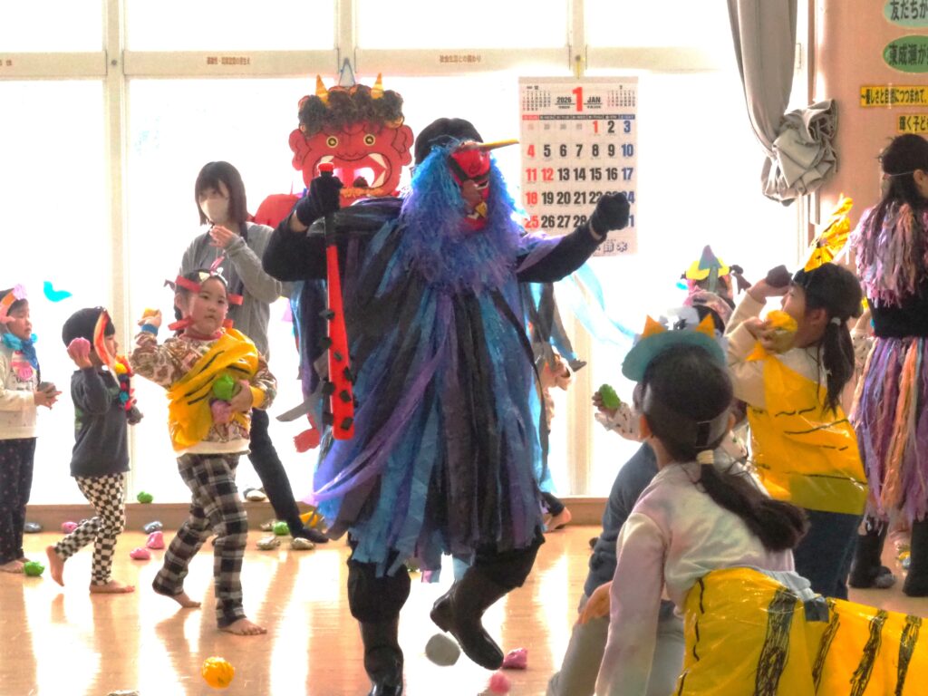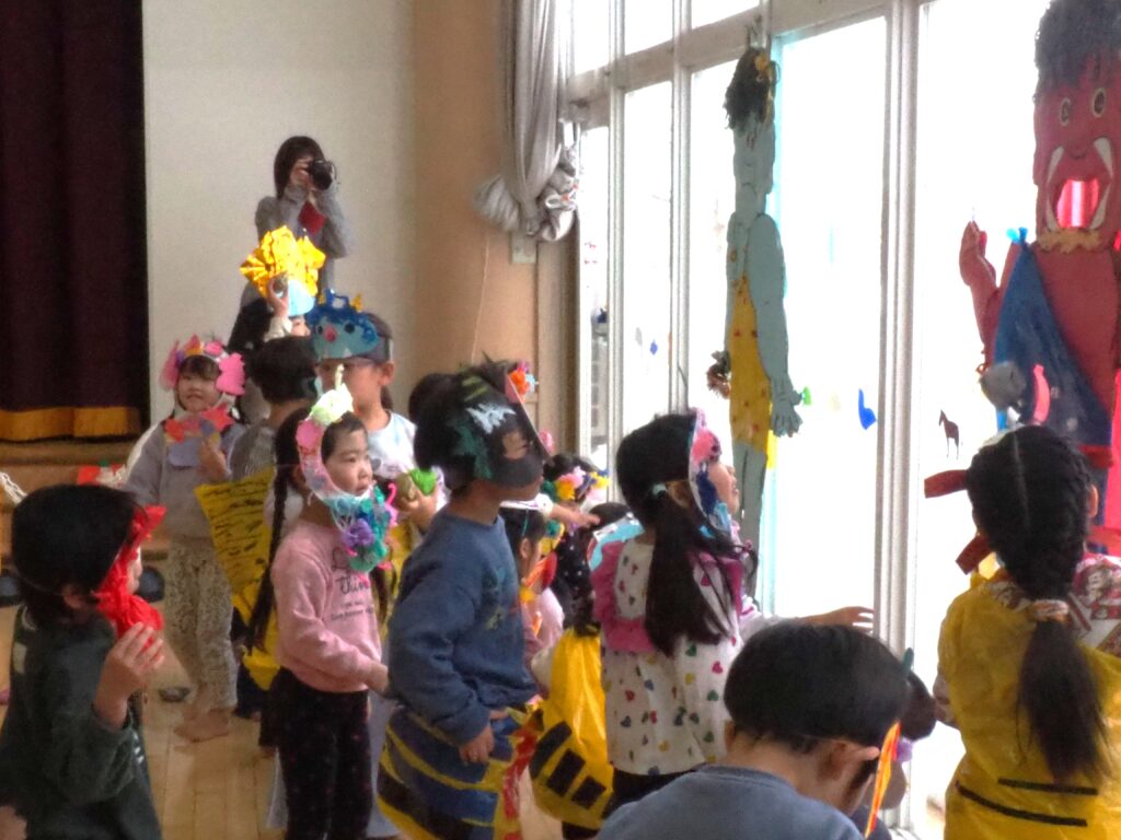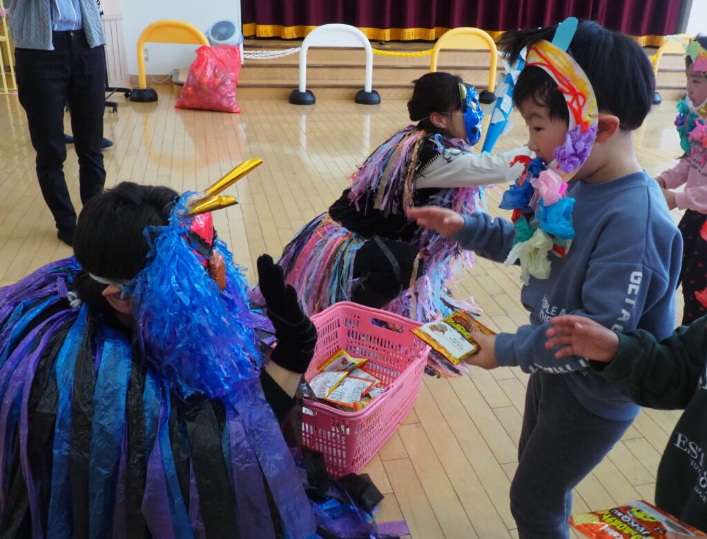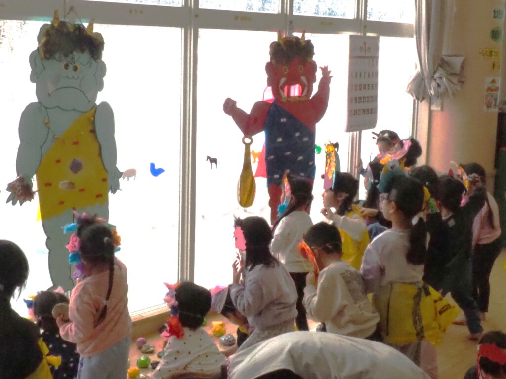 節分で豆まきを行いました。鬼が現れると、勇敢に立ち向かっていく子、不安そうに保育者の陰に隠れる子と様々でしたが、最後は鬼とタッチしてお菓子をもらい満足そうにする姿が見られました。今年も優しい鬼で、子どもたちも退治しやすかったようです。自分の中の悪い鬼を追い出して福を招き入れ、今年1年間の無病息災を願う行事が無事終わりました。