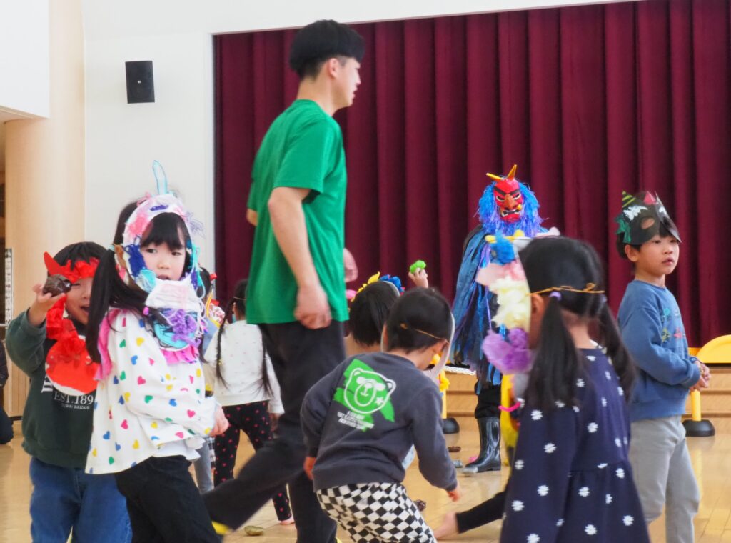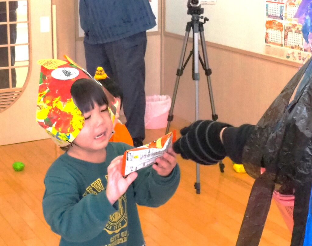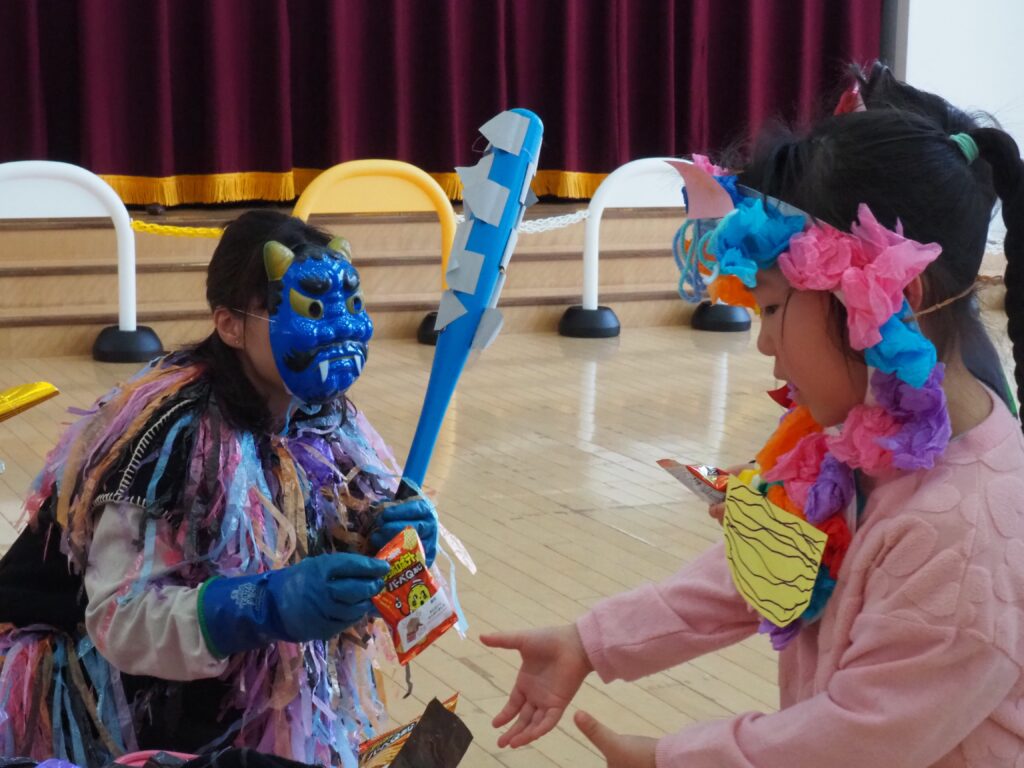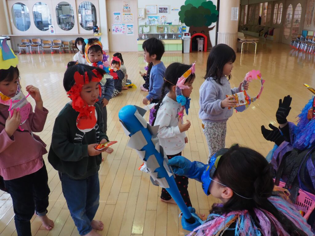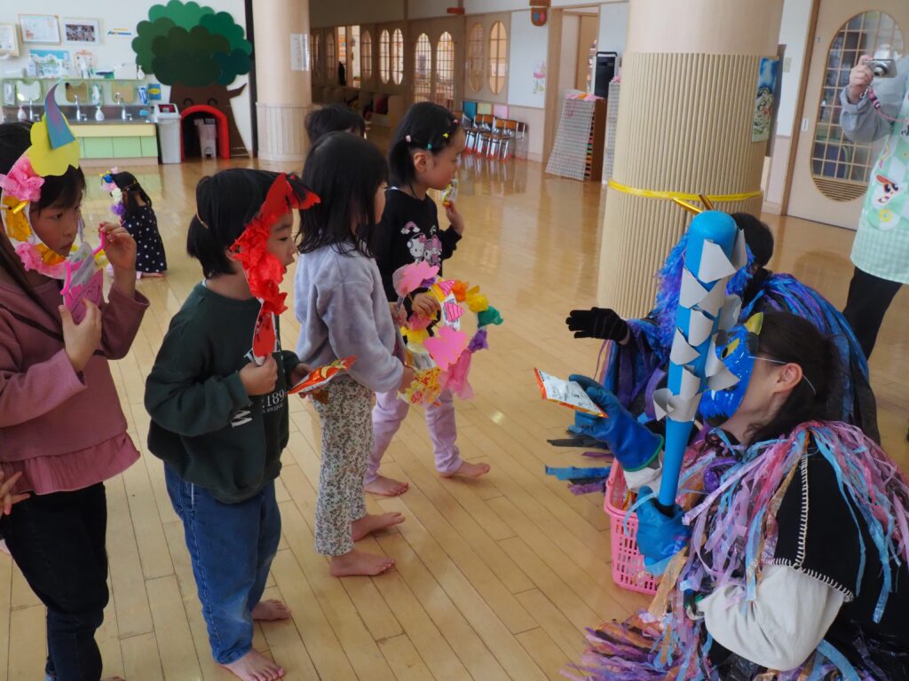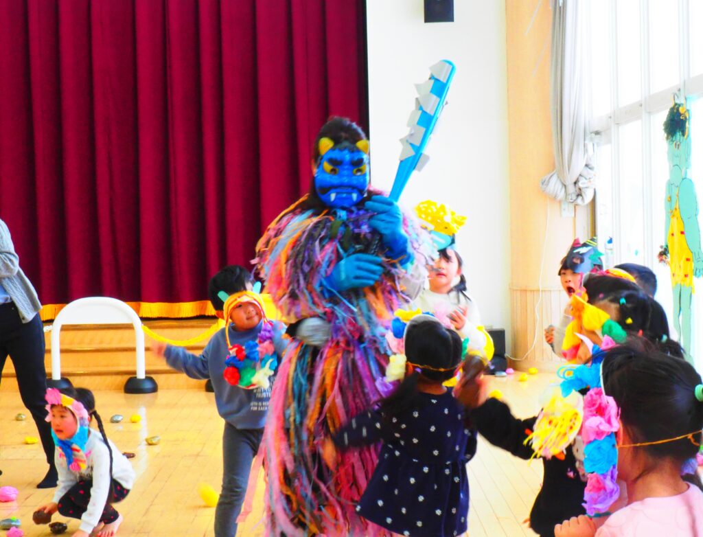 節分で豆まきを行いました。鬼が現れると、勇敢に立ち向かっていく子、不安そうに保育者の陰に隠れる子と様々でしたが、最後は鬼とタッチしてお菓子をもらい満足そうにする姿が見られました。今年も優しい鬼で、子どもたちも退治しやすかったようです。自分の中の悪い鬼を追い出して福を招き入れ、今年1年間の無病息災を願う行事が無事終わりました。