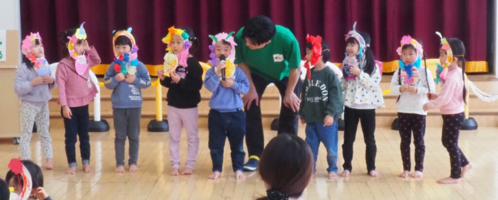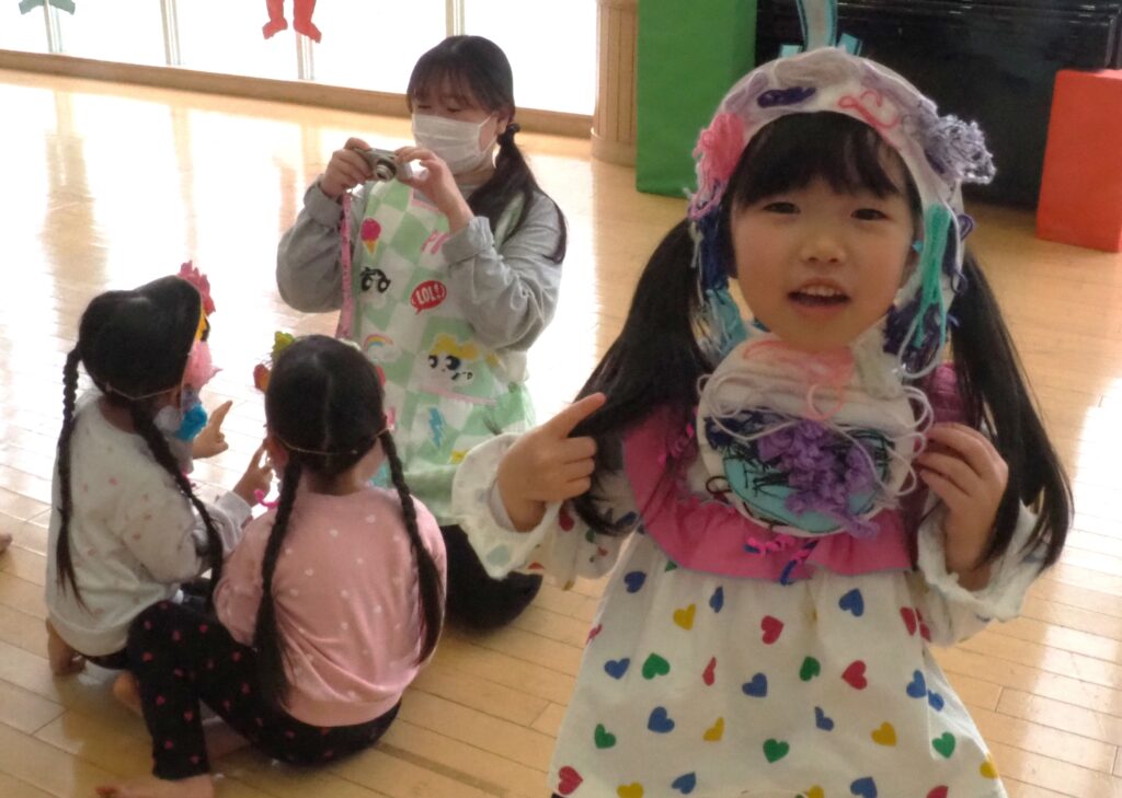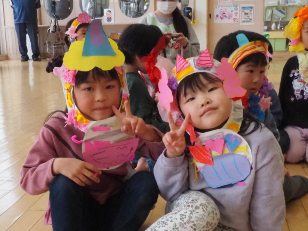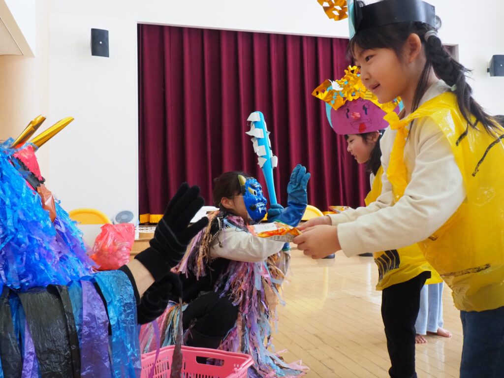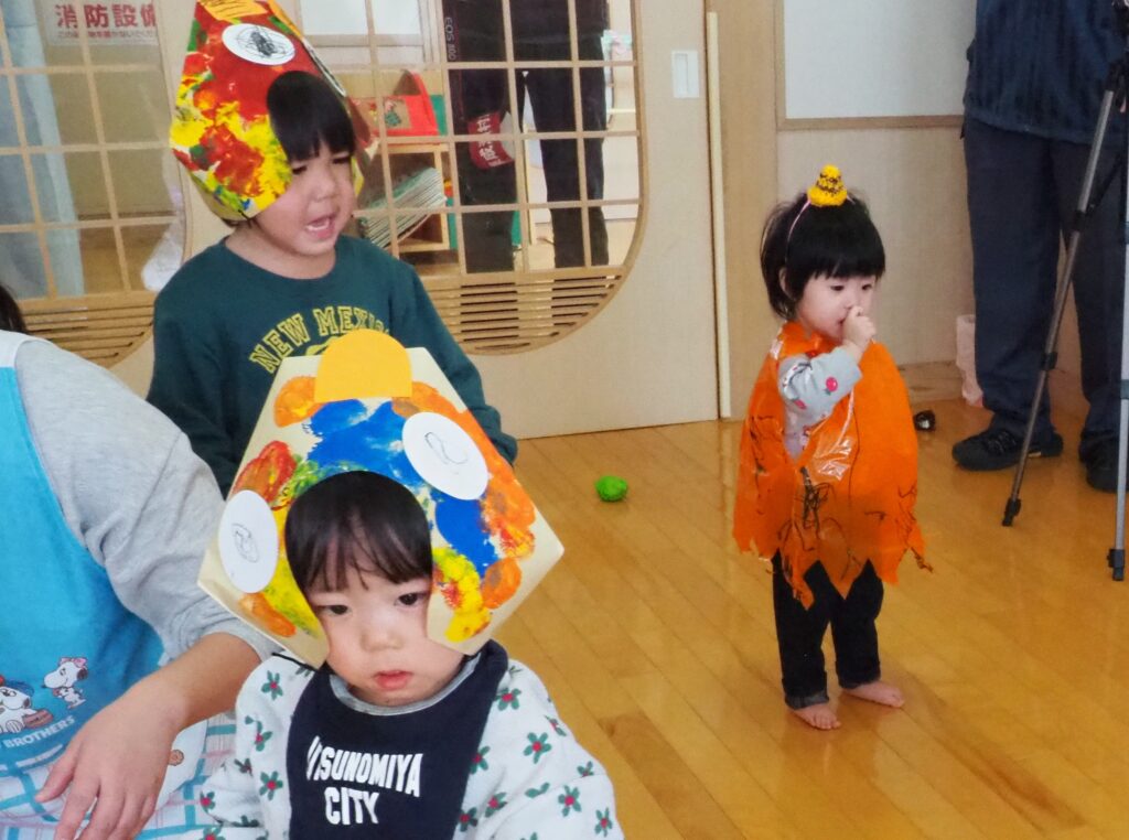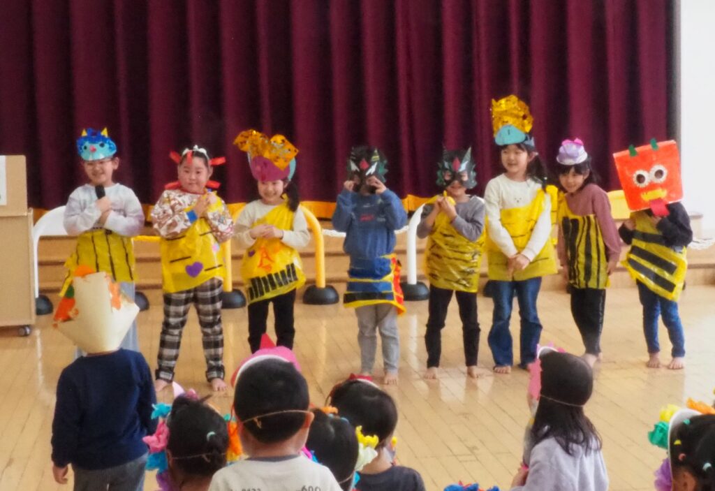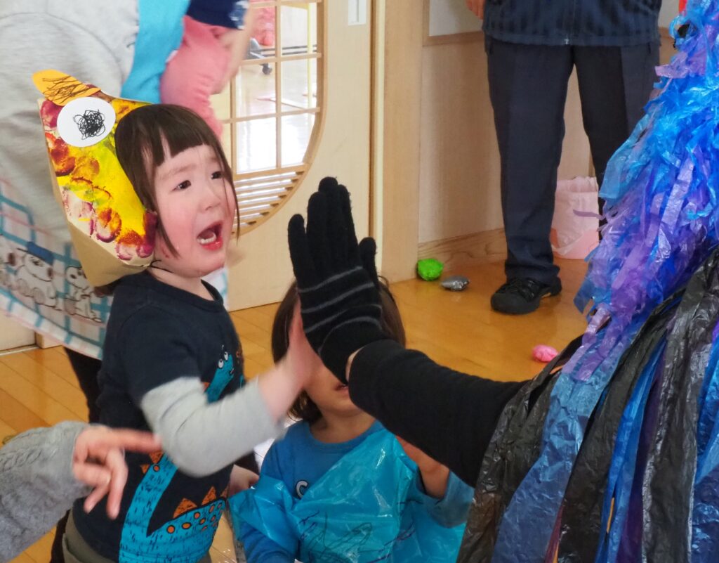節分で豆まきを行いました。鬼が現れると、勇敢に立ち向かっていく子、不安そうに保育者の陰に隠れる子と様々でしたが、最後は鬼とタッチしてお菓子をもらい満足そうにする姿が見られました。今年も優しい鬼で、子どもたちも退治しやすかったようです。自分の中の悪い鬼を追い出して福を招き入れ、今年1年間の無病息災を願う行事が無事終わりました。