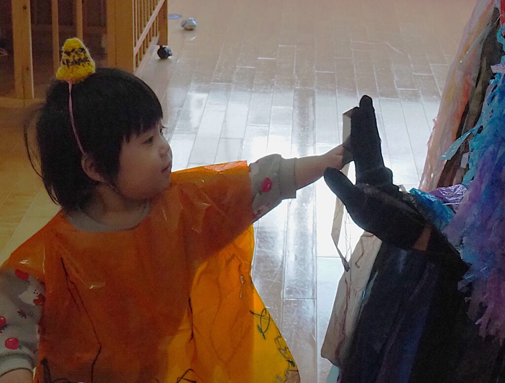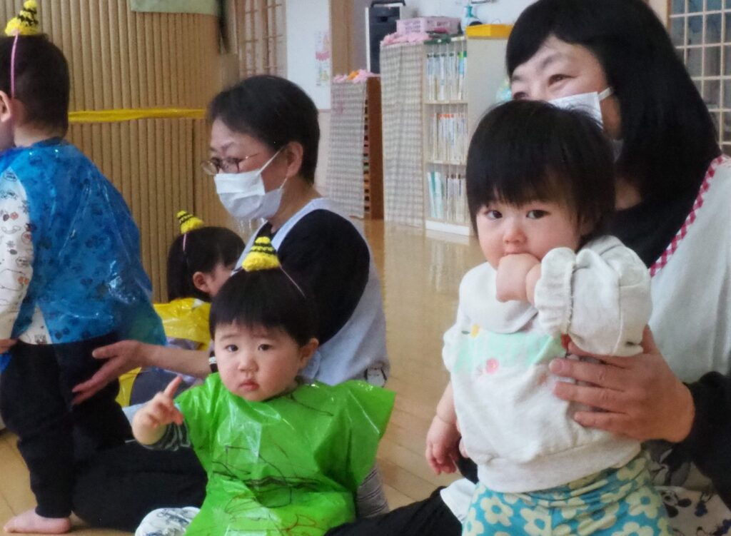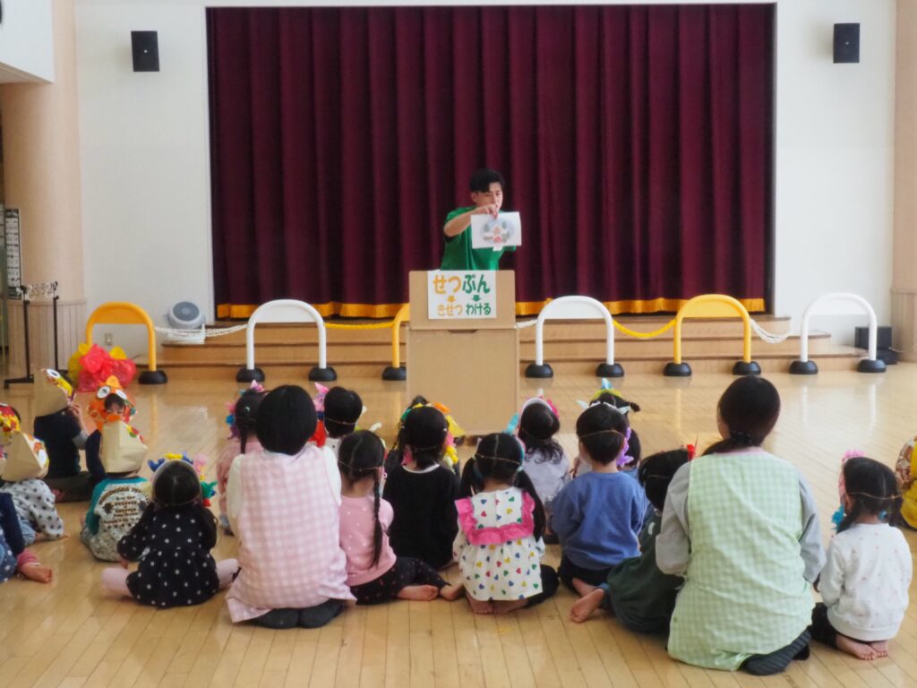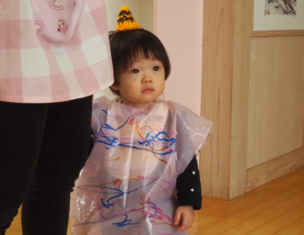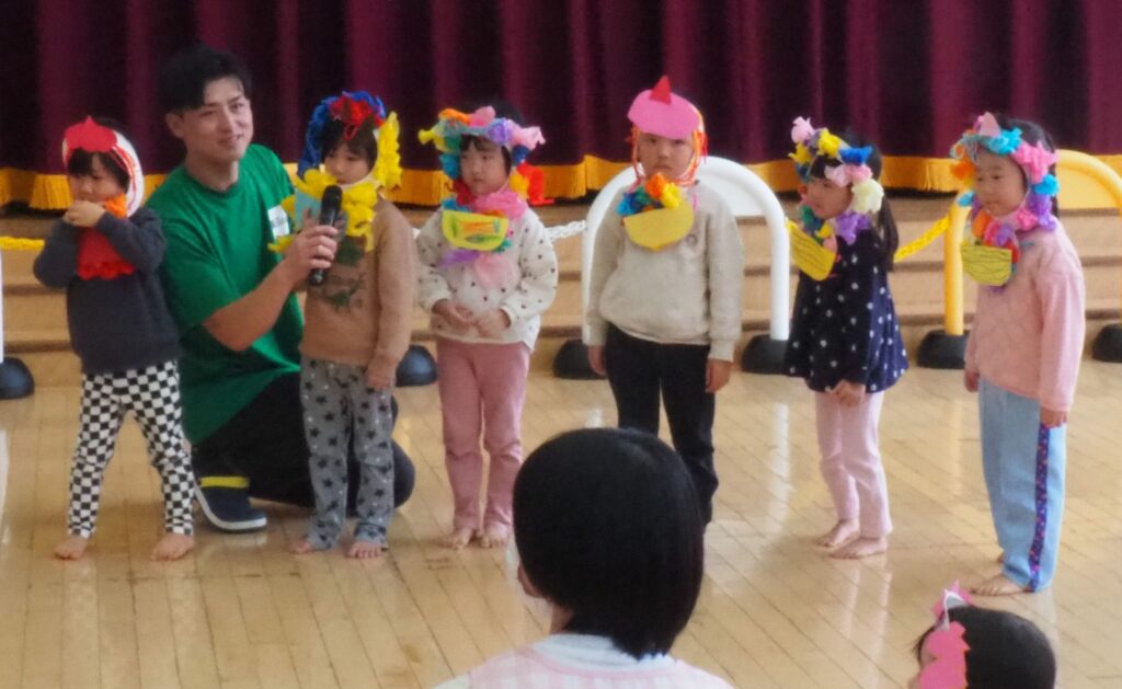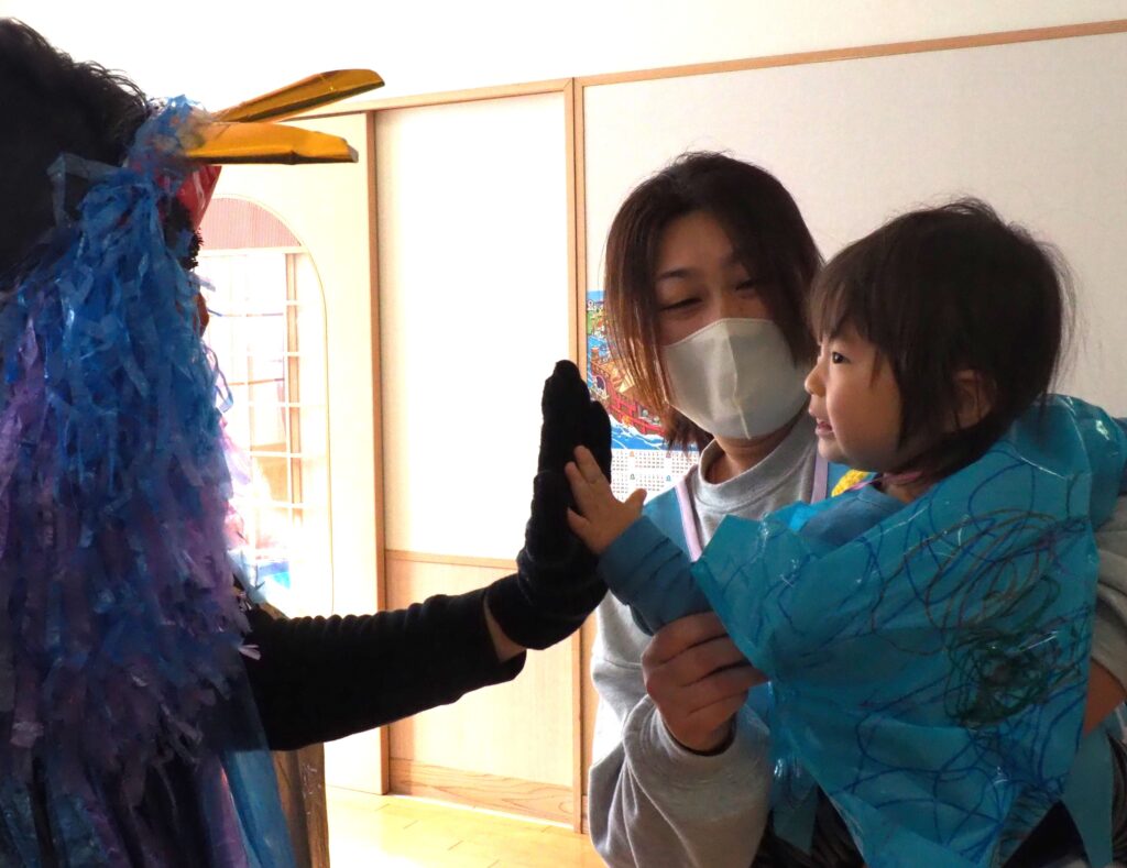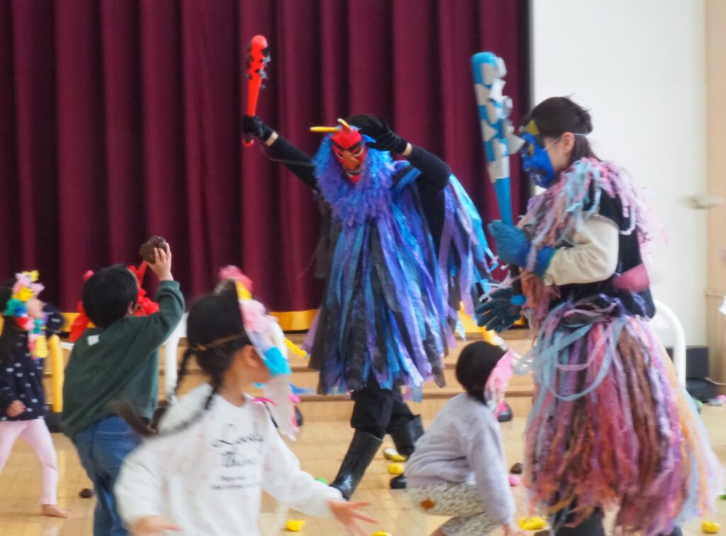 節分で豆まきを行いました。鬼が現れると、勇敢に立ち向かっていく子、不安そうに保育者の陰に隠れる子と様々でしたが、最後は鬼とタッチしてお菓子をもらい満足そうにする姿が見られました。今年も優しい鬼で、子どもたちも退治しやすかったようです。自分の中の悪い鬼を追い出して福を招き入れ、今年1年間の無病息災を願う行事が無事終わりました。